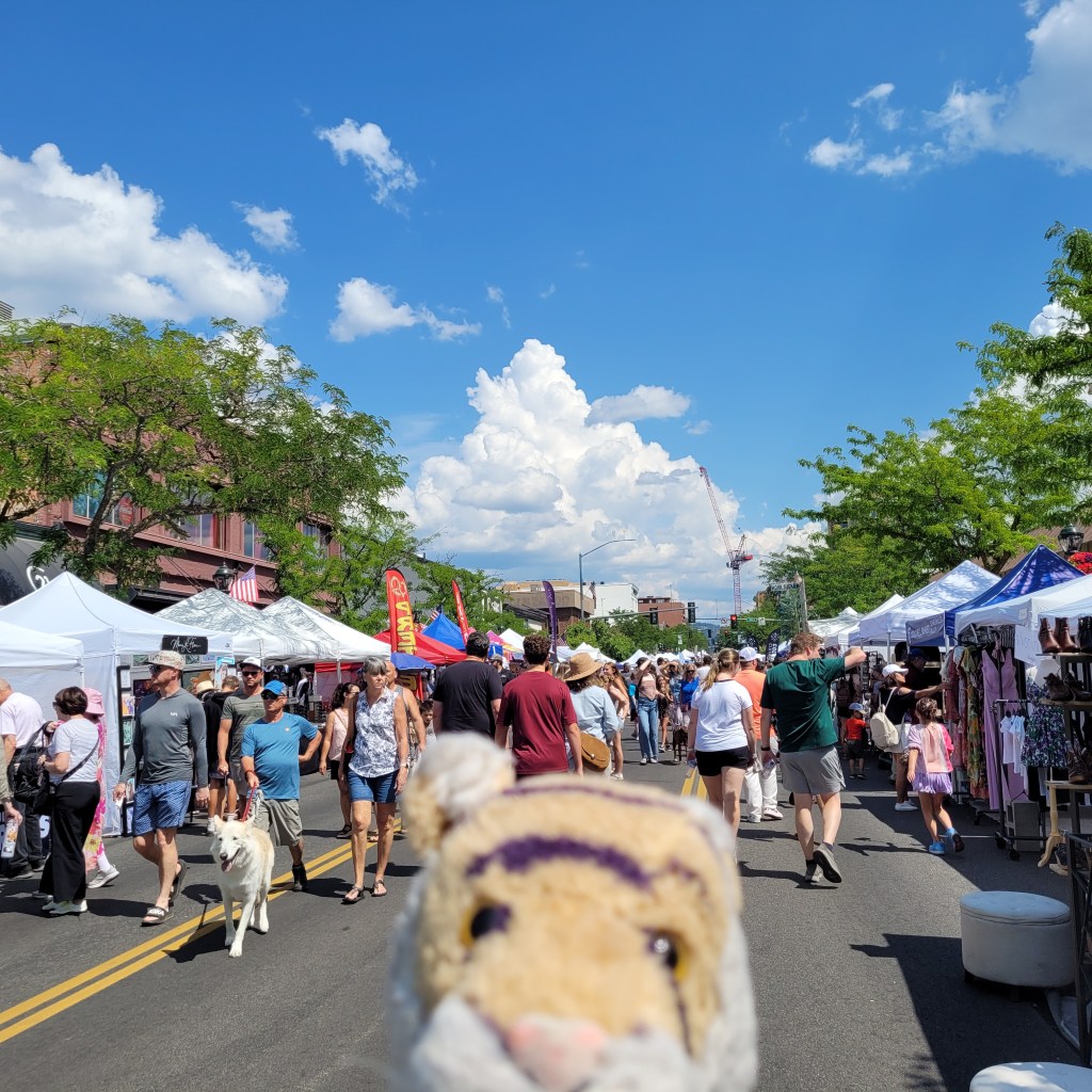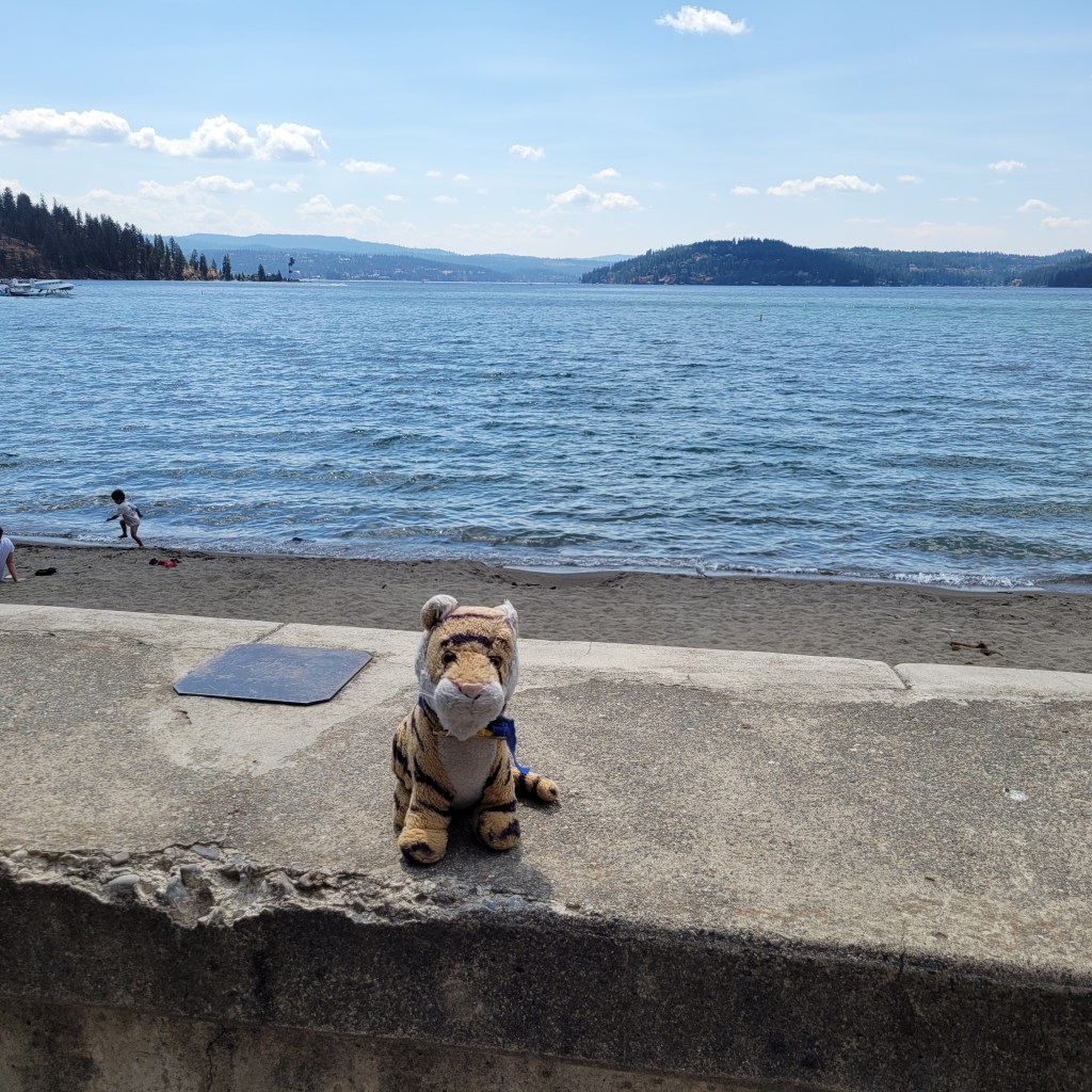 We went to an Art Festival in Coeur d’Alene and walked along the street but did not see any art it was all the vendors with stores who had put out tents to sell their stuff. The city of Coeur d’Alene is named after the Native American people from this area and it means Heart of the Awl. Awl not Owl.Then we found out we were at the street fair and needed to walk to a park where the art festival was. It was a very scenic walk along the lake! I wanted to play on the beach and jump in the water but mom said Not Now. I guess that is better than No.It was a super nice park with super green grass to walk on which is much nicer than hot asphalt. The best part was lunch from Island Noodles food truck and mom was happy too because they had a vegan option with lots of vegies and even though I am a Tiger a Carnivore it was delicious!This was a second best thing a GIANT sand castle!!! I would have REALLY liked to play on it but mom said Definitely Not.