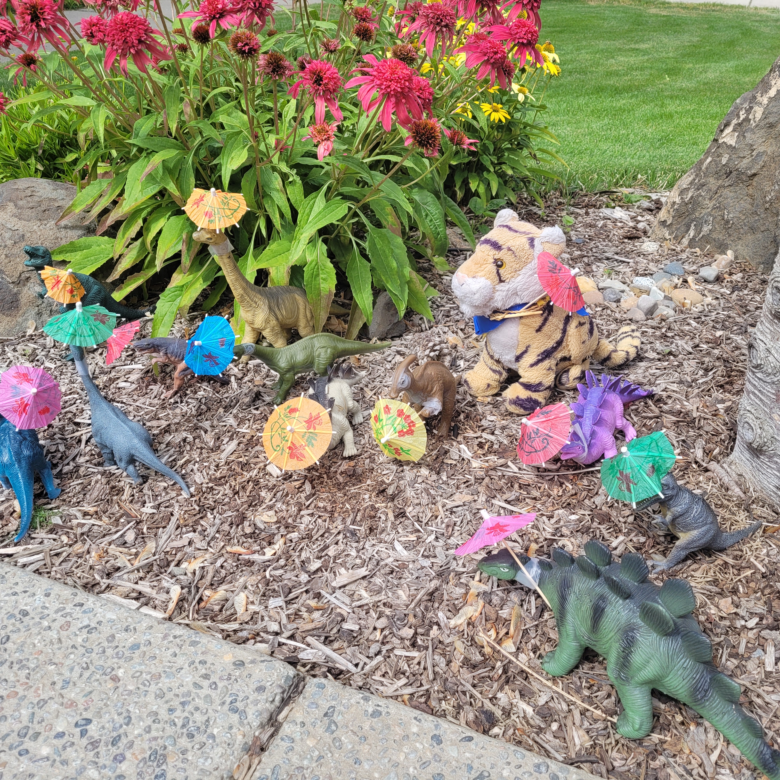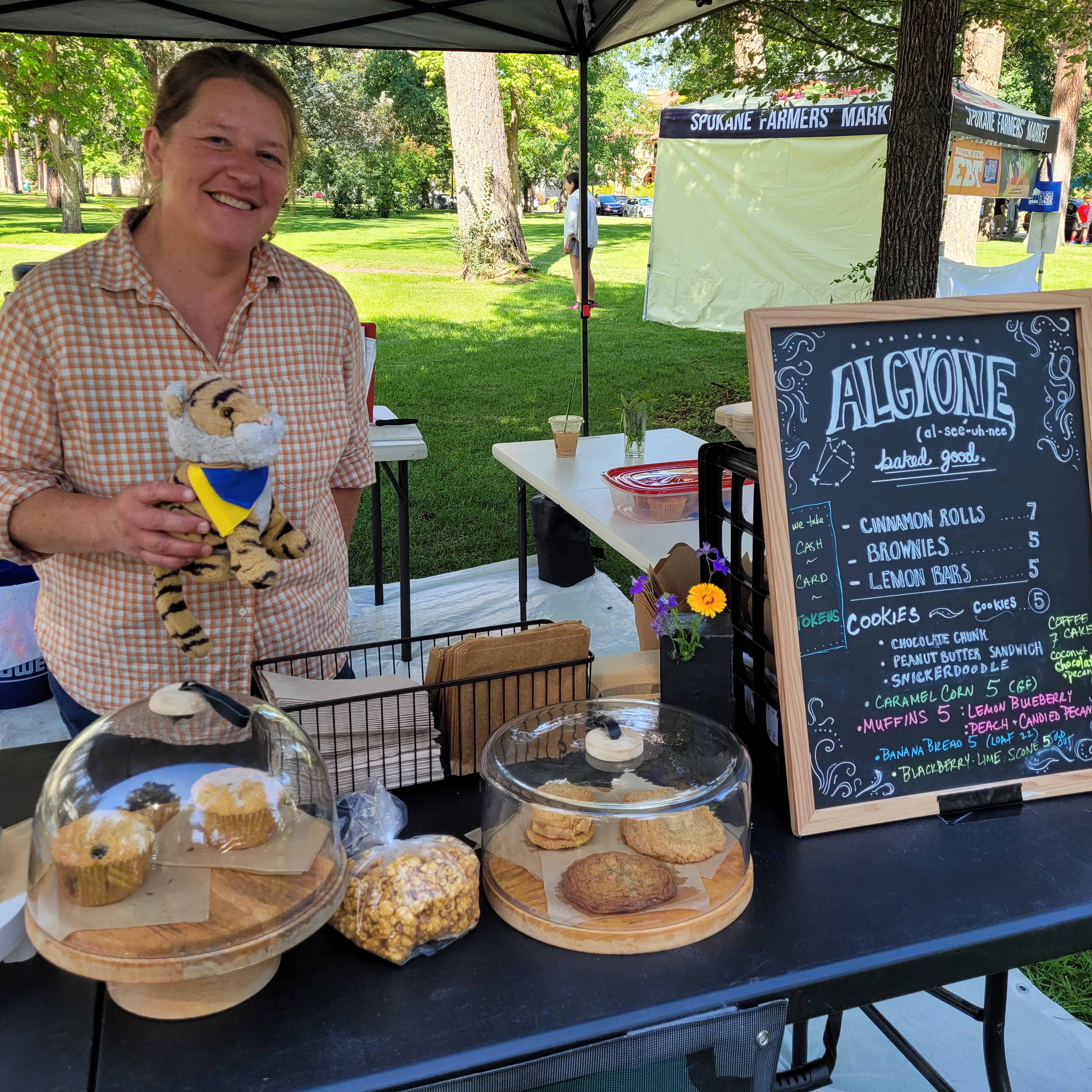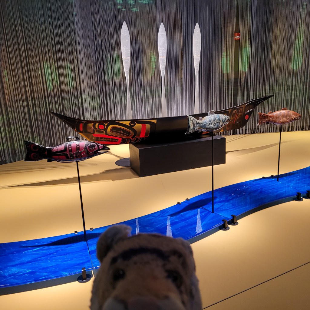 It has been very hot lately and even the dinosars who like it hot wanted some relief so we got them umbrellas.We went to the Farmer’s Market! This is me with Jodi the owner and baker of Alcyone Baked Goods. Jodi is super gorgeous and is super nice! We got some banana bread which was to die for!!! We highly recommend!We went to the Museum of Arts and Culture which has an exhibit of Preston Singletary’s work called Raven and the Box of Daylight. Mr. Singletary is a Native American artist and we have seen his work in other art museums as well. It is AMAZING what he can do with glass! I almost did not post this photo because it does not do justice to the work; the canoe, the paddles, the fish and the river are all made of glass. How do you make a canoe out of glass??!! There are many versions of the story of Raven and the Box of Daylight and the exhibit was really wonderful.Our friends Heather and Mitch had an ice cream party – Yayyyy! Tigers LOVE ice cream! Me and mom made mango-coconut bread to take to the party. It was nowhere near as good as the banana bread we got from Jodi but people seemed to like it. Almost anything goes good with ice cream!