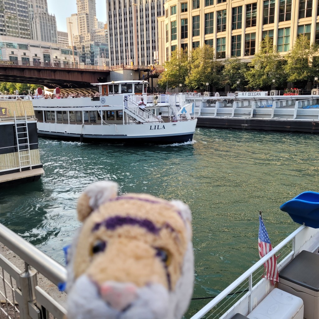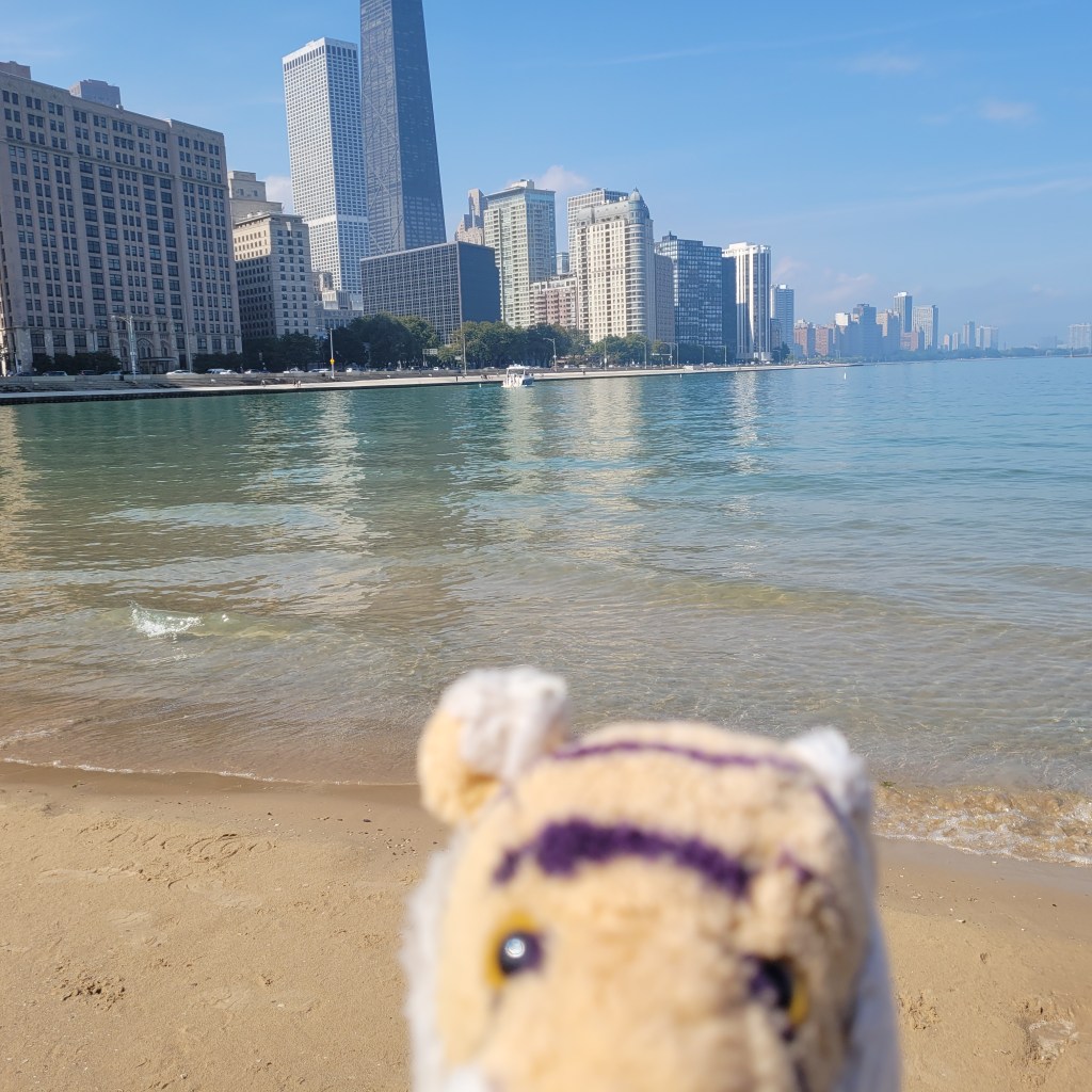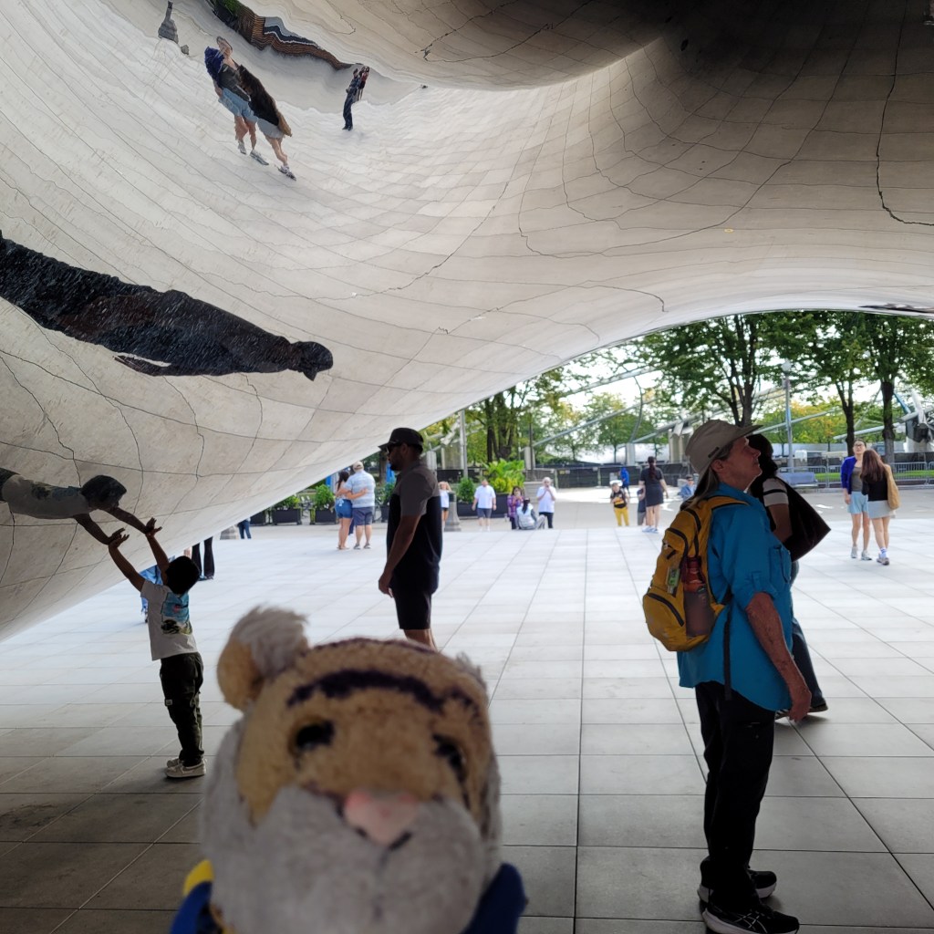 We ate at a lot of great restaurants in Chicago! At one called Cupitol they had a bulletin board with photos of people’s pups that came with them to the restaurant! I am a Tiger I was not eligible for a photo here, drat. They should have another bulletin board for TIGERS!One day we went to a beach! This is the Ohio Street Beach and it is right downtown. Mom and Auntie Darcy wanted to go swimming but did not have swimsuits with them so they went swimming in their underwear!!! Ha ha ha that was so funny! They decided that undies were not much different than bikinis and there were not many people at the beach anyway. There were only about 10,000 people who could see them from the office buildings and condos that surround the beach! Here is a picture of me at the beach. They did not want a picture posted of them in their undies!I wanted to tell you more about The Bean! One day when we were visiting mom looked around at the people from all over the world who came to see this great sculpture and said that it would be fun if we could get everyone to hold hands and make a big circle around The Bean. It would mean that people would have to be willing to hold hands with strangers, and to understand the goal just by looking. A few days later we tried it!It was so awesome! Auntie Darcy recruited a few people to get it started, and then people understood almost immediately what was happening and joined in! It only took a couple of minutes and we had a complete ring! What was extra special is that there were some men there making a video and they got it on film! Here is the link to the video! https://www.youtube.com/shorts/pSxG-P8EGZw A little later on Auntie Darcy was talking to a security guard who mentioned that over their security radios they had heard about a gathering, then a disturbance at The Bean! Ha ha ha that was us making a disturbance by holding hands! Between swimming in underwear and holding hands with strangers it is lucky we did not get into any trouble with security while we visited Chicago!