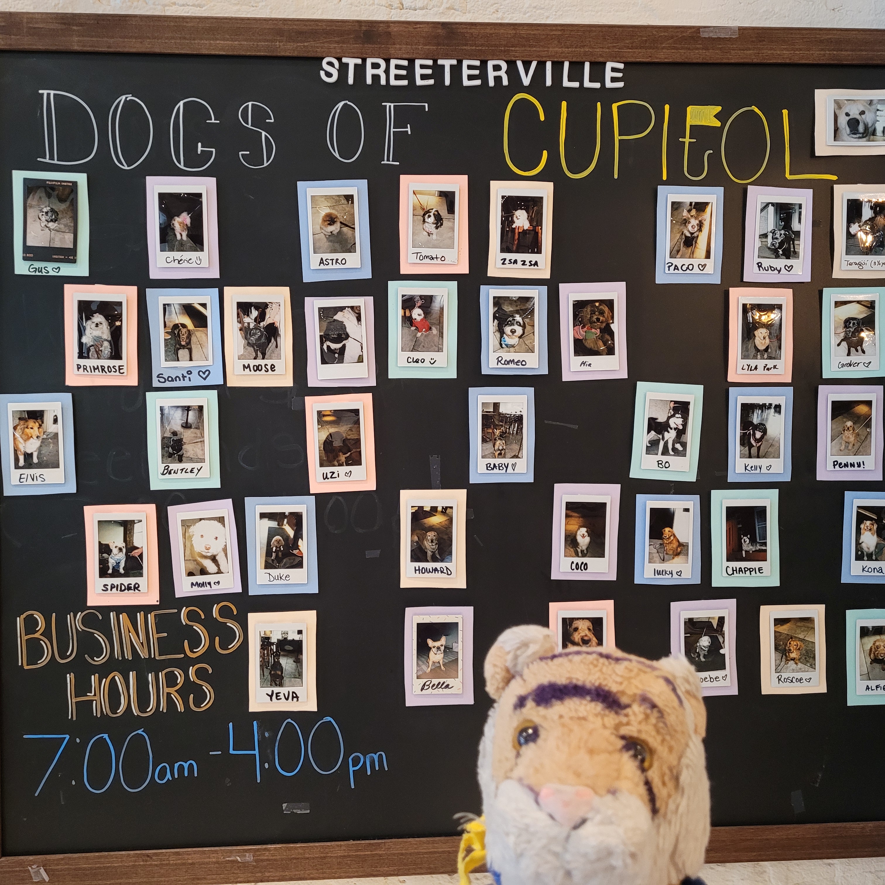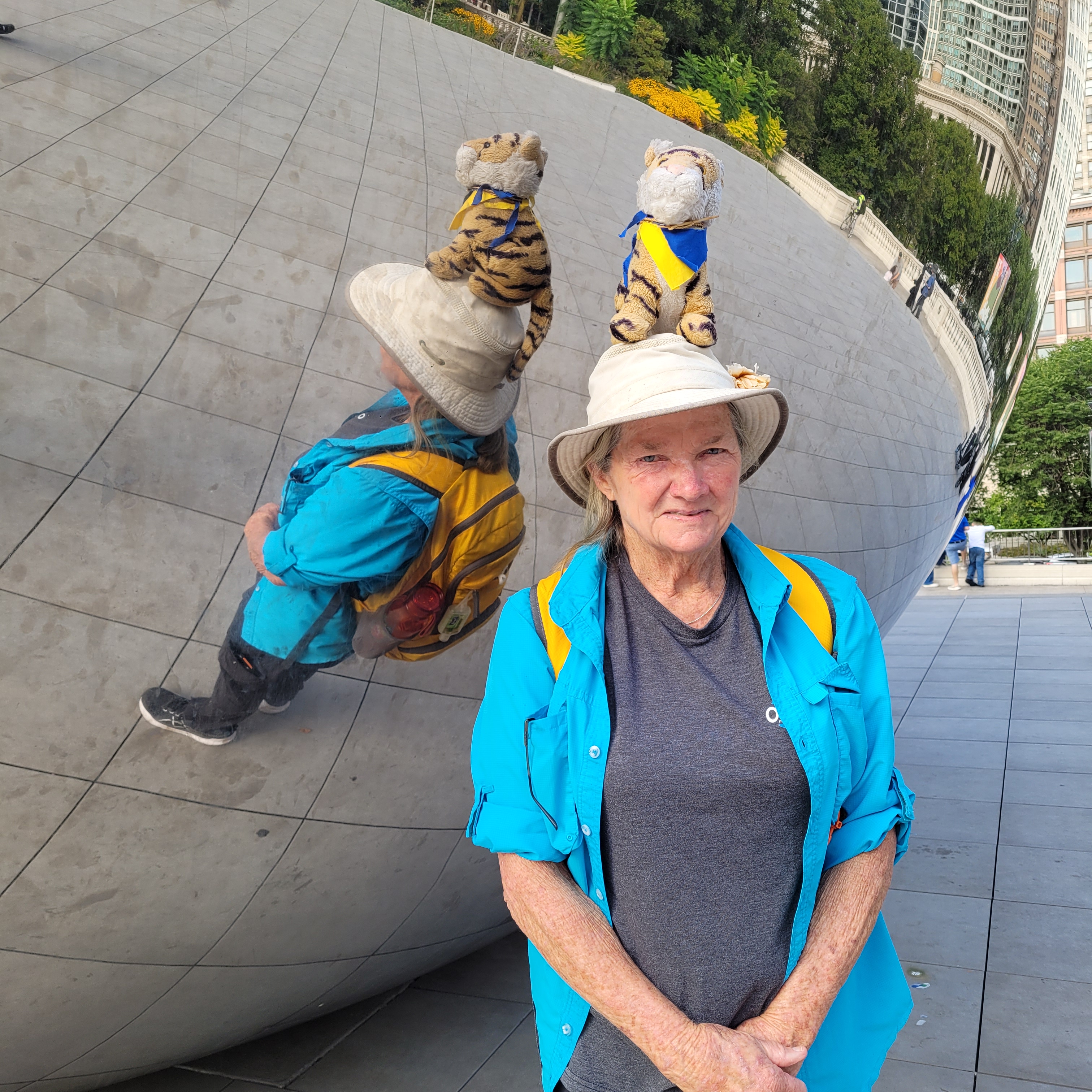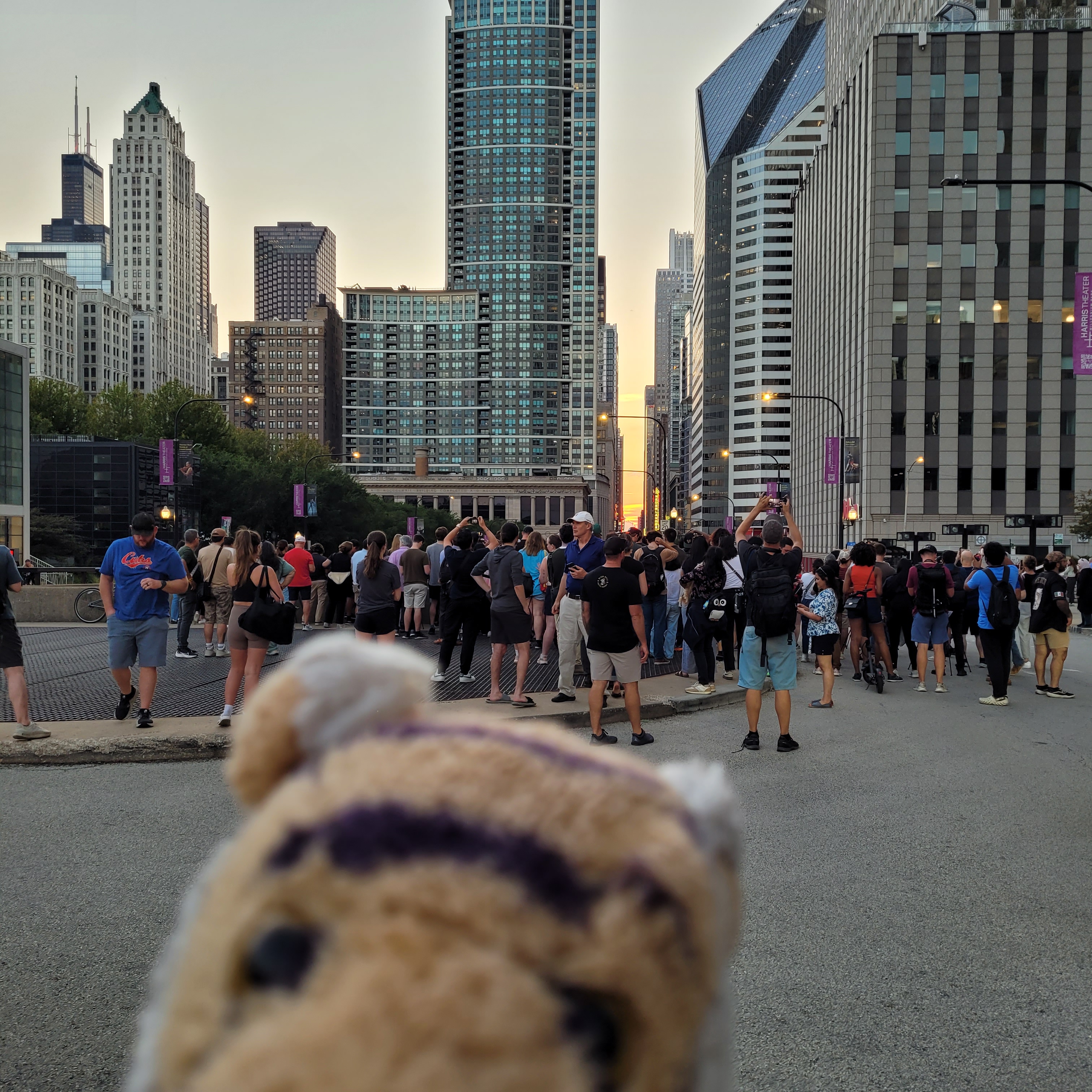 We ate at a lot of great restaurants in Chicago! At one called Cupitol they had a bulletin board with photos of people’s pups that came with them to the restaurant! I am a Tiger I was not eligible for a photo here, drat. They should have another bulletin board for TIGERS!One day we went to a beach! This is the Ohio Street Beach and it is right downtown. Mom and Auntie Darcy wanted to go swimming but did not have swimsuits with them so they went swimming in their underwear!!! Ha ha ha that was so funny! They decided that undies were not much different than bikinis and there were not many people at the beach anyway. There were only about 10,000 people who could see them from the office buildings and condos that surround the beach! Here is a picture of me at the beach. They did not want a picture posted of them in their undies!I wanted to tell you more about The Bean! One day when we were visiting mom looked around at the people from all over the world who came to see this great sculpture and said that it would be fun if we could get everyone to hold hands and make a big circle around The Bean. It would mean that people would have to be willing to hold hands with strangers, and to understand the goal just by looking. A few days later we tried it!It was so awesome! Auntie Darcy recruited a few people to get it started, and then people understood almost immediately what was happening and joined in! It only took a couple of minutes and we had a complete ring! What was extra special is that there were some men there making a video and they got it on film! Here is the link to the video! https://www.youtube.com/shorts/pSxG-P8EGZw A little later on Auntie Darcy was talking to a security guard who mentioned that over their security radios they had heard about a gathering, then a disturbance at The Bean! Ha ha ha that was us making a disturbance by holding hands! Between swimming in underwear and holding hands with strangers it is lucky we did not get into any trouble with security while we visited Chicago!