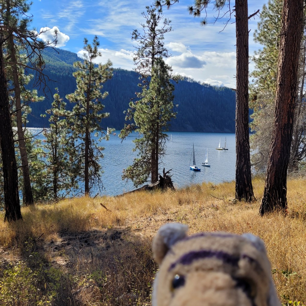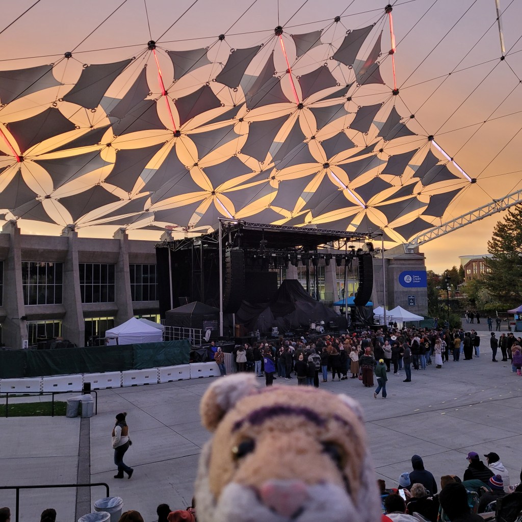 We went hiking at Lake Pend Oreille!!! It was so gorgeous and a warm sunny beautiful day!The lake was king of cold but mom decided it would be okay to go for a quick dip in the water. But she did not have her swim suit (again), But she found some good spots where it was secluded and she could swim in her undies (again). But then at the last minute she remembered that she had sutures in her arm and was not supposed to immerse her arm in water. Hmmm, it would not be good if the incision got infected and get scolded by her doctor. So the lake swim plan got cancelled.OMG we went to a Lord Huron concert with our good friend Margo!!!!! Here I am at the Spokane Pavilion before the concert started with the sunset showing beautiful colors while people find a place to sit on the grass or stand near the stage.It was an amazing show! and the band was really great – very impressive musicians! There were 4 guitar players and a bass and it was a lot of sound! They had about a dozen guitars and would switch instruments for different songs and I could not tell the difference but I am sure they knew what they were doing. I am just a small Tiger and do not know much about guitars. It was a great concert!