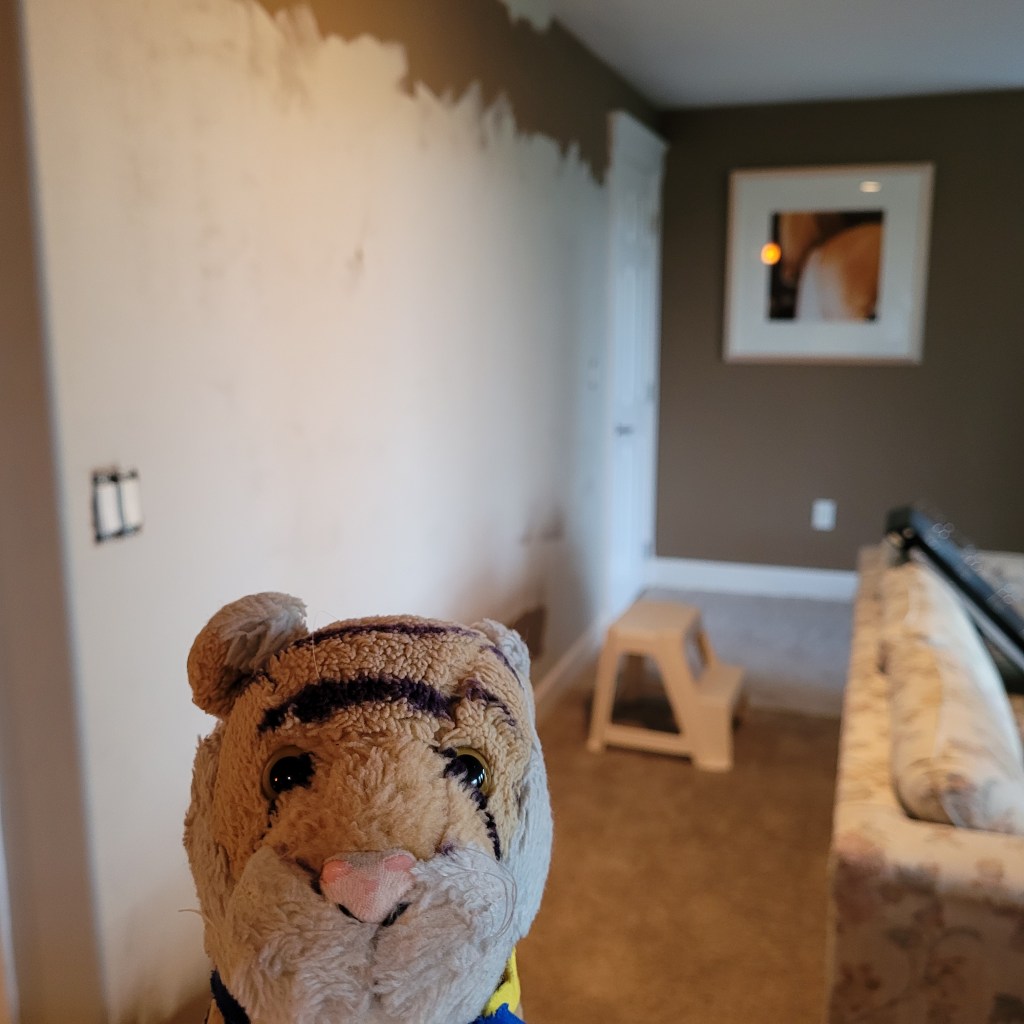 It has been a while since we posted anything! We have been Busy preparing for Winter and it has already snowed a few times, but then it warms up and melts. It has also been raining a lot and one of the gutters was not draining. So mom took apart the downspout part of the gutter piece by piece and finally climbed up on the ladder to remove the handful of leaves that were blocking the drain at the very top. Then the cold water trapped in the gutter poured out all over her HA HA HA that was so funny I wish I got picture of that but instead here is a photo of the downspout all put back together.Also we have been slowly painting the basement. It was a nice chocolatey-brown color but it made the rooms very dark. The previous owners left several cans of gray paint (each can a different gray) so we mix them together! Here is one wall in the process of being painted. The basement has lots of doors and doorways and windows and beams to paint around so it took a lot of weekends to get it done!Look at this hallway now! It used to be so dark that even with the light on it was dreary looking and not nice. It’s sooooo much better now! The rooms on the other floors look dingy in comparison so we may have to paint them next! Mom says maybe but let’s take a break from painting for a little while.
