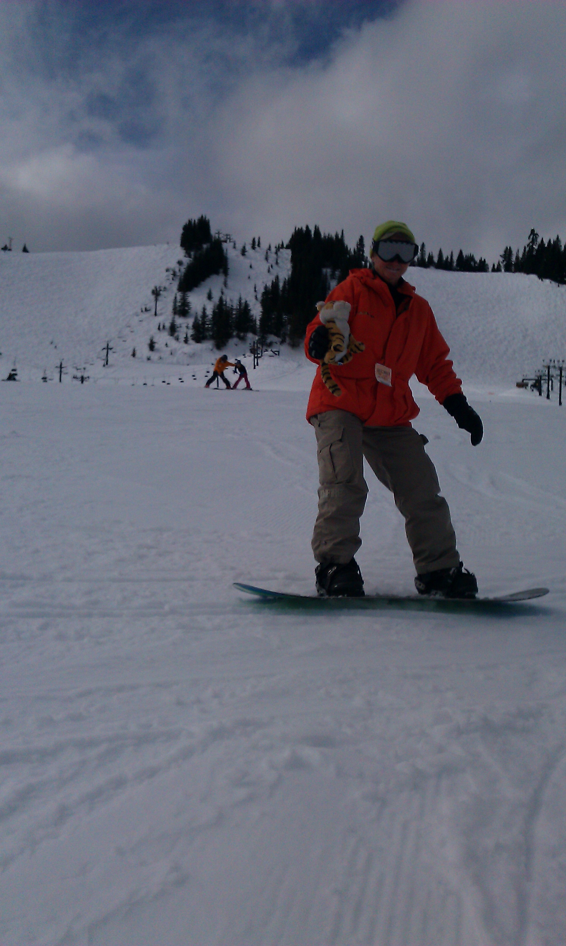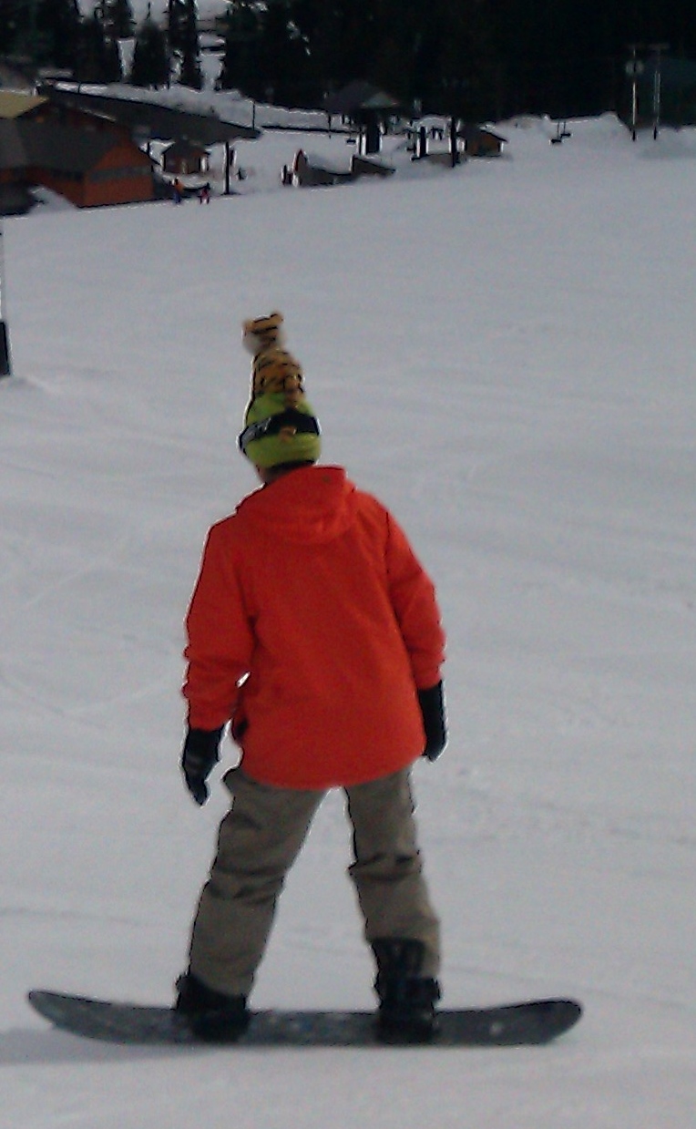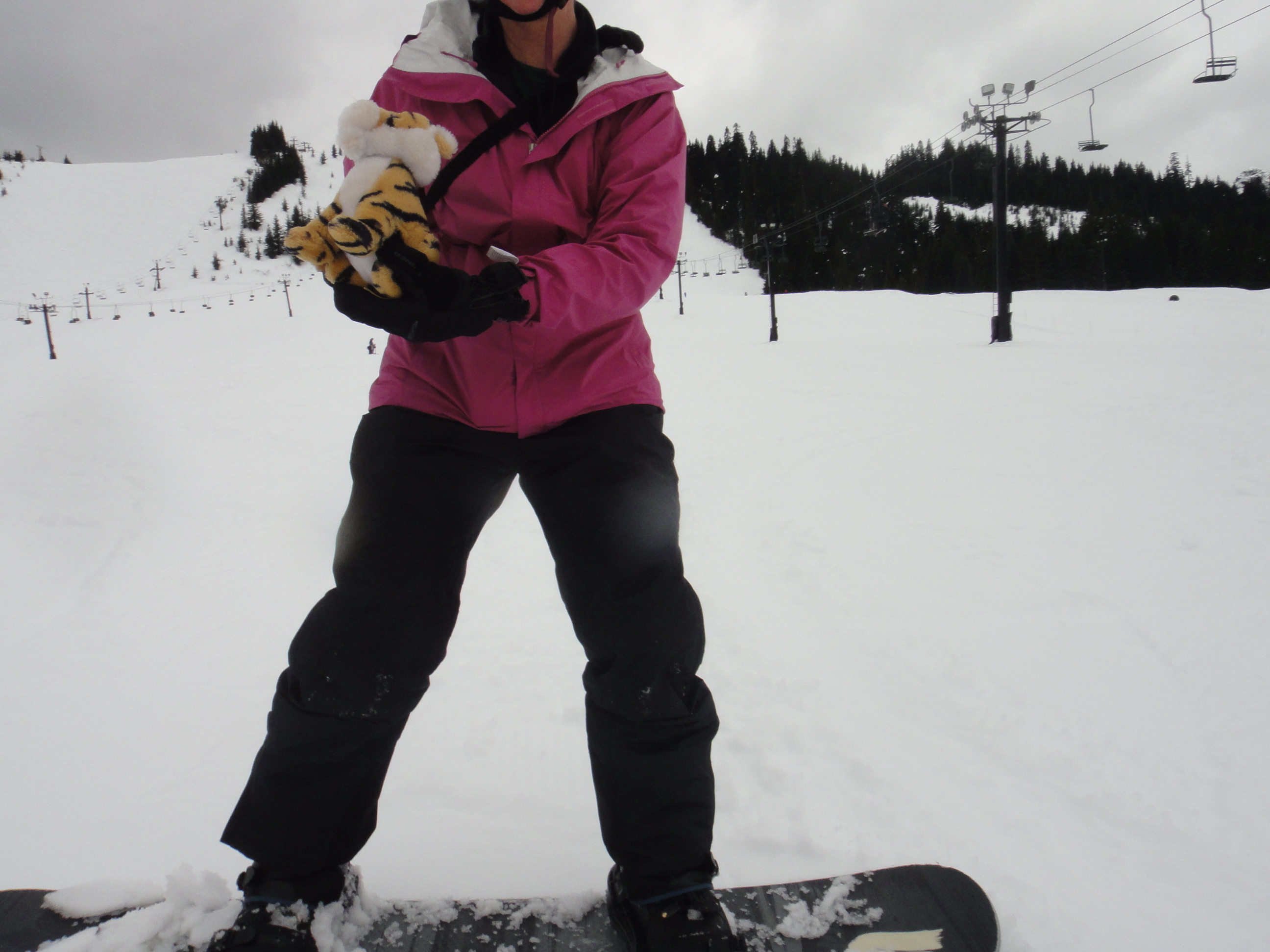 Whoo hooo! Riding with Auntie Darcy!!!! This is the way to snowboard! Free as a bird …. I mean tiger!