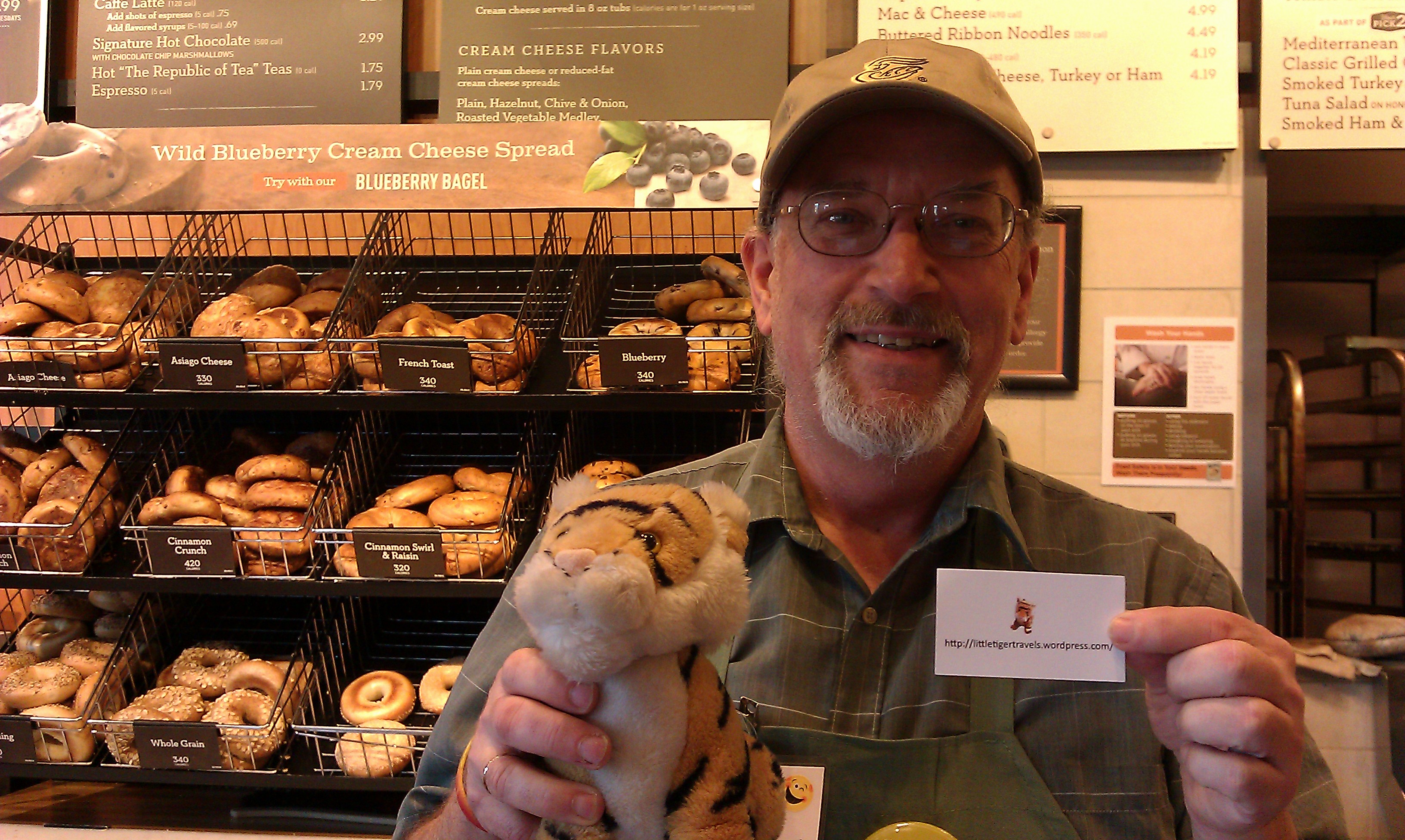 After that we went and bought bagels and this time Mom remembered to take a picture. This is the really nice man who got us our bagel order. He is holding up my business card that has the address to this website!