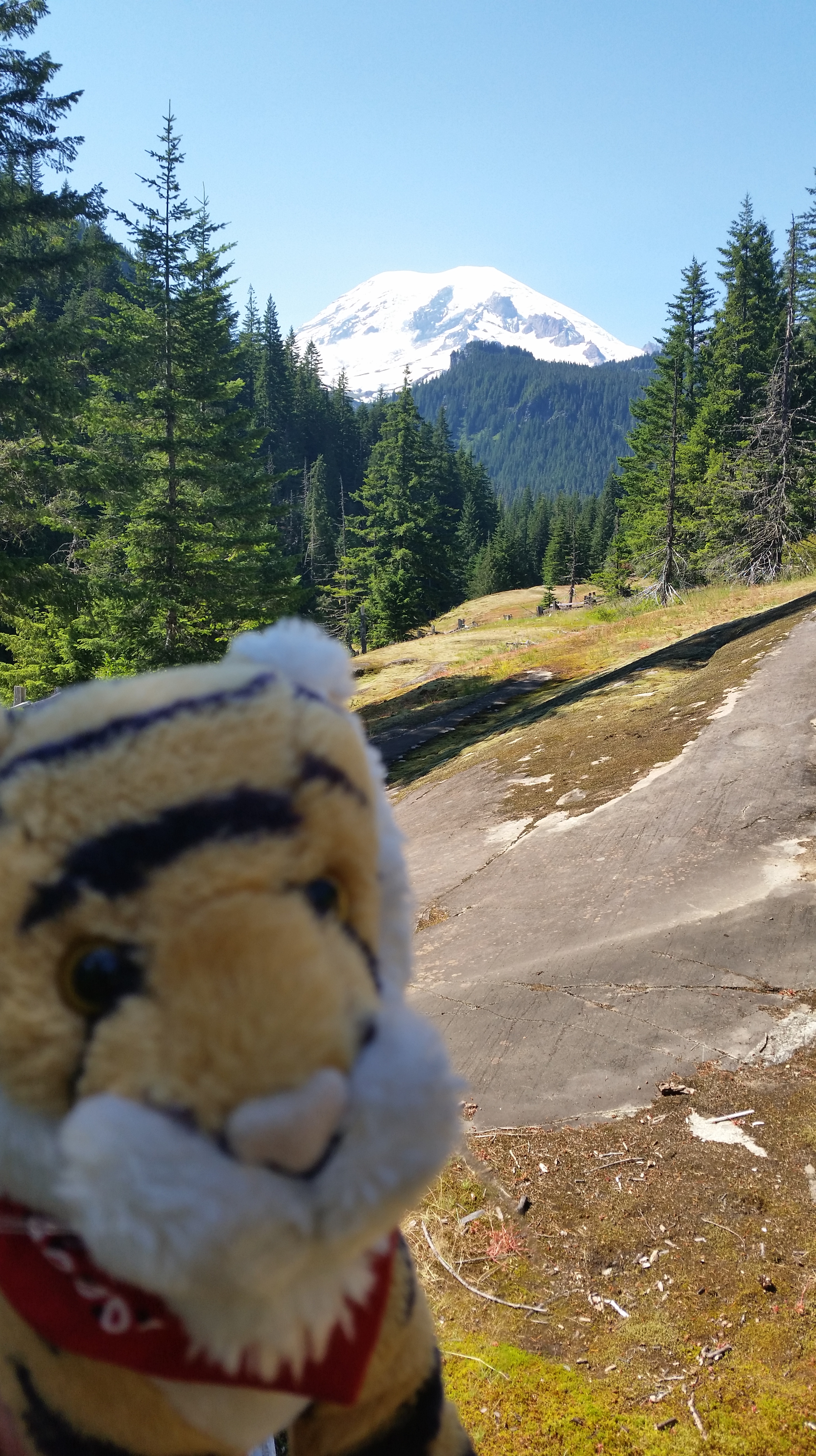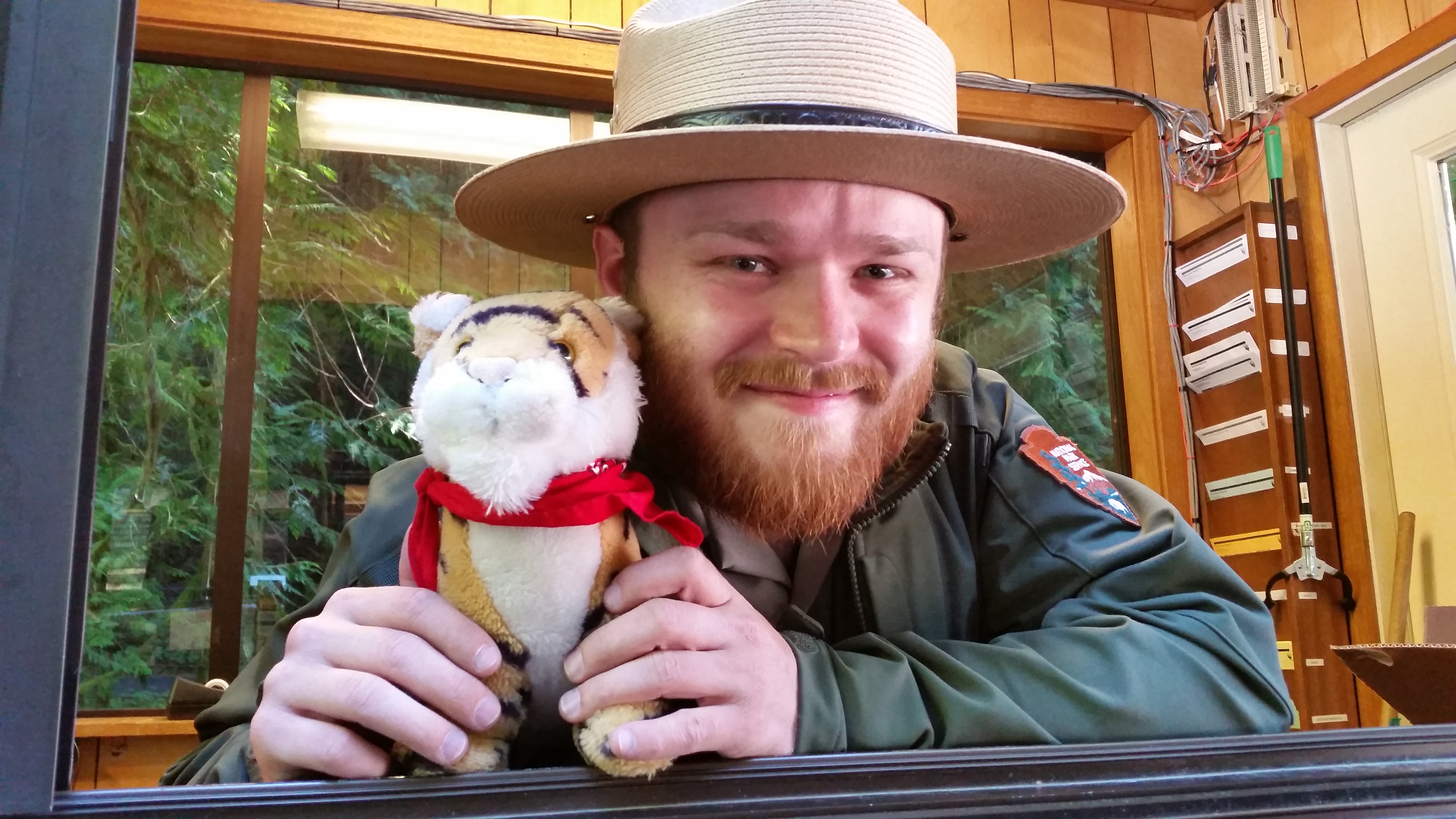 Today we went hiking at Mt. Rainier! Here we are entering the park, I am posing with the handsome park ranger at the entrance.