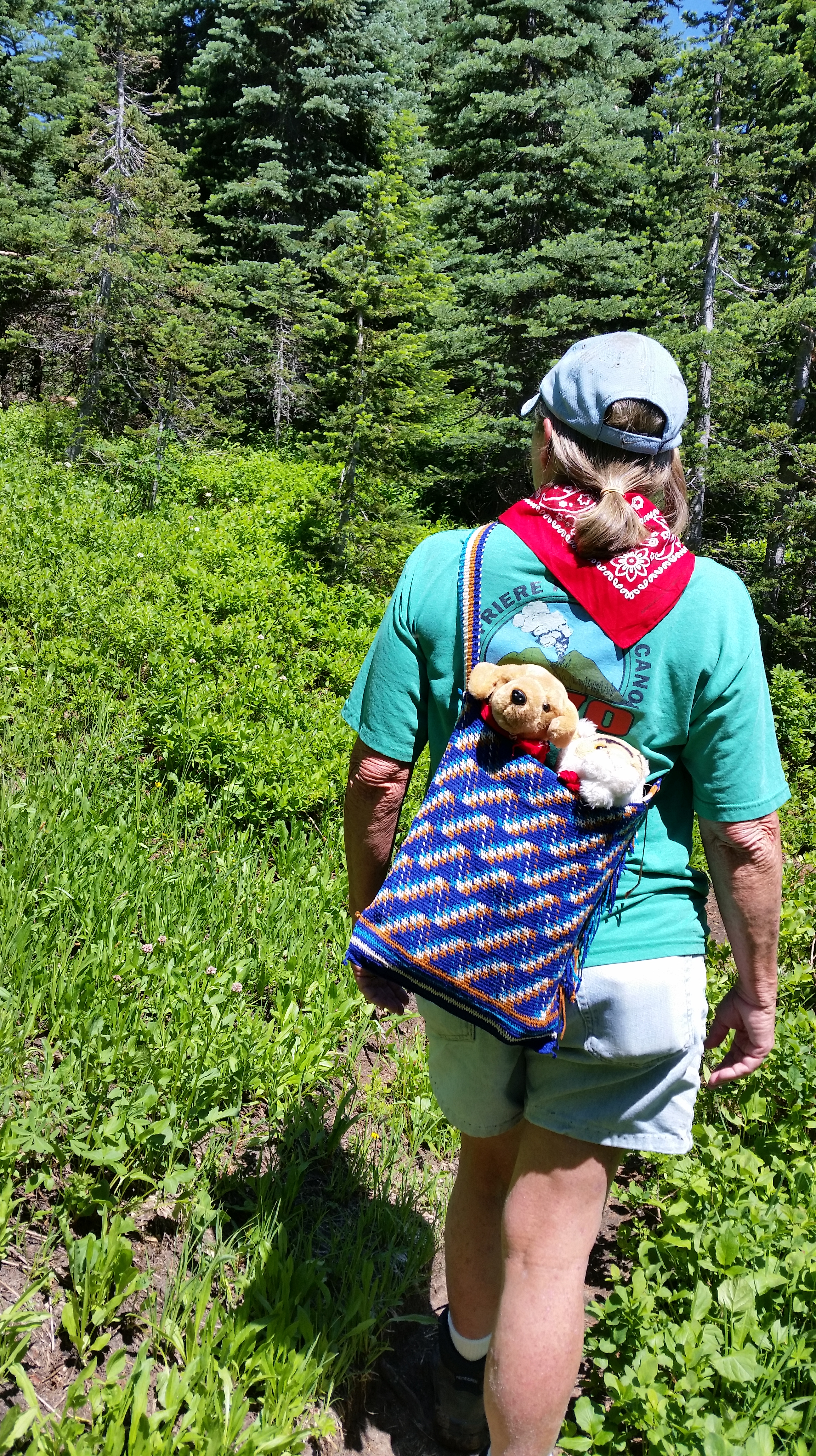 Here we are on the trail with Aunt Darcy riding in a new super duper satchel that Auntie Darcy brought for us. It was a gift to her from a scientist from Papua New Guinea it is really special and is perfect for us because both me and Dixie fit in it! Plus there is room for an extra shirt. And a snack.
