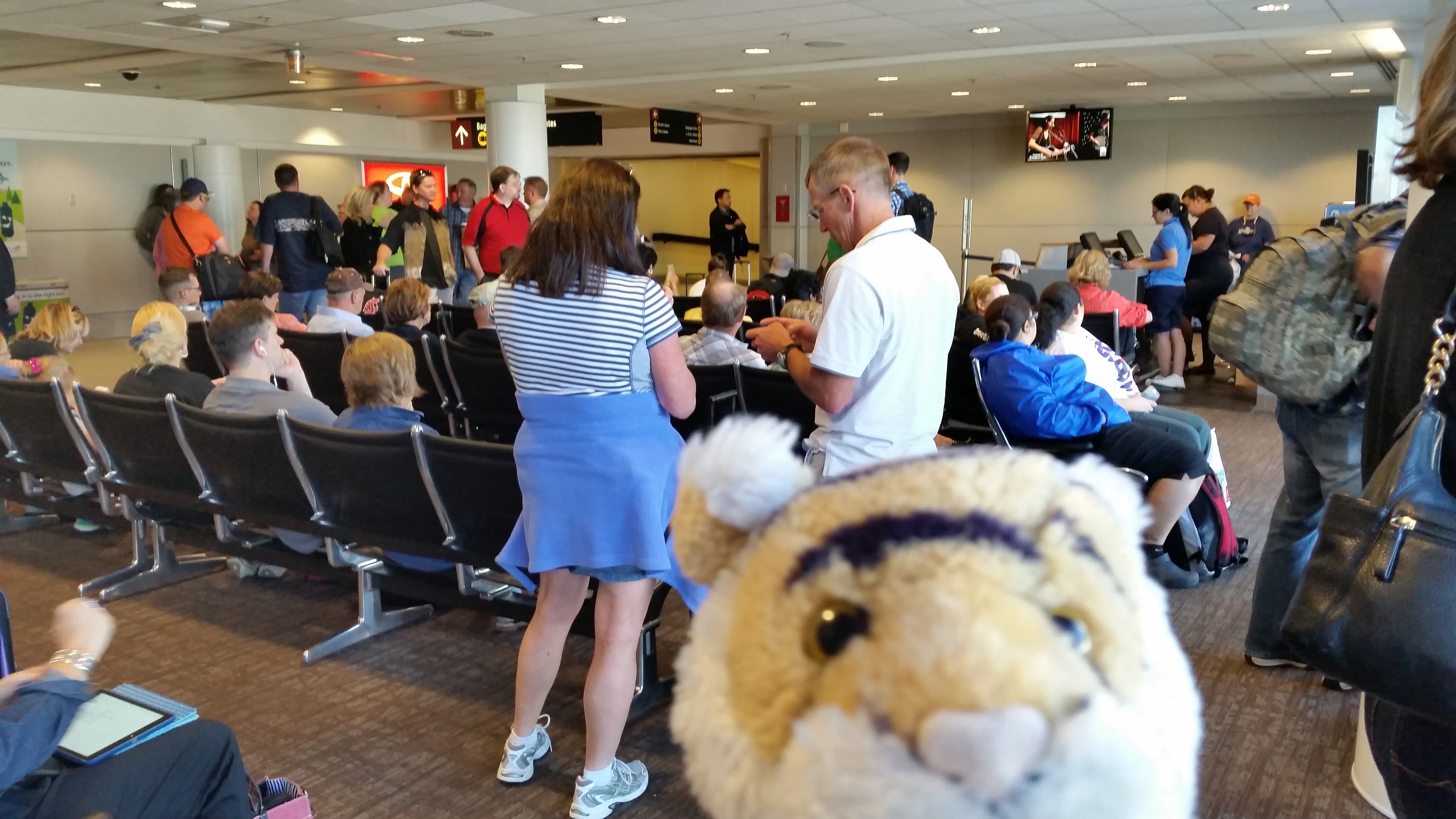 This is what you do at the airport. You stand around or sit and wait to get on the plane it is so exciting!!! Everyone wants to get on first!!!