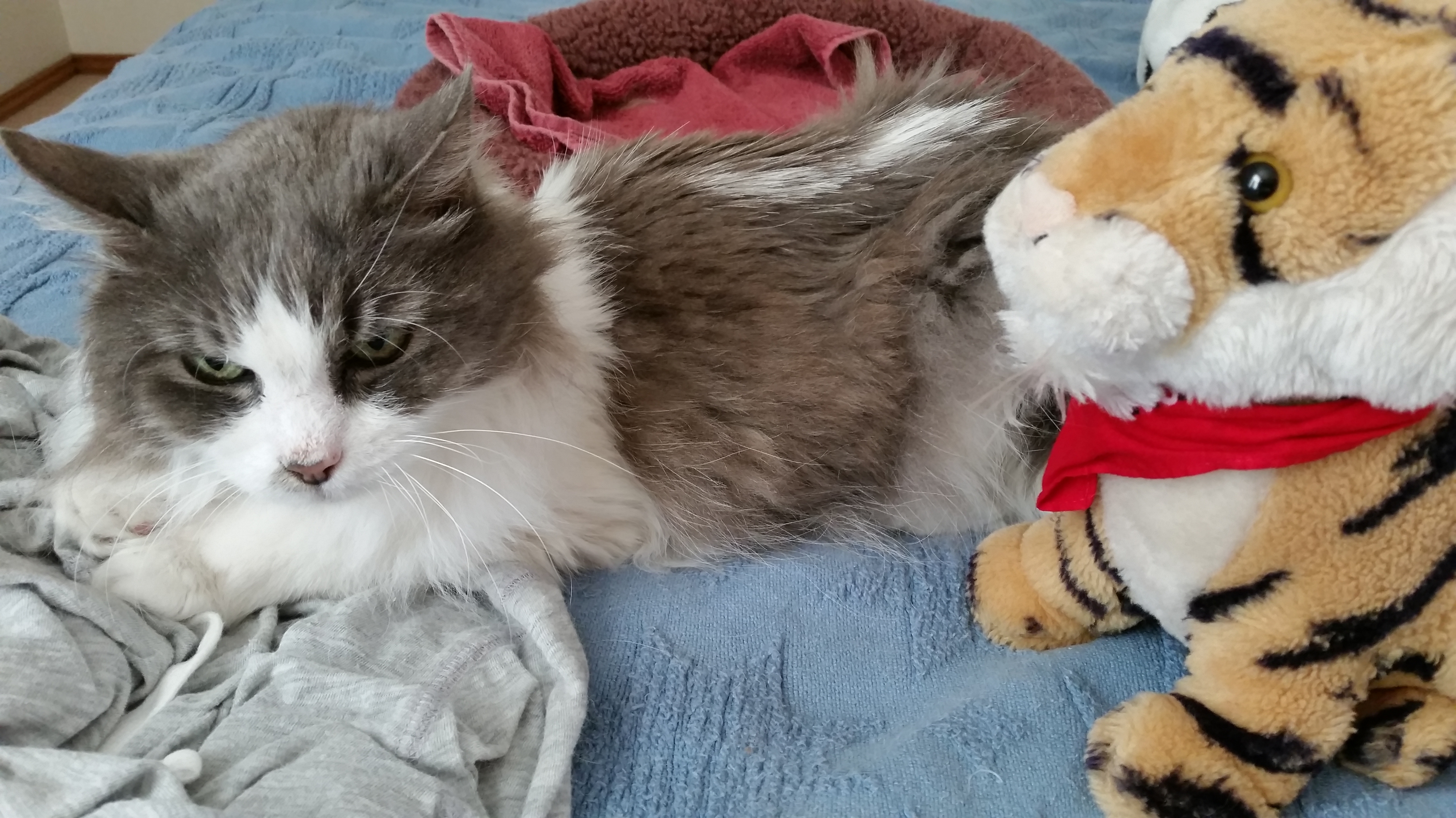 We have a houseguest! Dove is staying with us. Dove is a cat who belongs to one of Mom’s friends. We are cat-sitting yes we are we are good at taking care of kitty-cats! Dove is very sweet and beautiful.