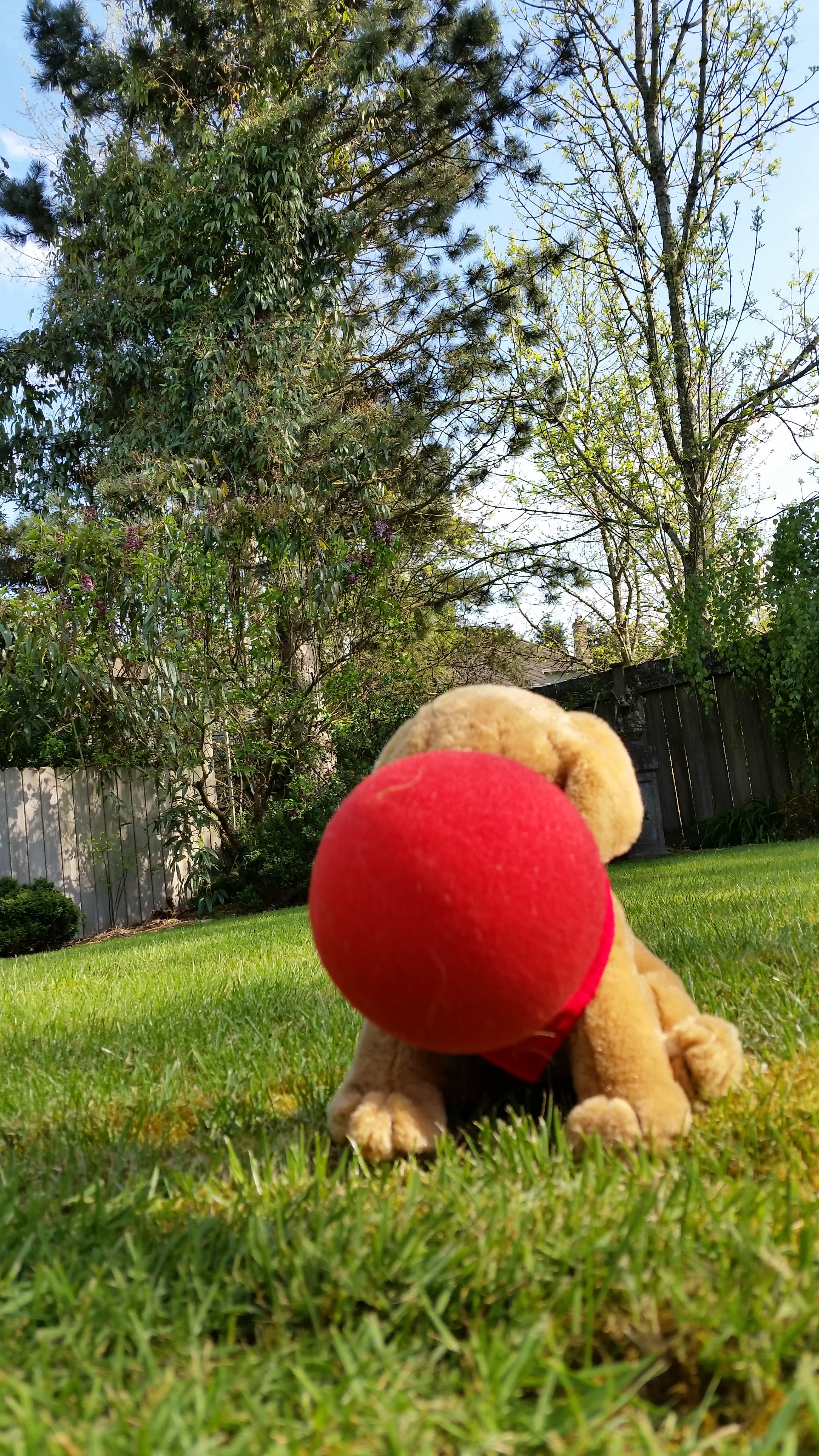 Here is me and Dixie playing with my favorite red ball in the yard. It is tricky getting the shot at just the right time.