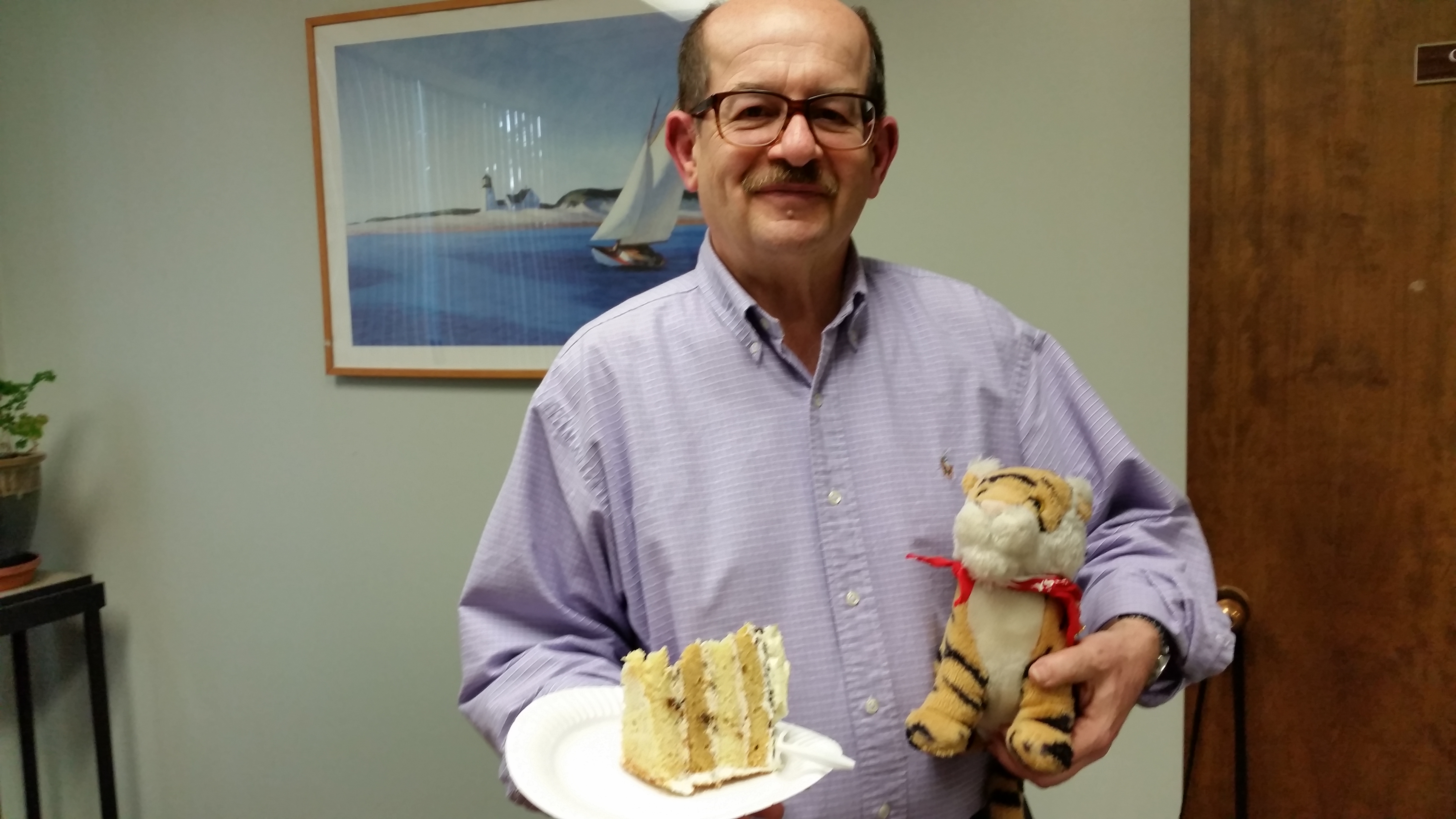 First of all I want to say Happy Birthday to Mom’s friend George at work. Yesterday he brought us some awesomely delicious cake to help celebrate! Mom said the cake was too pretty to eat but as soon as George left we scarfed it up.
