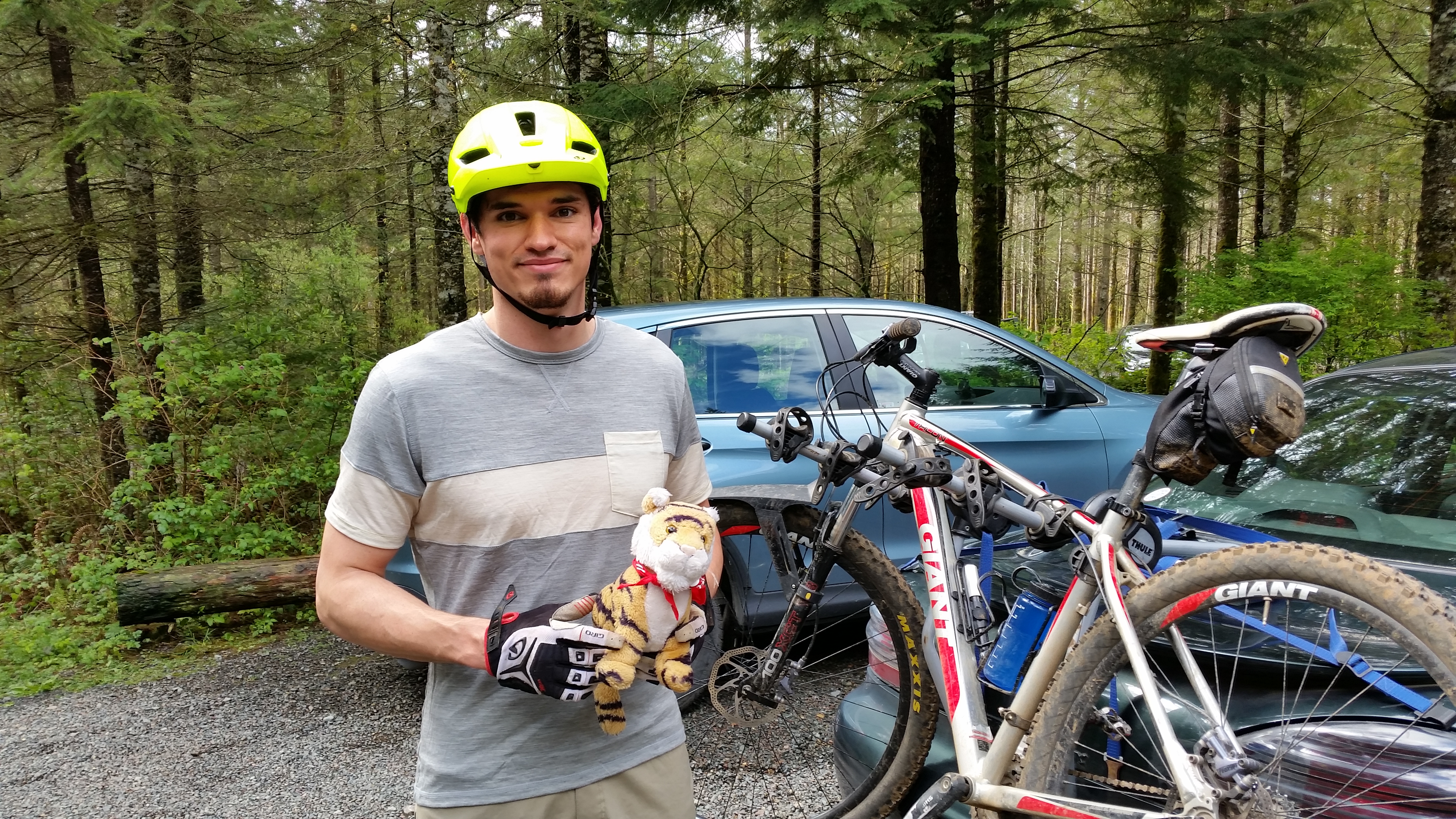 Today we went on a hike at TIGER Mountain! Tigers RULE! This is Neil who was getting ready to go for a bike ride and is very handsome. Mom is always chatting up the single men in the parking lot.