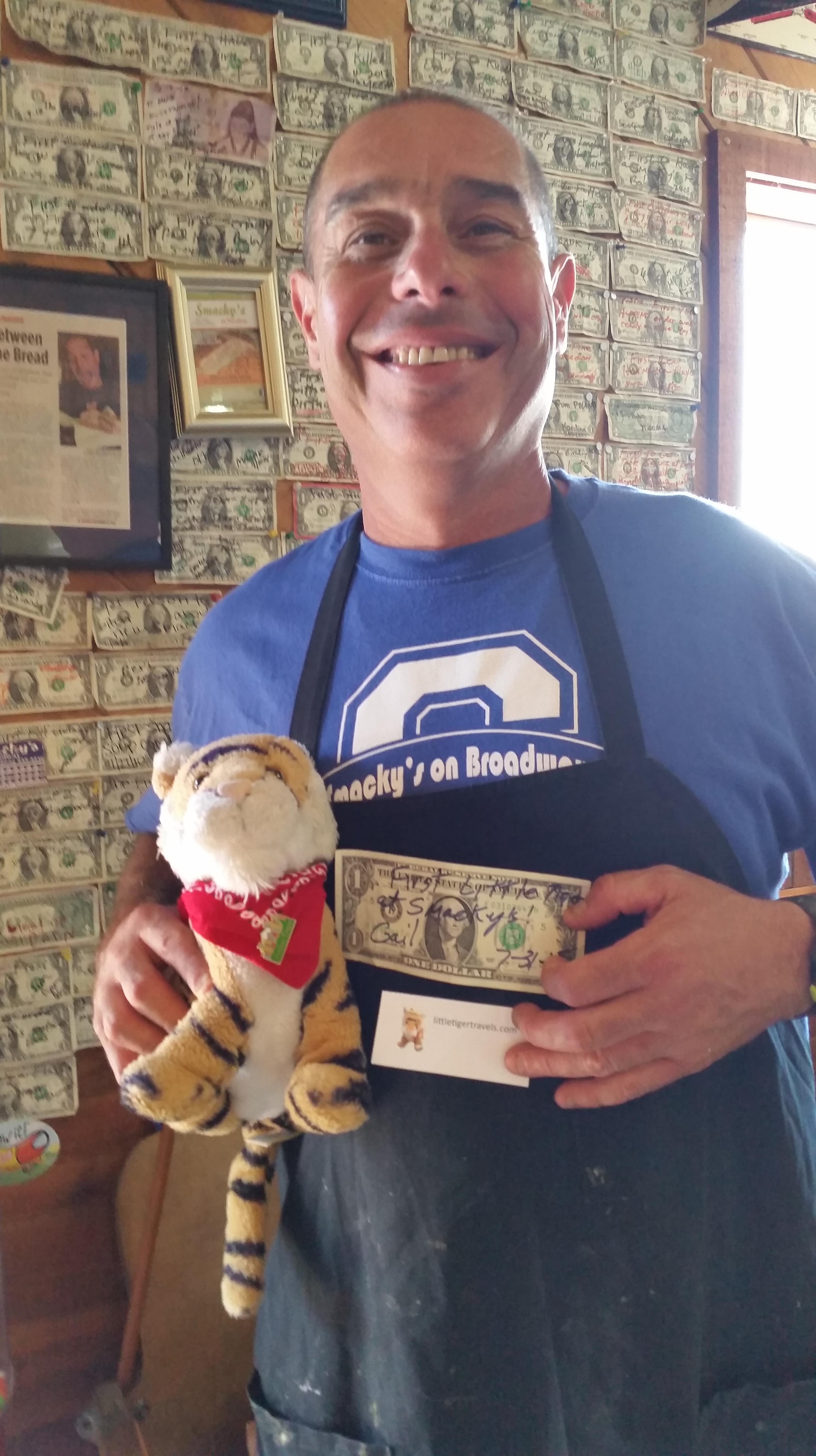 We stopped for lunch in Spokane!!!!  This is Mike at Smacky’s the best restaurant ever!  I LOVE restaurants and Mike was so handsome. Whenever something happens for the first time at Smacky’s they write about it on a dollar bill and post it to the wall.  GUESS WHAT!!!  This was the first time a Little Tiger was a restaurant guest so I got my own dollar bill posted on the wall with my story!!!
