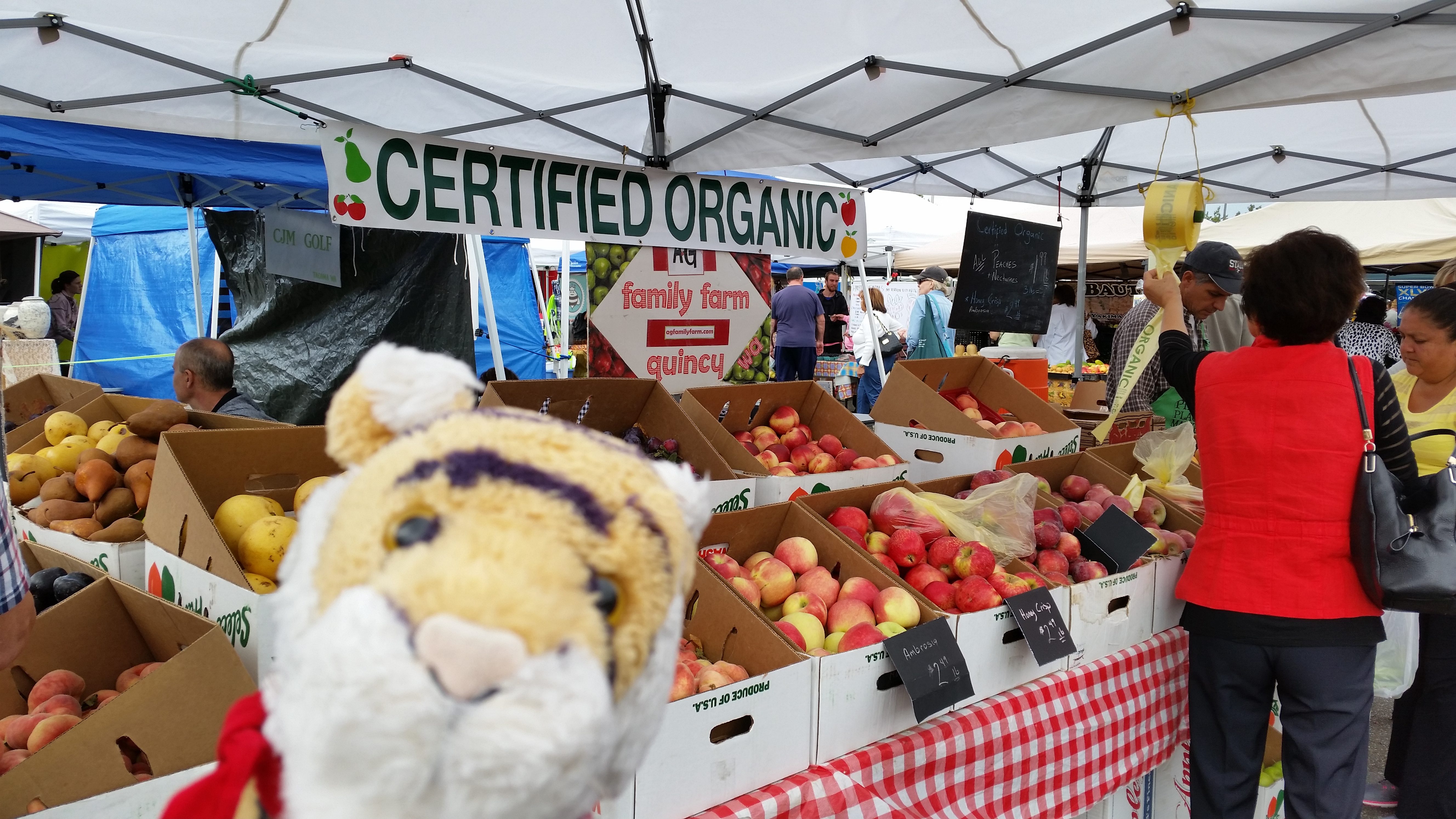 Oh Boy Oh Boy today we went to the Farmers Market! First we got organic fruit; peaches and apples!
