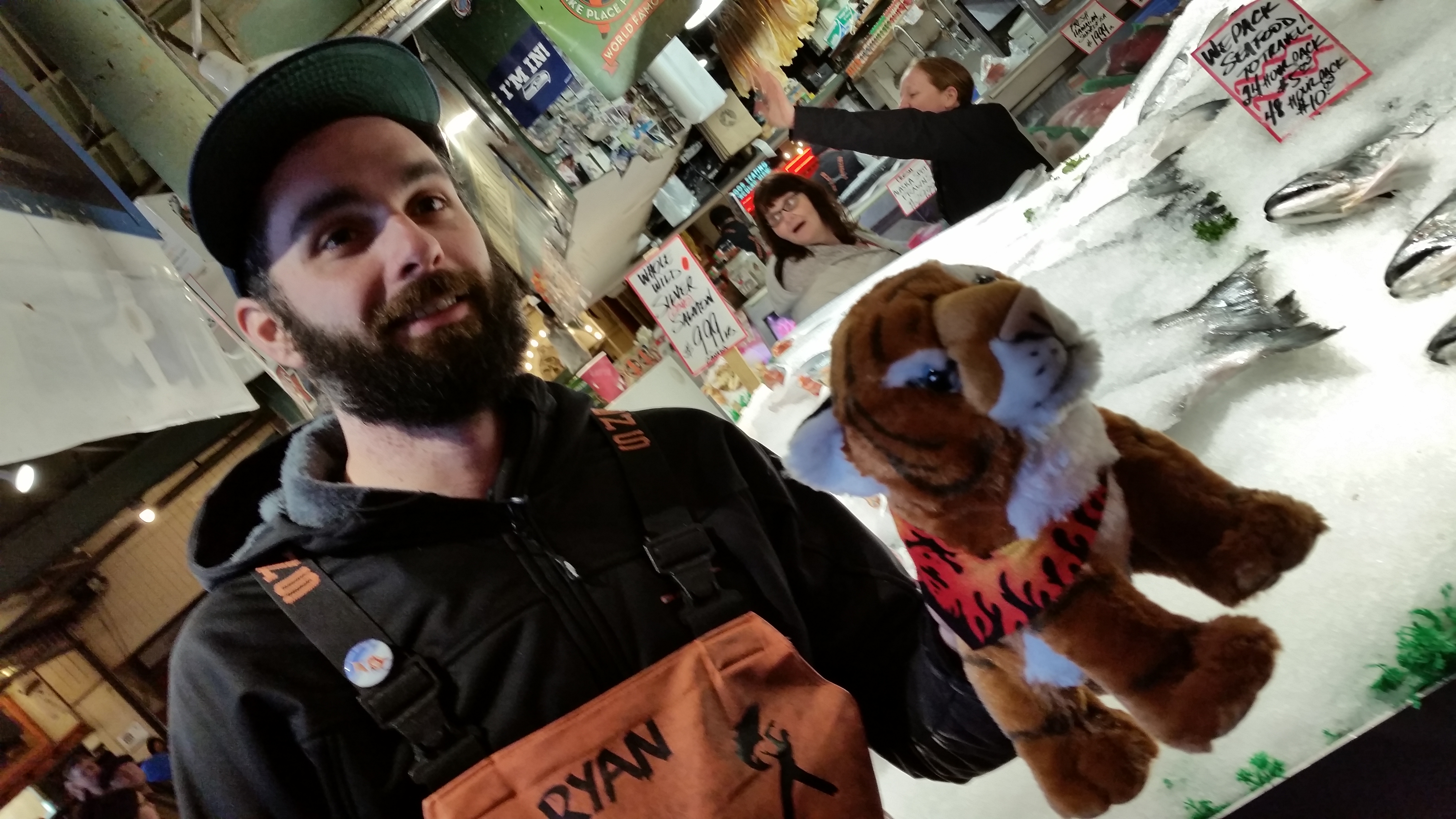We visited the fish market and here is Ryan with Taj. Ryan was really nice and really handsome but not quite as handsome as me.