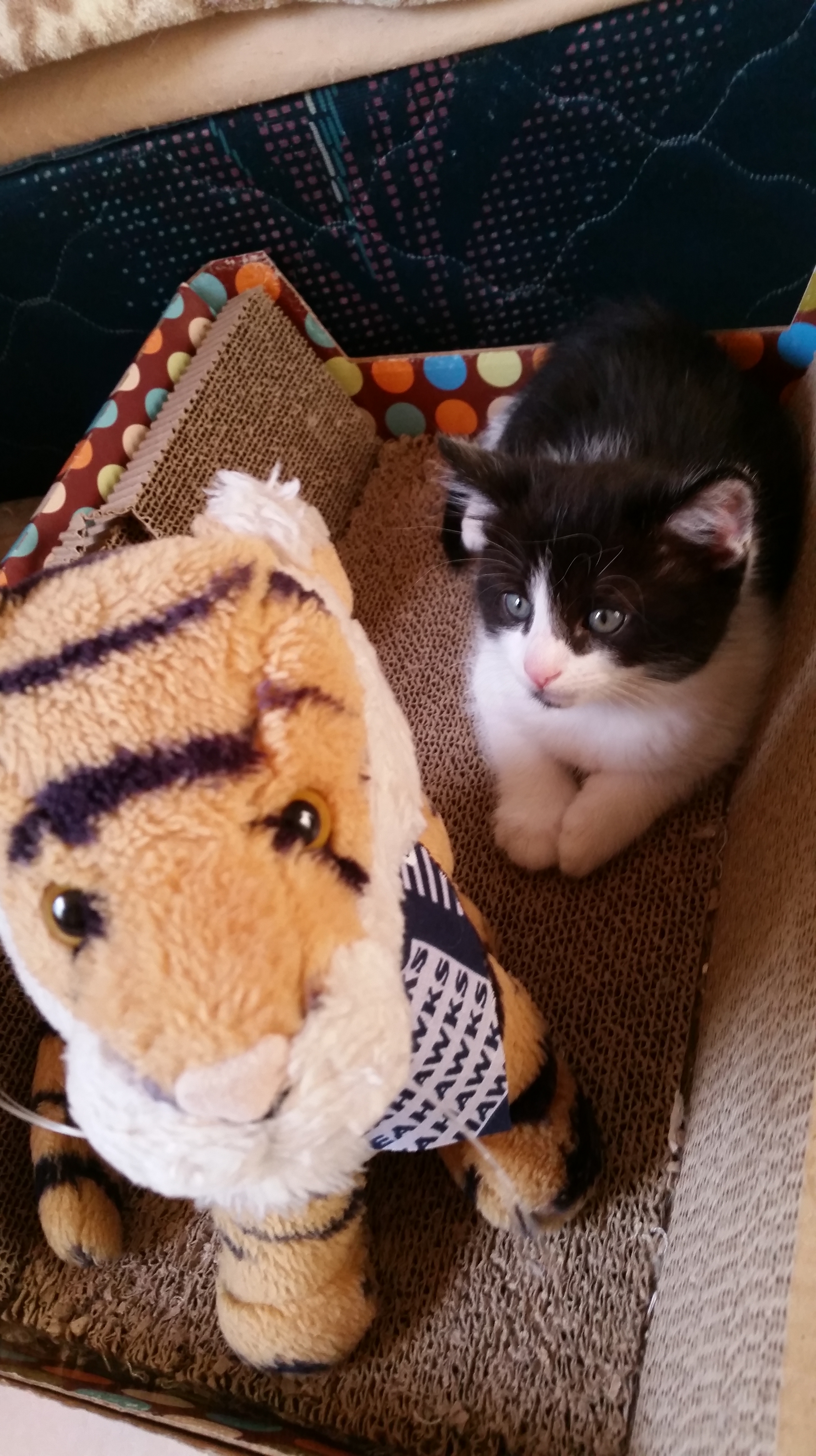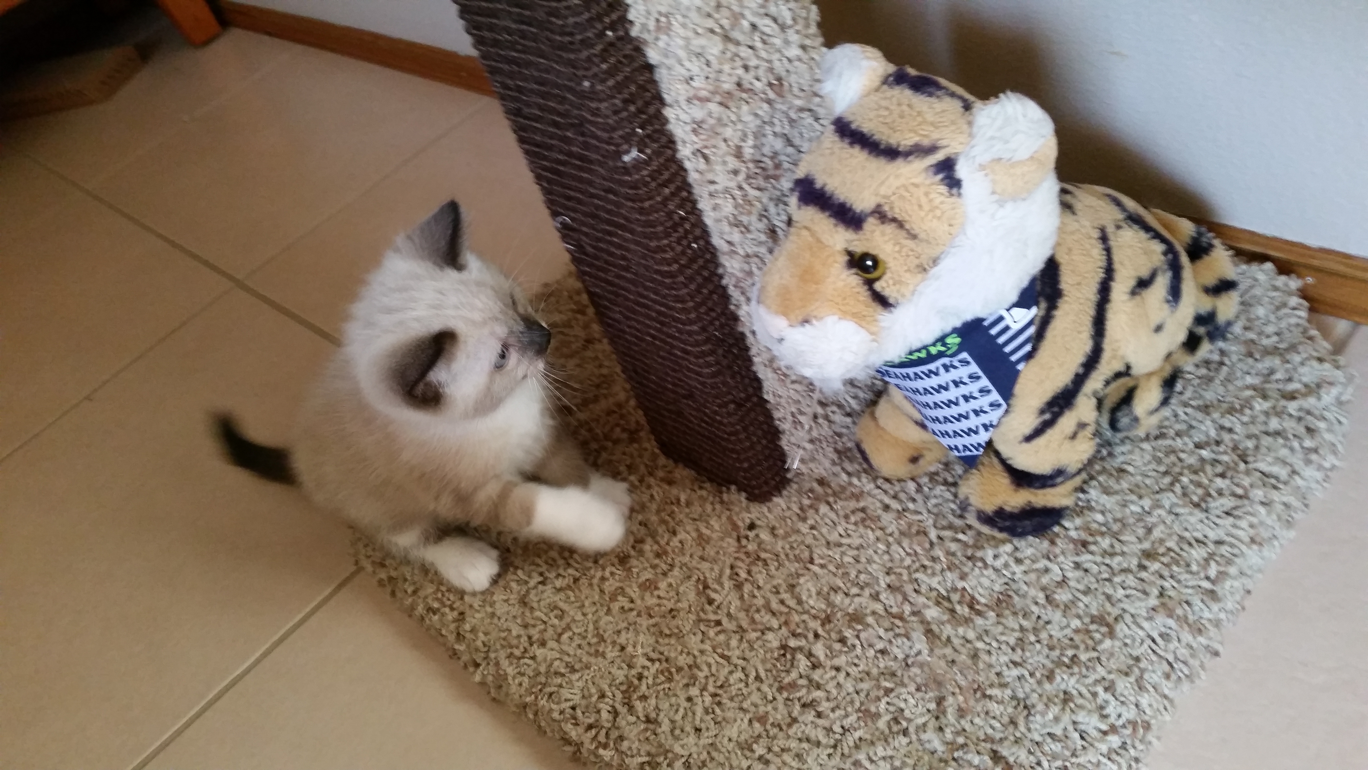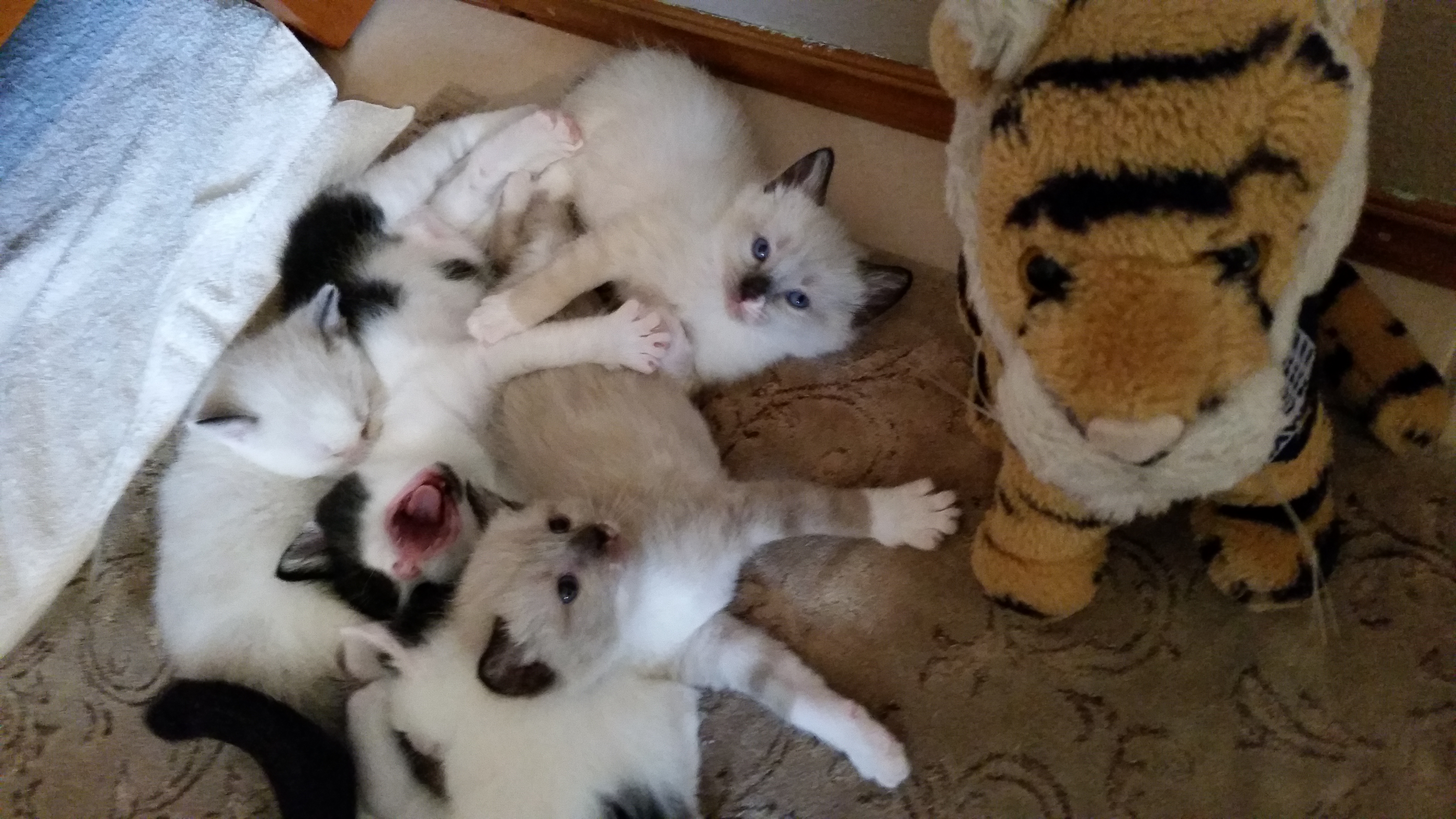 OMG the kittens are growing so fast! They are a little over 6 weeks old and they love to climb on everything. Mom’s pants are all in tatters. We had to put a cat tree in the room!