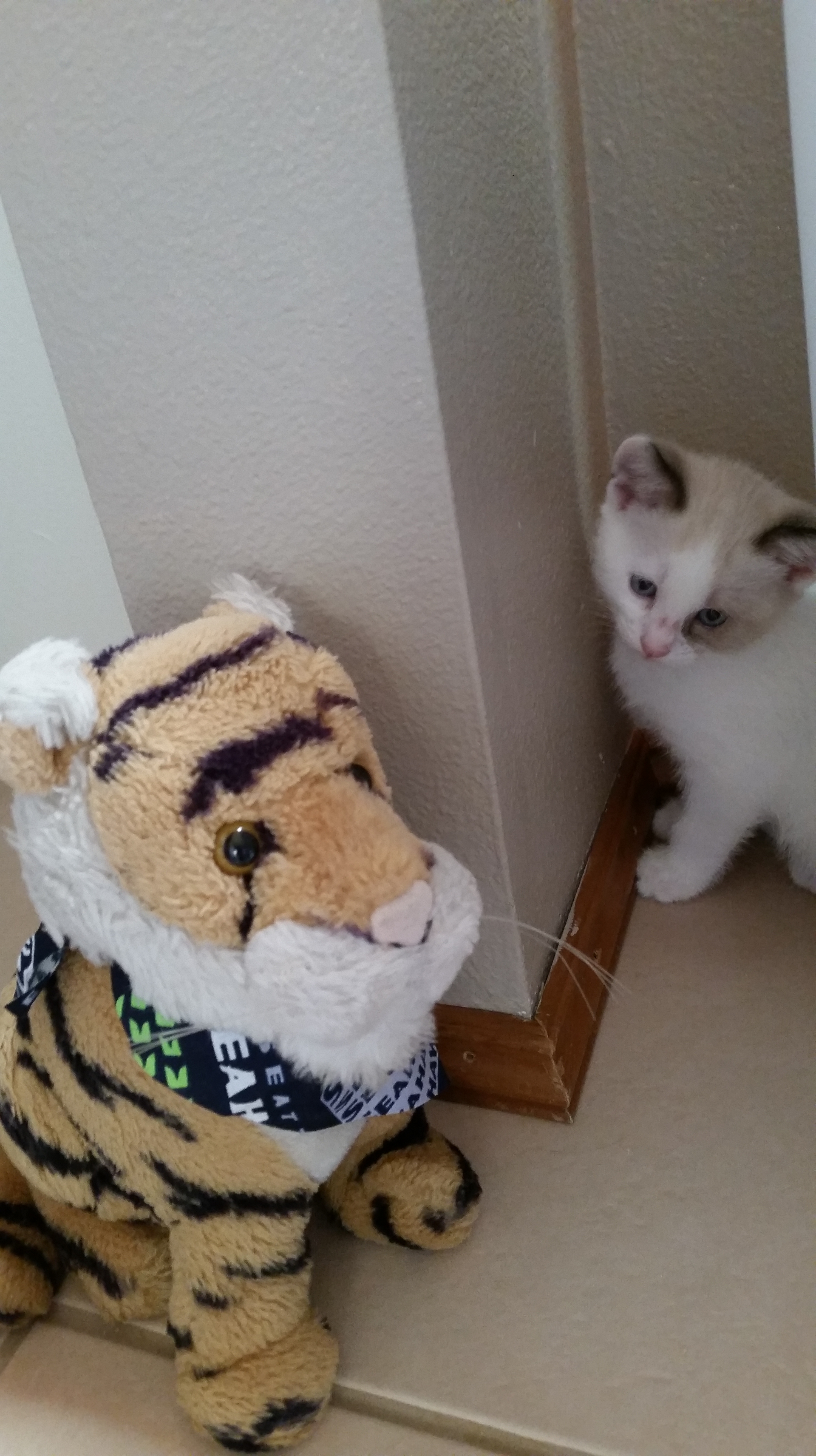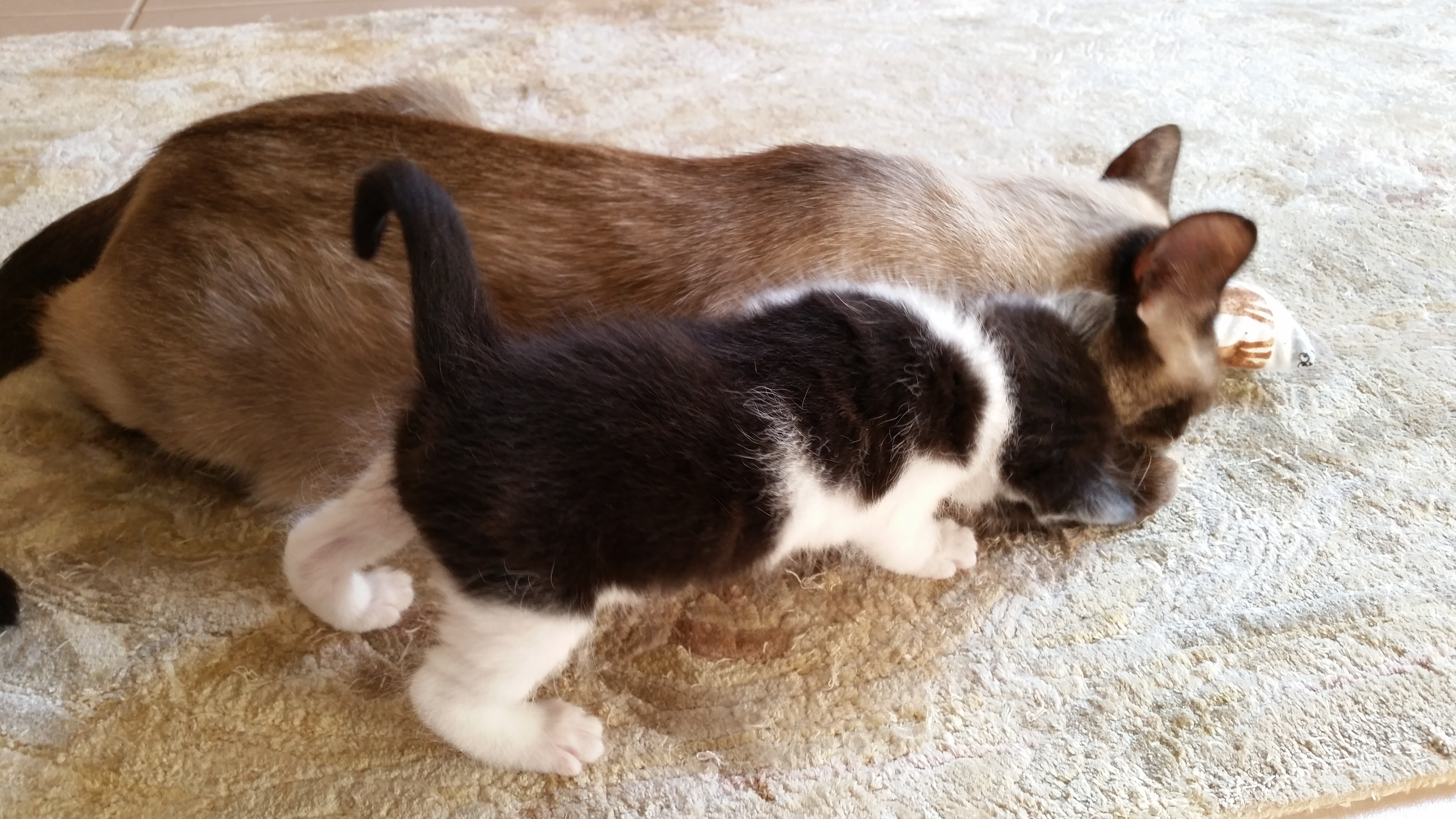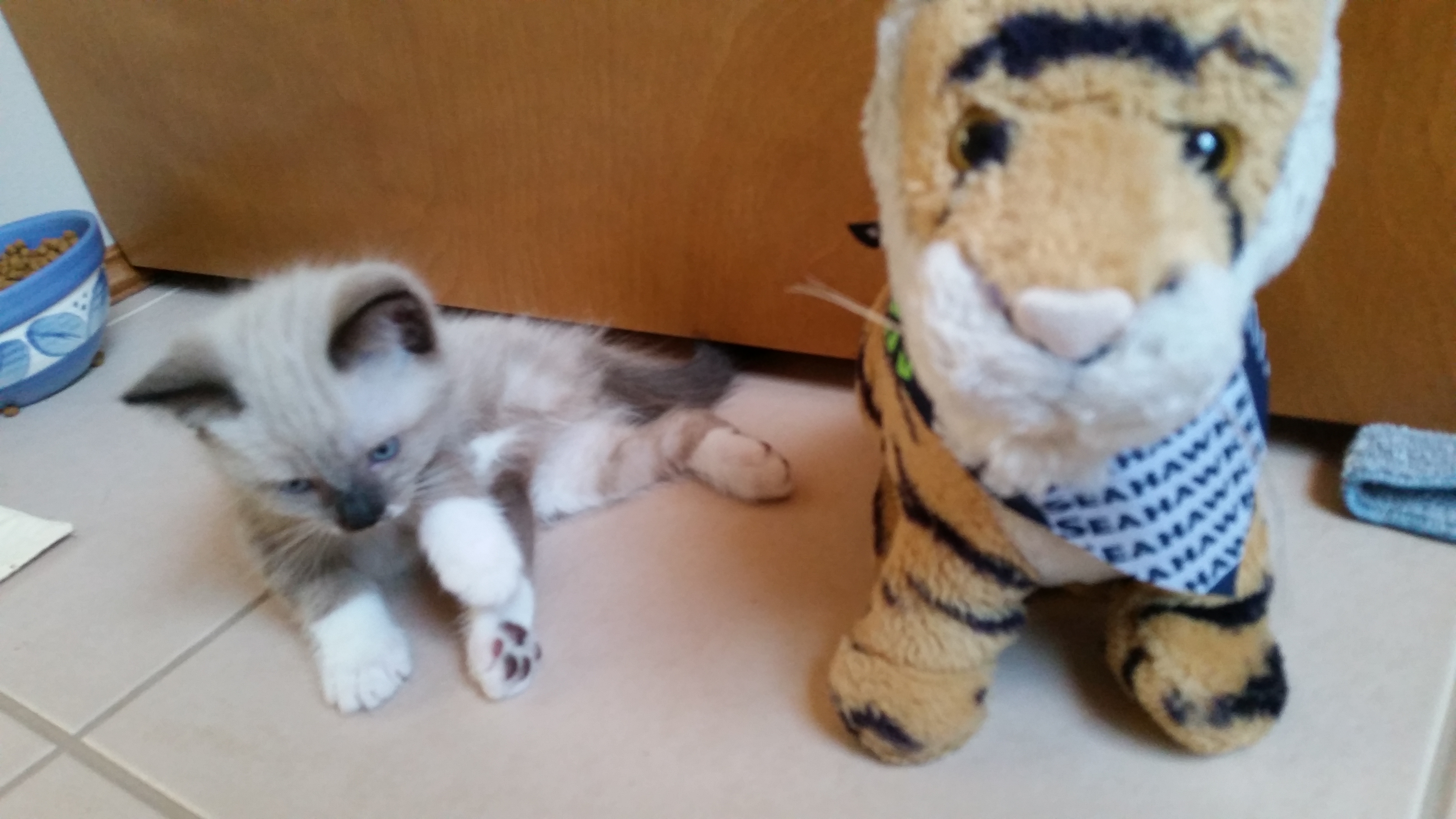 OMG the kittens are growing so fast! They are a little over 6 weeks old and they love to climb on everything. Mom’s pants are all in tatters. We had to put a cat tree in the room!