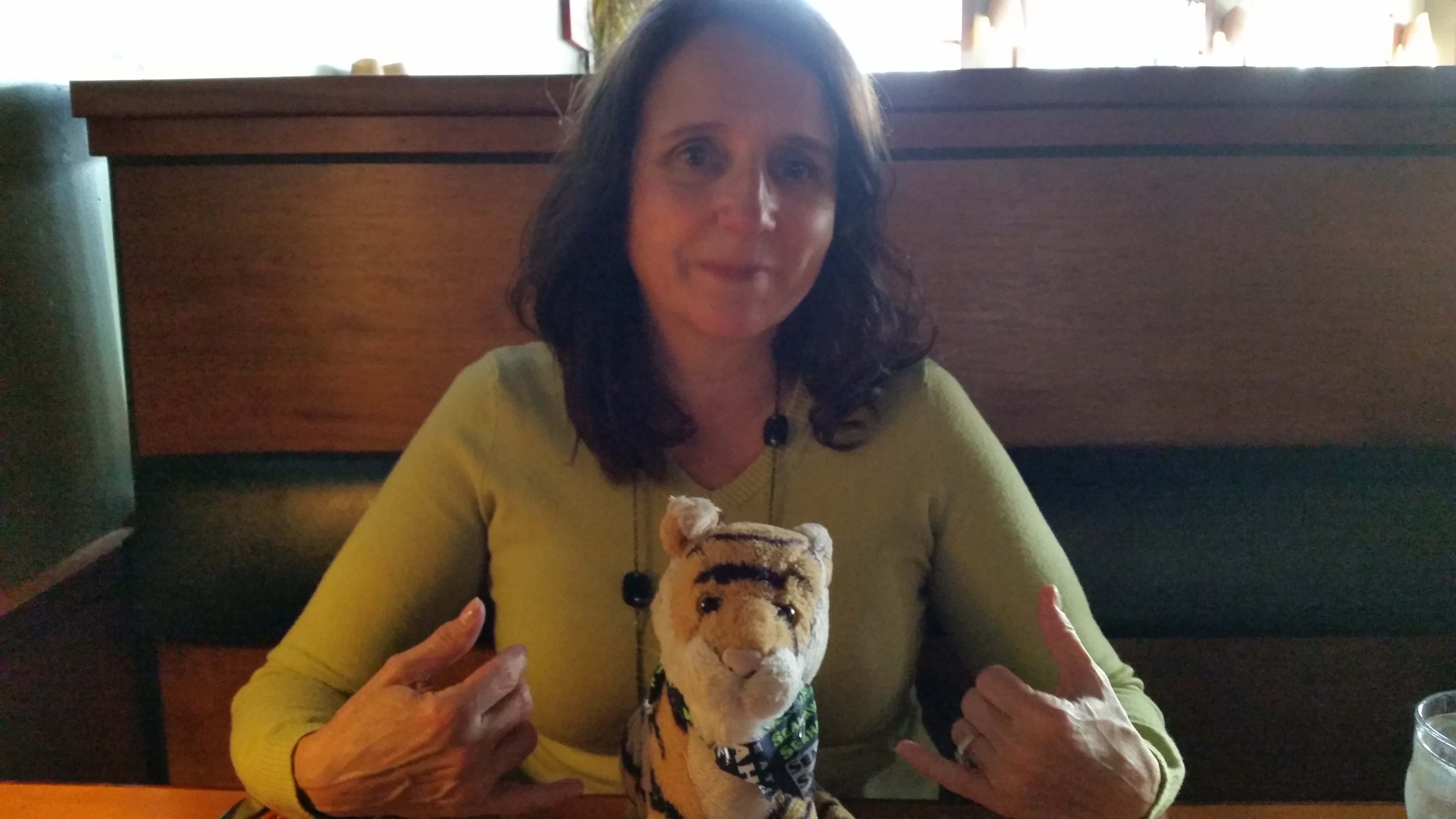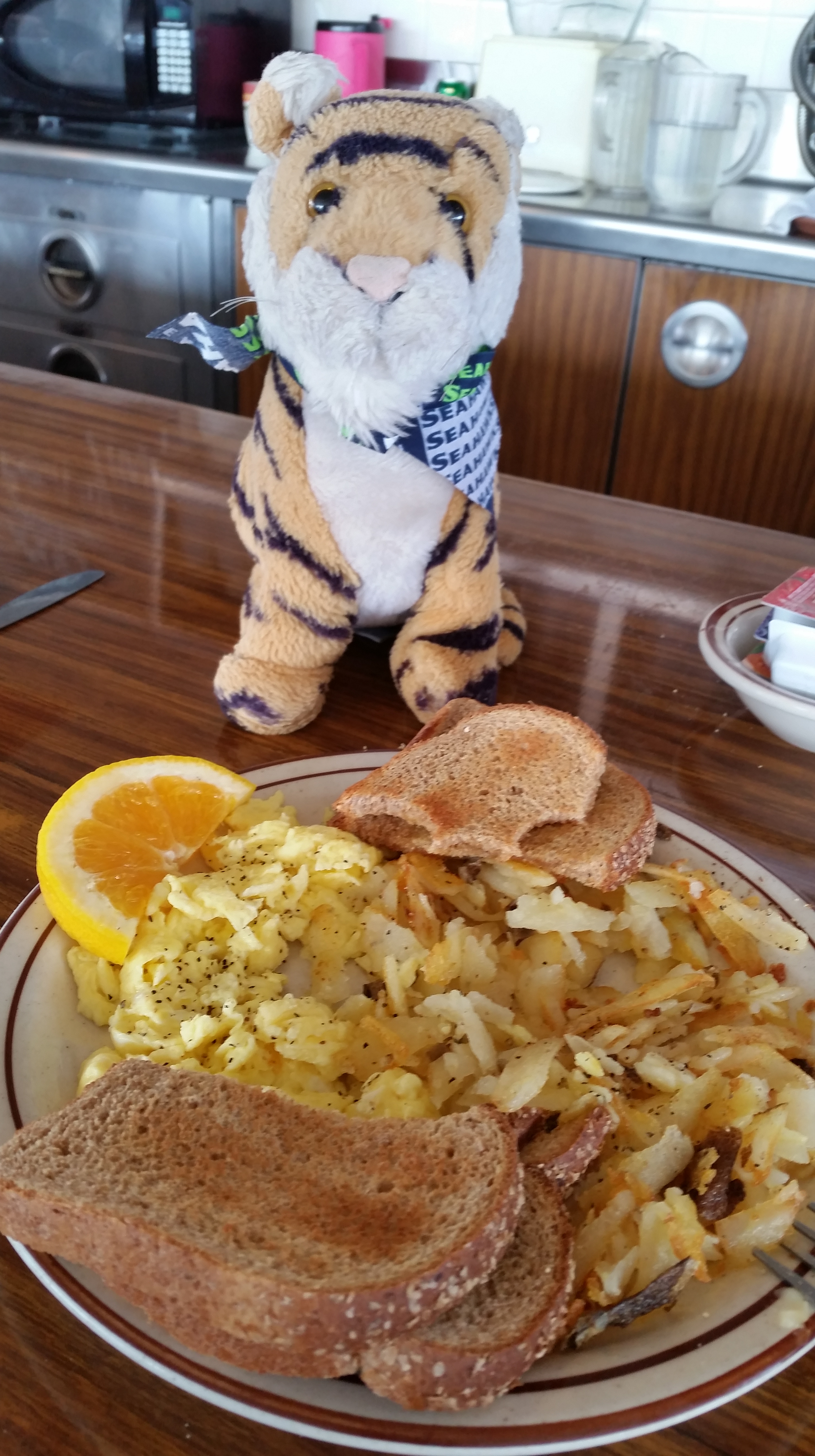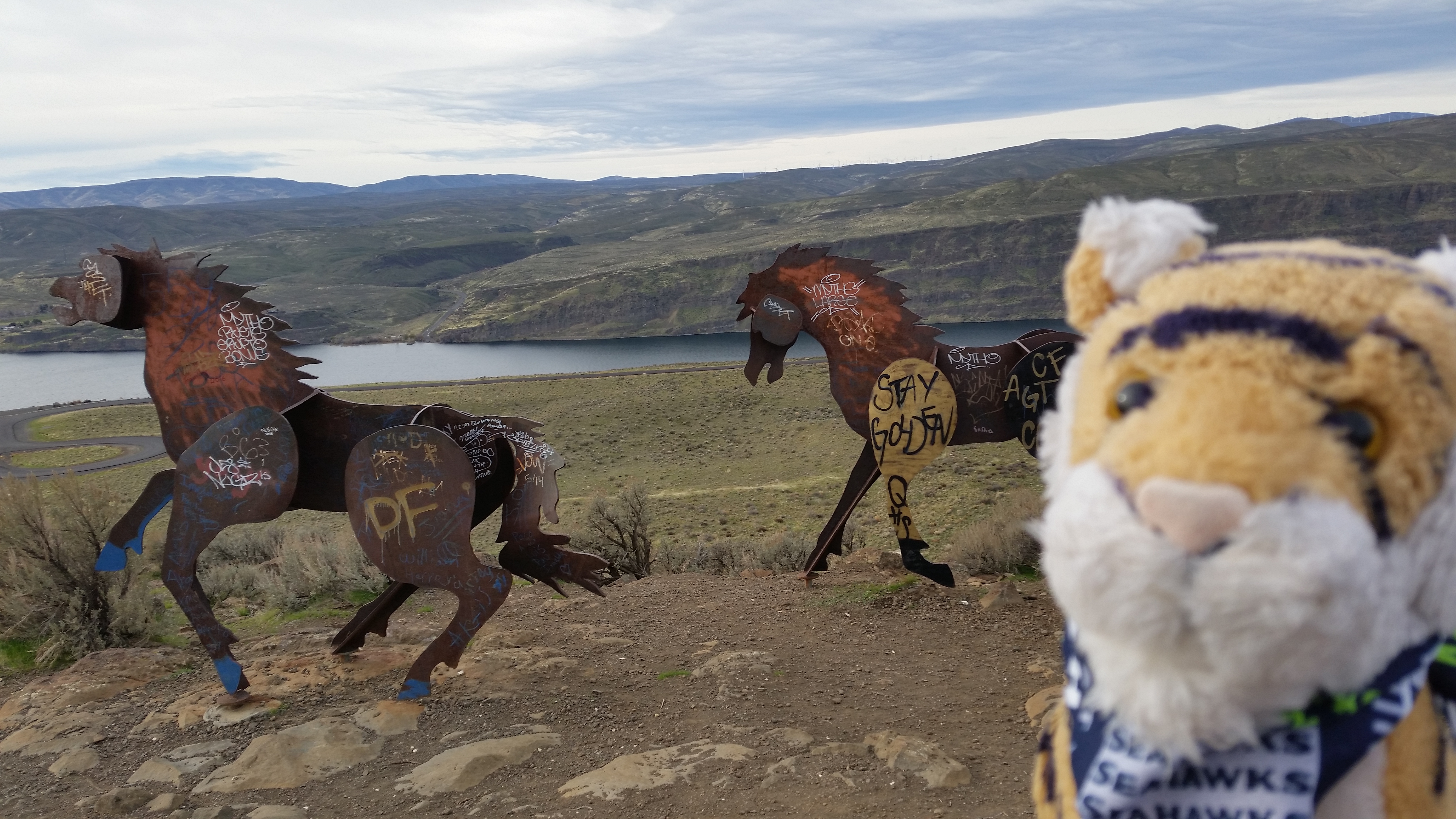 Then today we drove to Spokane. Mom starts her new job tomorrow! We stuffed the car full of boxes of clothes and kitchen things and tiger bandanas. We stopped at the Wild Horse Monument! It was very cool with the Columbia River behind. It is too bad that some people think they need to write graffiti. Tigers would never do that.