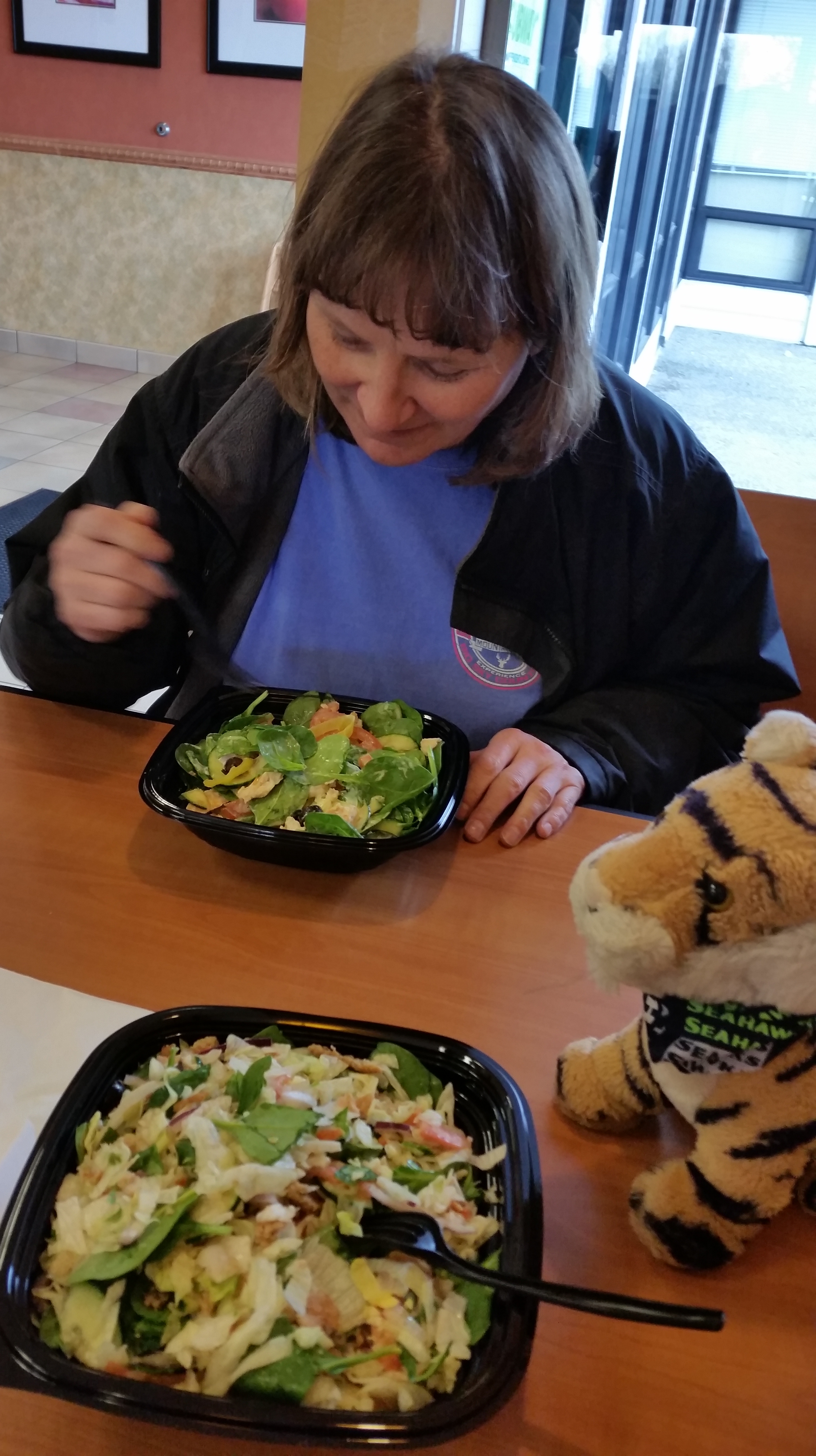 Here we are having lunch at a restaurant I LOVE restaurants!! Margo let me sit at the table and look closely at the lunches. Salads! I am a carnivore!