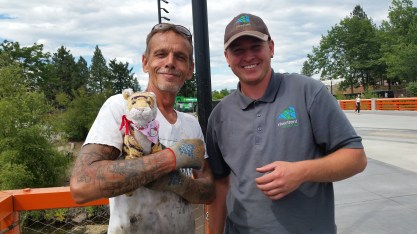 Then later we went downtown and walked along the river again and met Paul who has a fantastic contraption of giant magnets on a thick rope and he tosses it in the river and almost every time pulls up some interesting metal objects from the river. He was very interesting and super handsome and here I am with him and his friend Joah who is also very handsome but not quite as handsome as me.