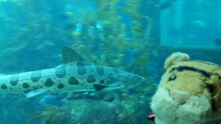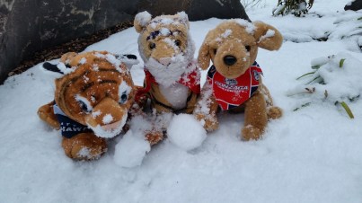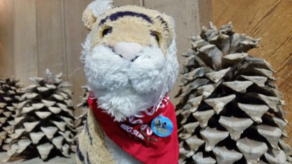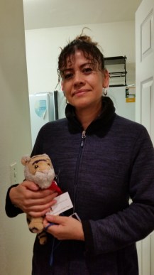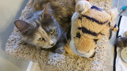 She has three kittens! It is really hard to get a good picture of them because they want to play all the time and they move so fast! The kittens are all different sizes. Lucky is the biggest one he is gray and white. Daisy is the medium-sized one and she is multi colored like her mom. The littlest one is less than half the size of the others! The shelter thinks he may be a dwarf. He is a really sweet cat and plays and wrestles with his siblings but also loves to sit in mom’s lap. Lucky likes to climb onto mom’s shoulder!