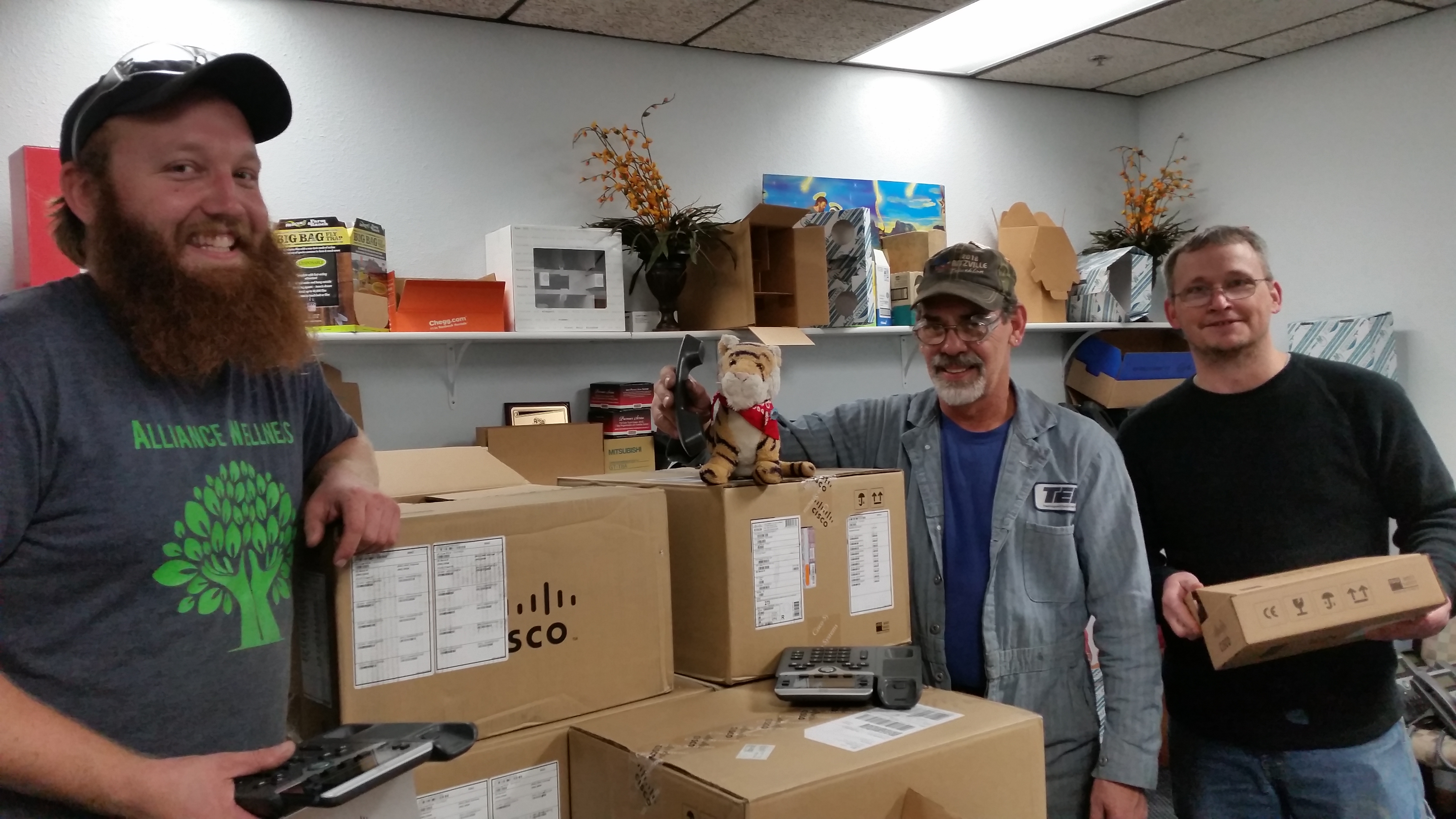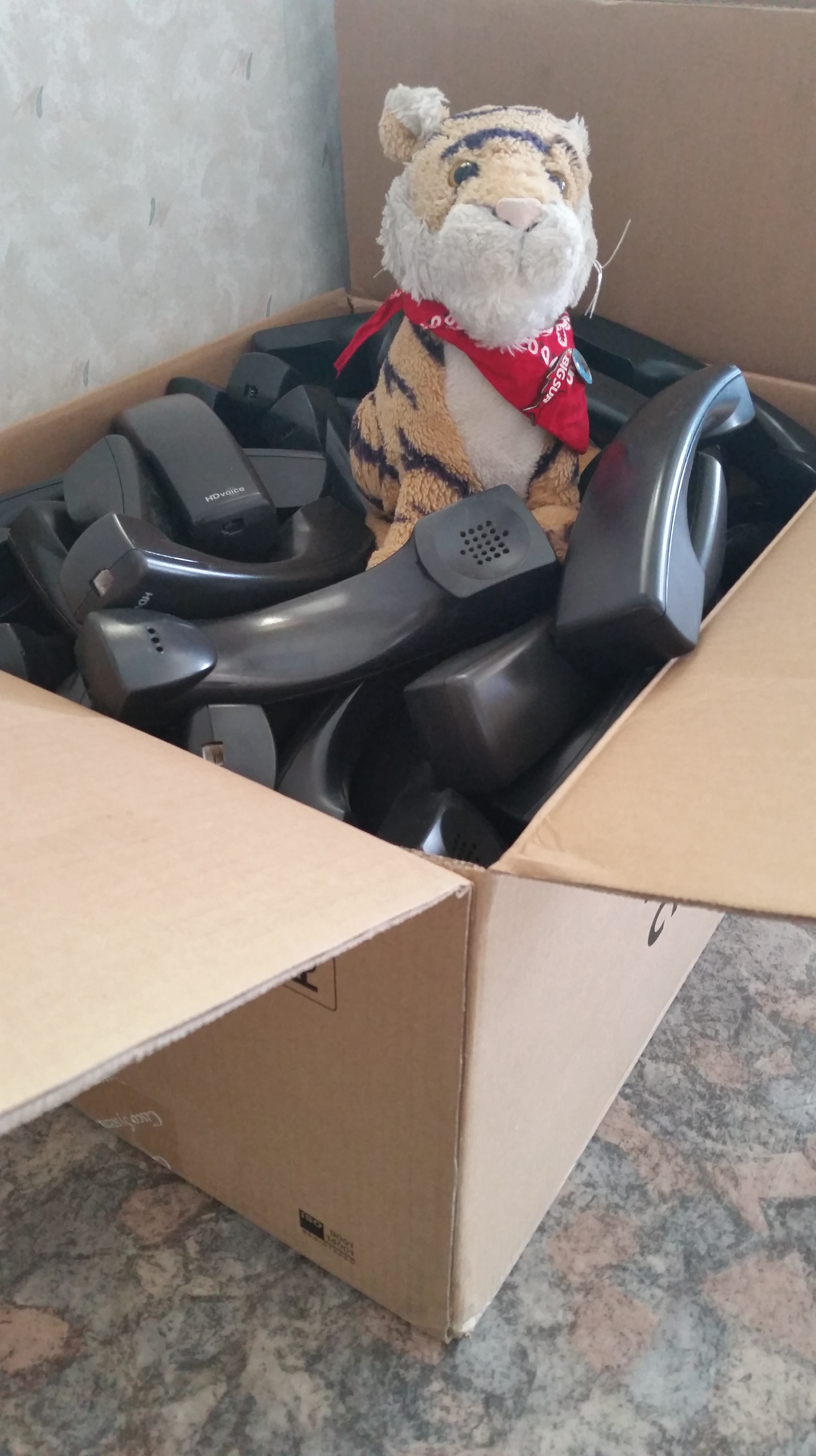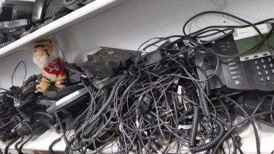 Here is a photo of just a small part of the phones and equipment that got replaced. It was a lot of work to get ready for the project, unpack and assemble the new phones, put out the new equipment, swap it with the old equipment after everyone left for the day, program all the phones, and bring back the old equipment. I was tired! Great job everyone it was a TEAM effort!  Mom says I was a big help!