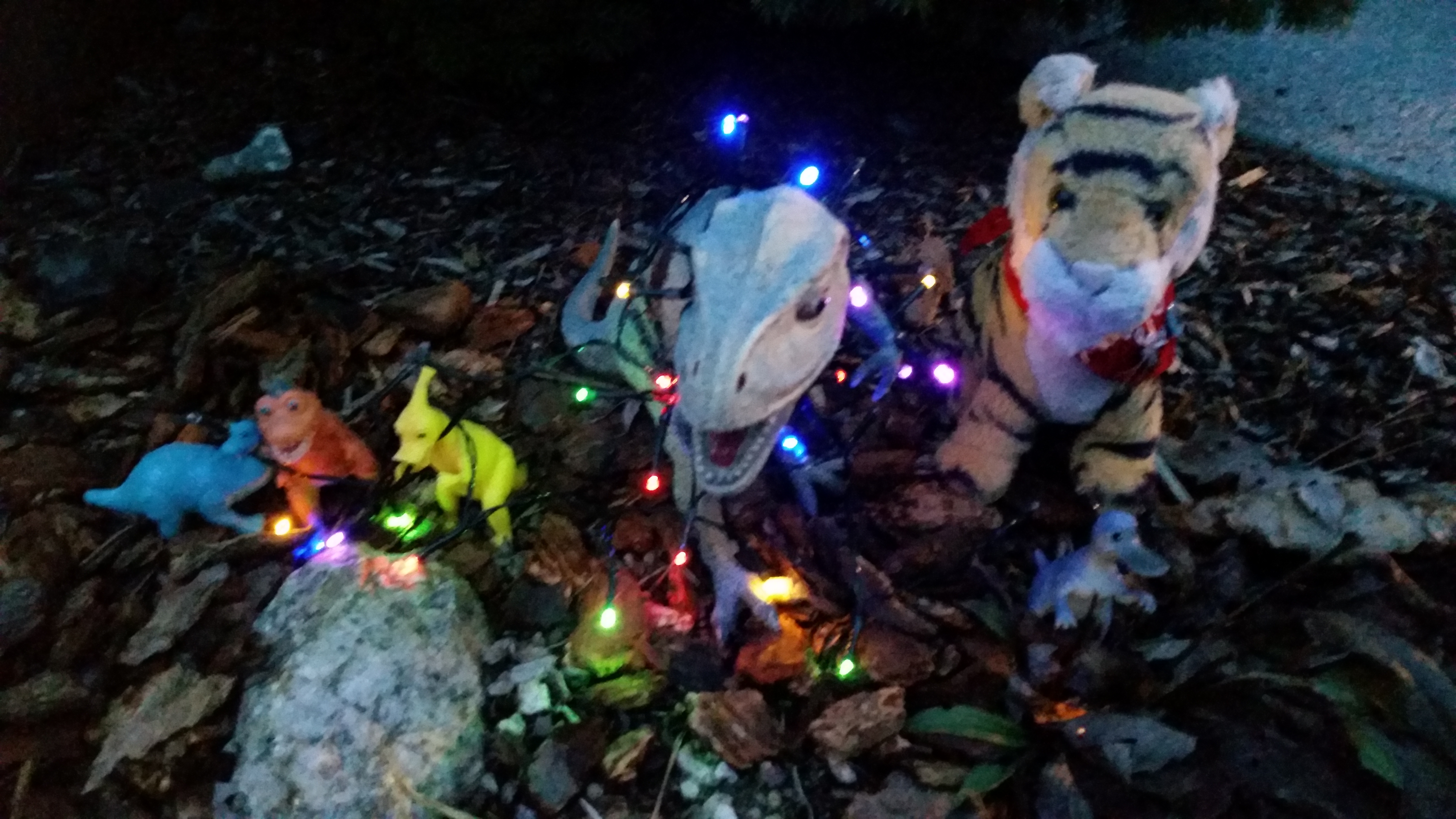 Also for the holidays I helped mom decorate Dino and the little dinosaurs with twinkling lights. We’ve been told that we have the best decorations in the whole neighborhood!