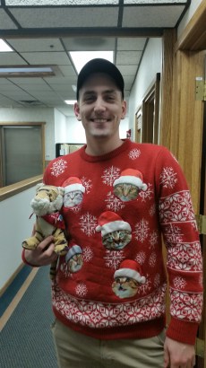 This is such a great time of year!  People wear super holiday outfits!  Here I am am with Mack who is wearing an awesome cat sweater!  But it would be better if it had TIGERS. Mack is really smart and very funny and handsome and is a sharp dresser!