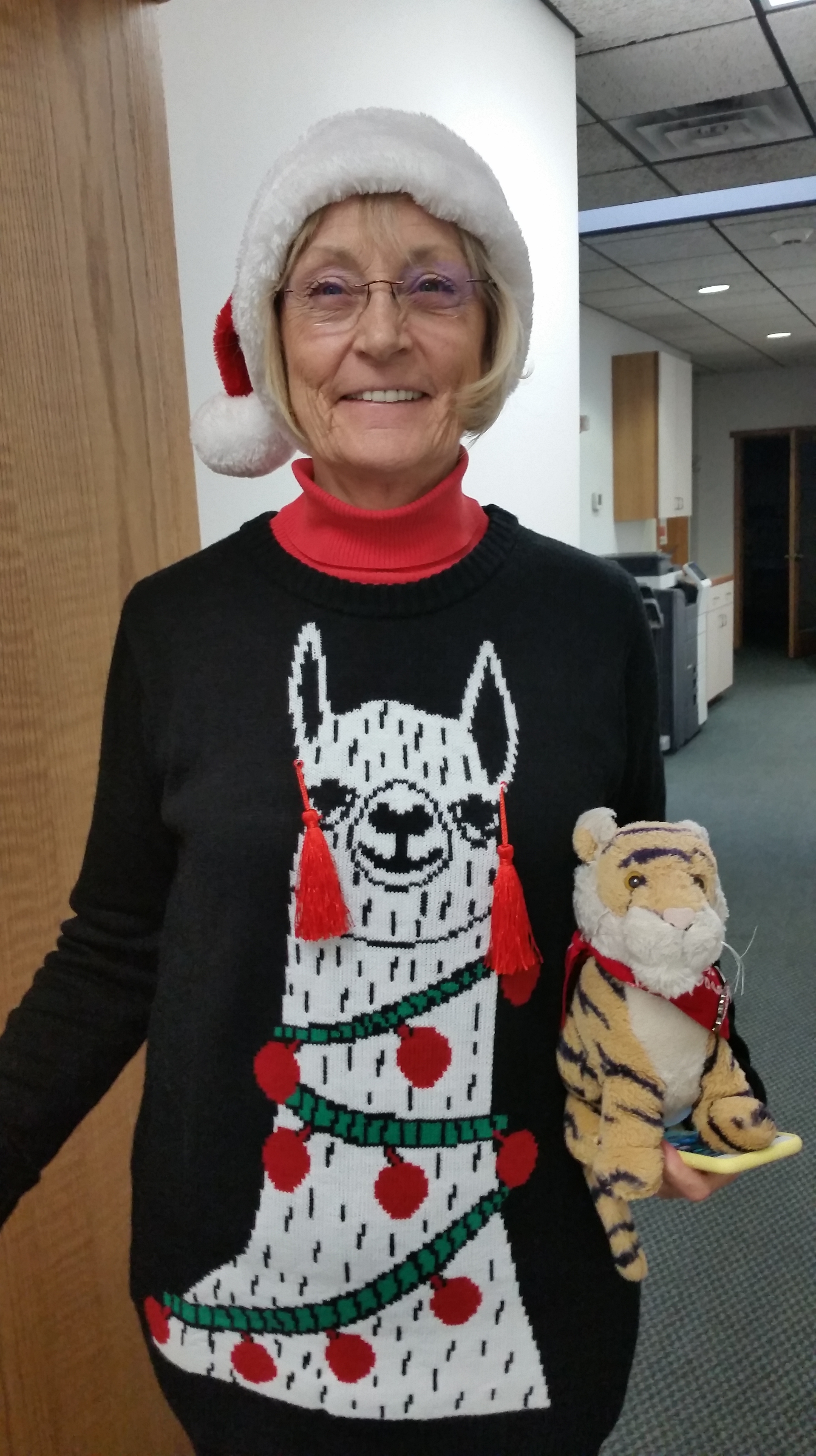 And here I am with Betty who has a great holiday llama sweater.  The llama has earrings or tassels that really swing!  People found that funny I am not sure why.  Betty is super gorgeous and is one of the nicest people we know.