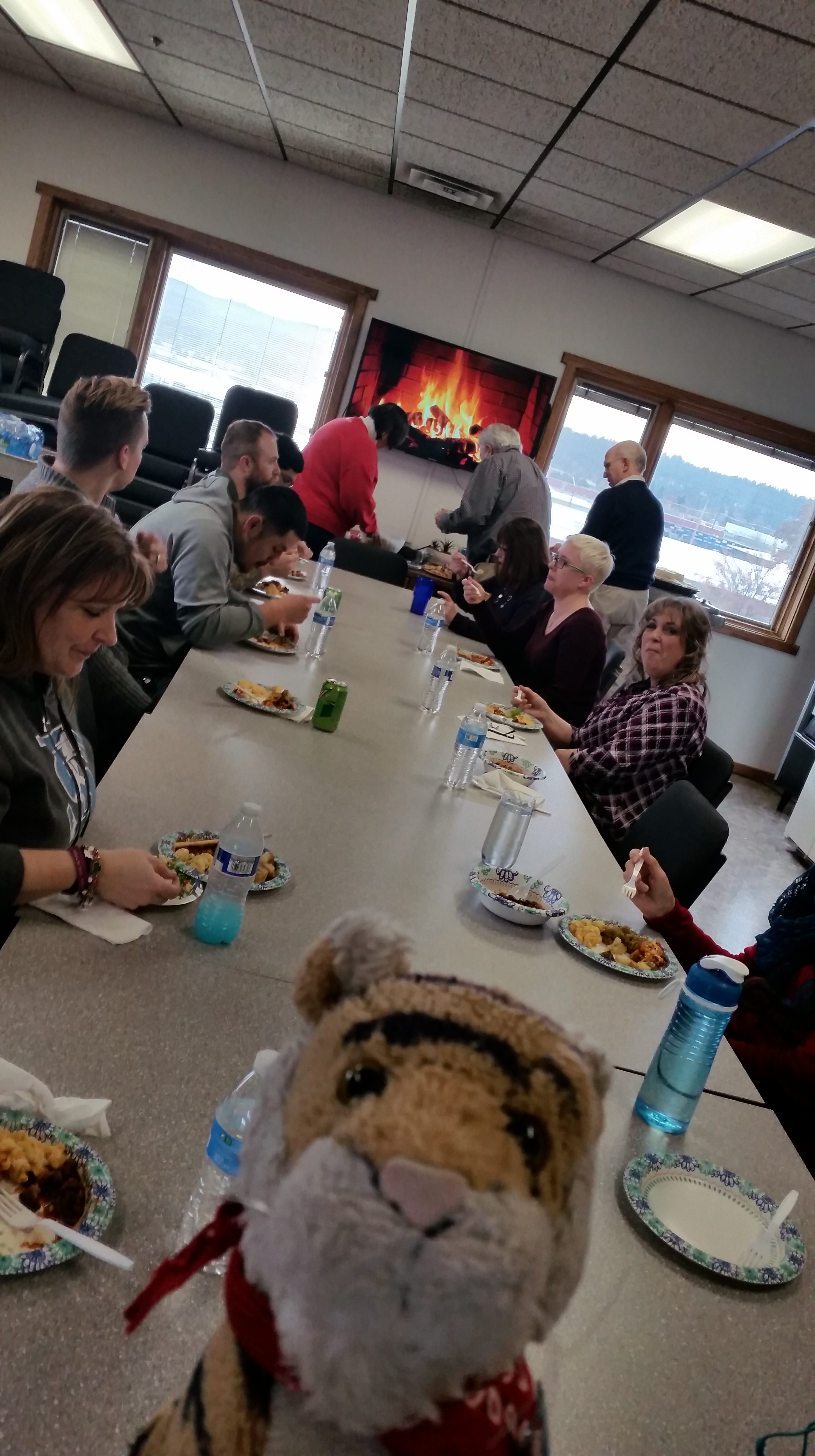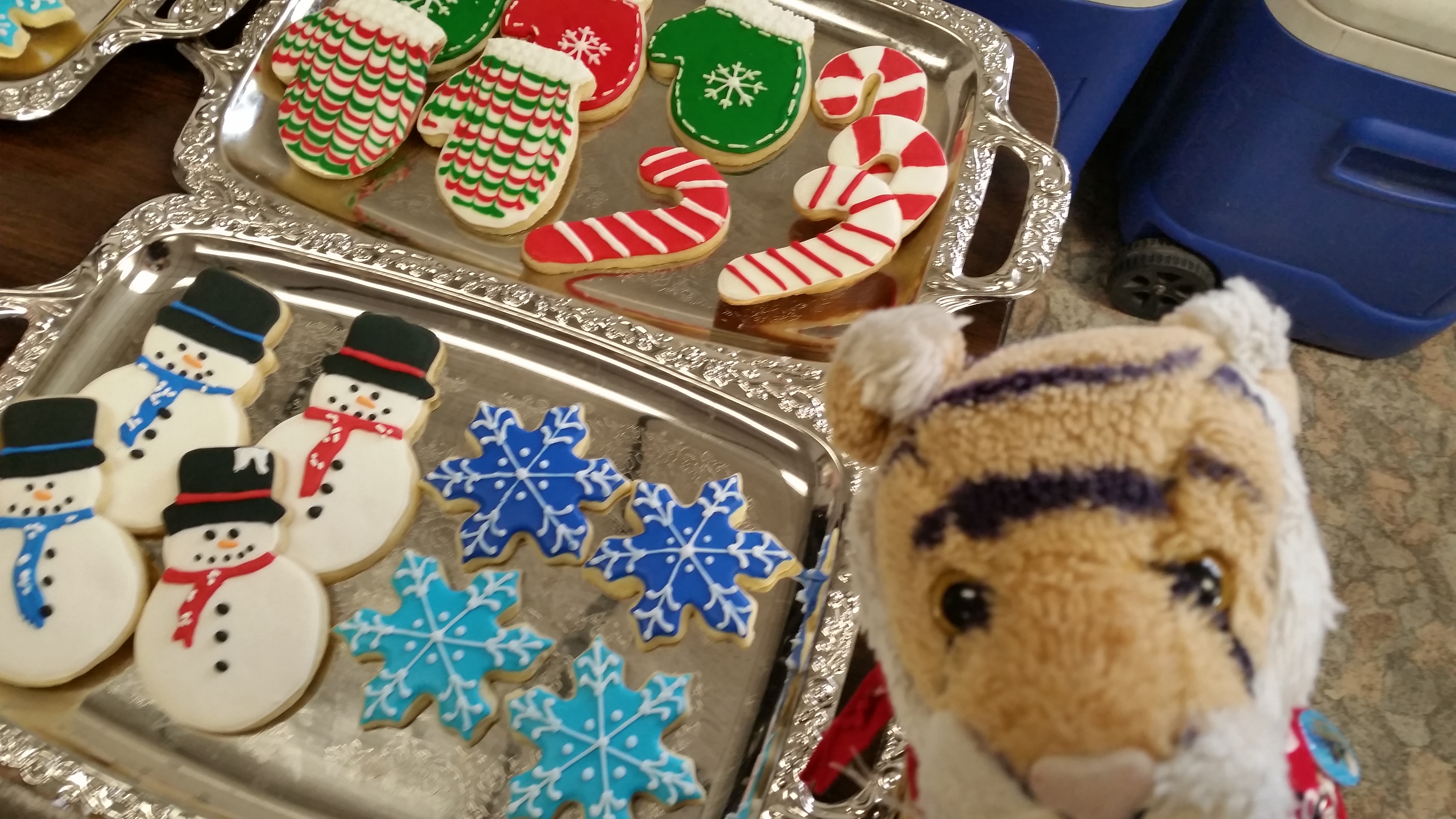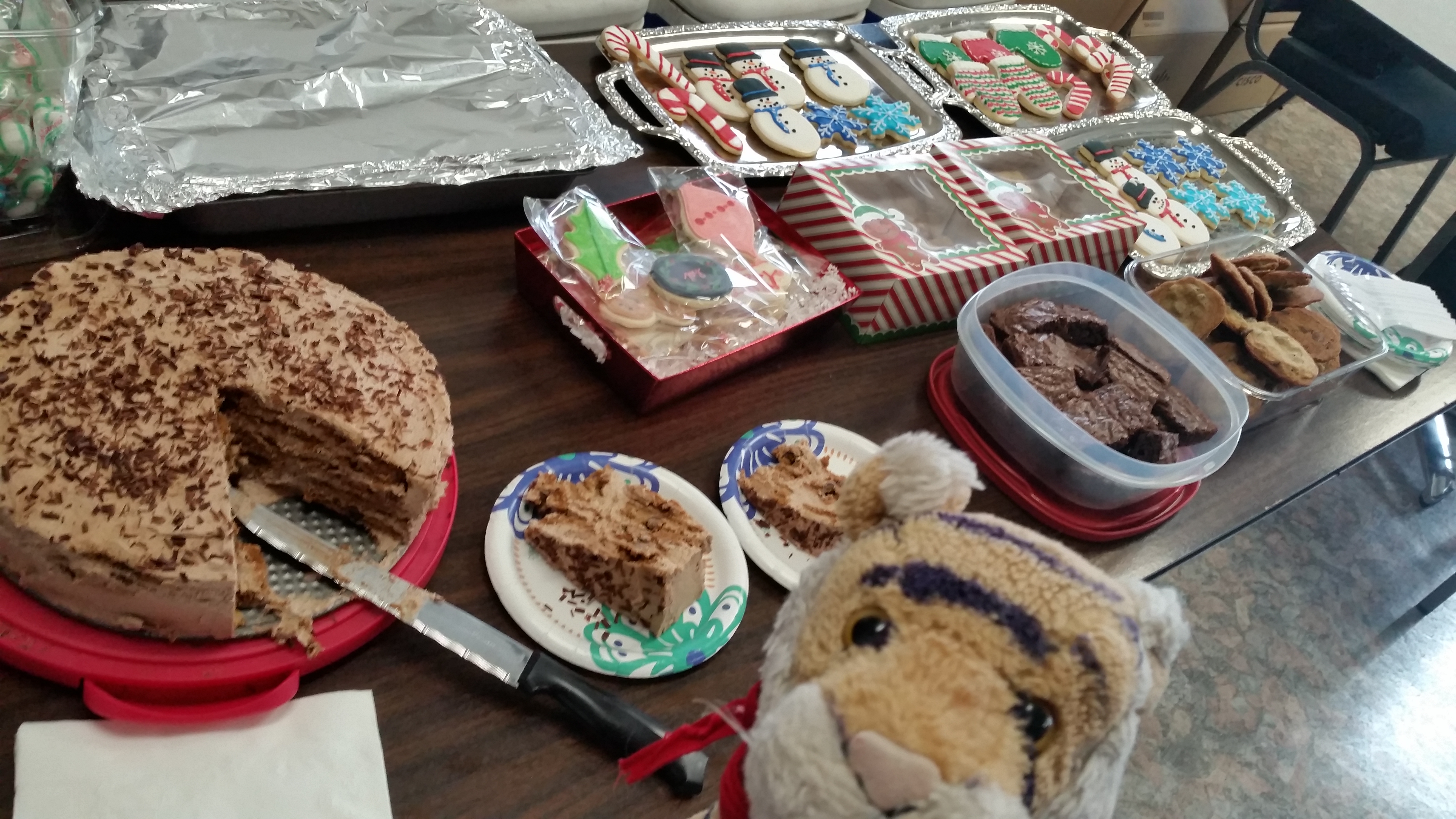 Then the next day we had a potluck and gift exchange for the third floor it was awesome fun!  Lots of people came and we had the TV showing a fireplace crackling and there was Christmas music and lots of super delicious food! Tigers LOVE potluck parties!