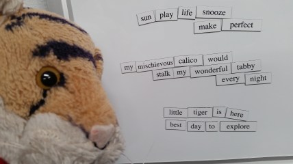 David gave us a magnetic poetry kit that is for cats! Look at the great poetry we did!  It is really a good thing that Chad is not around so we can devote lots of time to this.