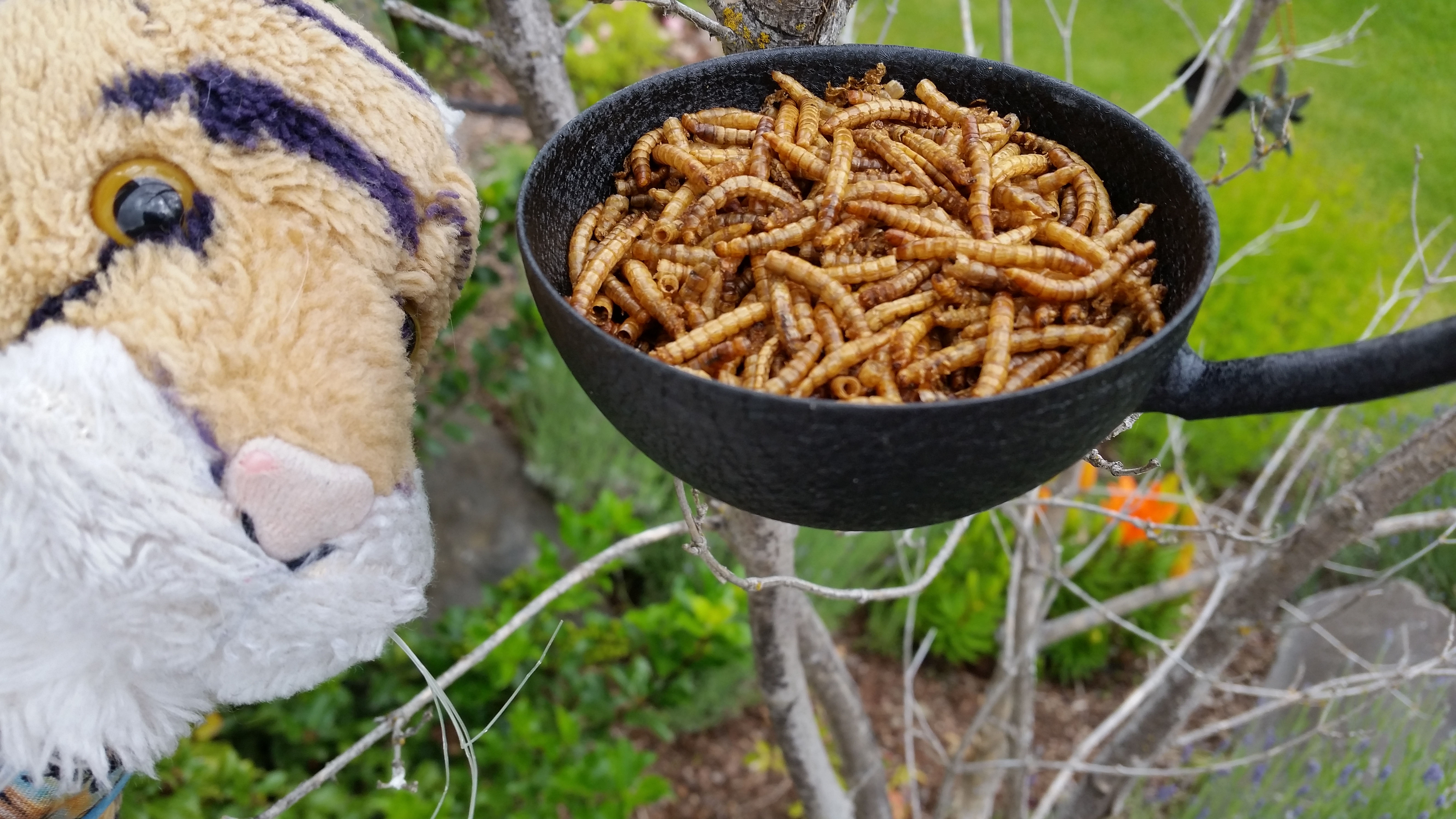 They had dried meal worms!!!  I told mom please please can we buy some and she did!!!!  They also had LIVE ones but mom said NO we are not getting those. Here are the meal worms in a new feeder when you pour them out of the bag they move around and look like they are alive and wiggling around it is awesomely gross!
