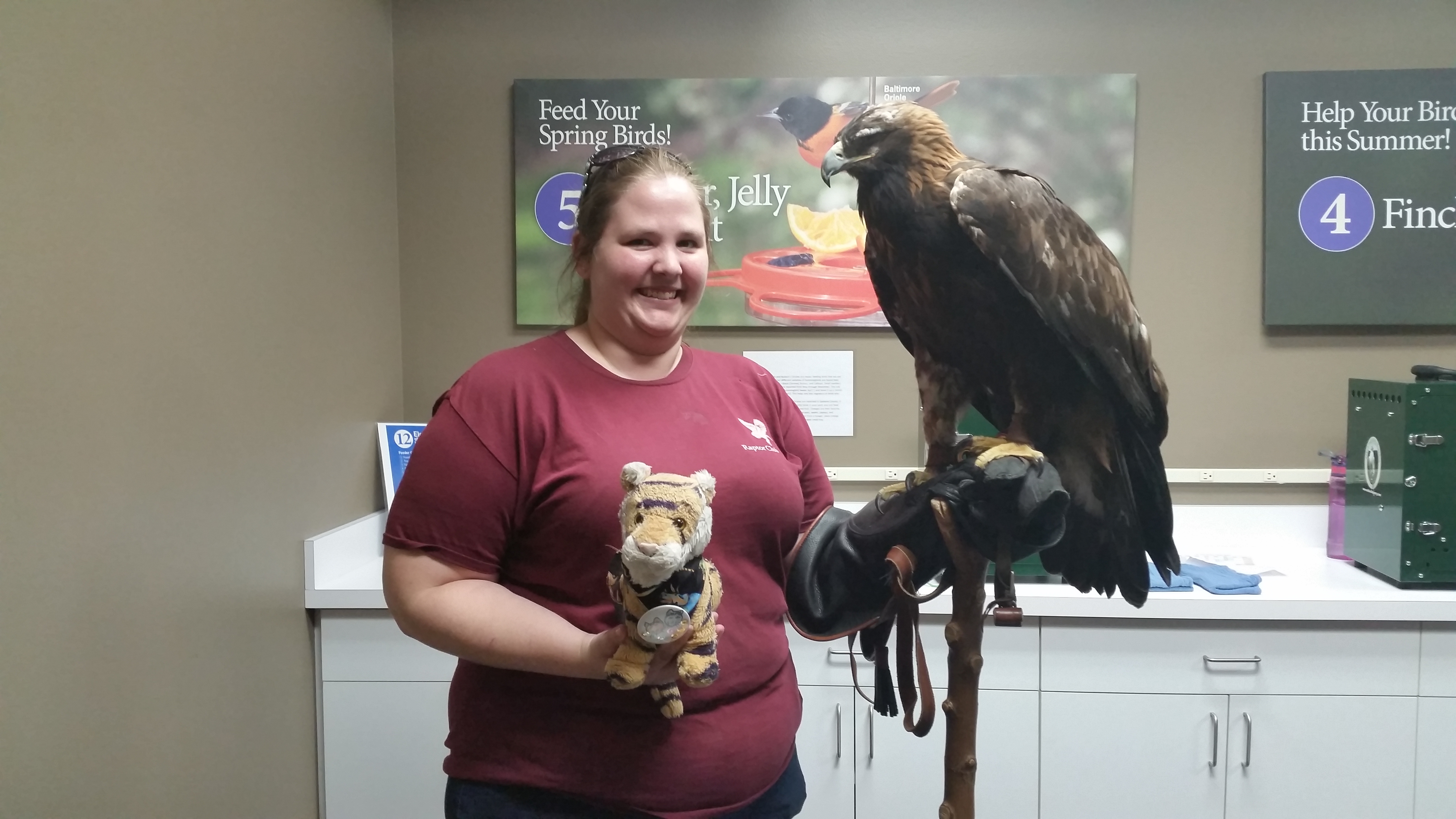 This weekend we went to an event where the WSU Raptor Club was showing wild raptors it was great! We saw a barn owl and a horned owl and kestrels and a GOLDEN EAGLE!!  OMG!!!  Here I am with the EAGLE OMG!!!!  The WSU veterinary hospital works with the Raptor Club to rehabilitate the birds and return them to the wild if possible but some have to stay in captivity like the eagle because he is blind.