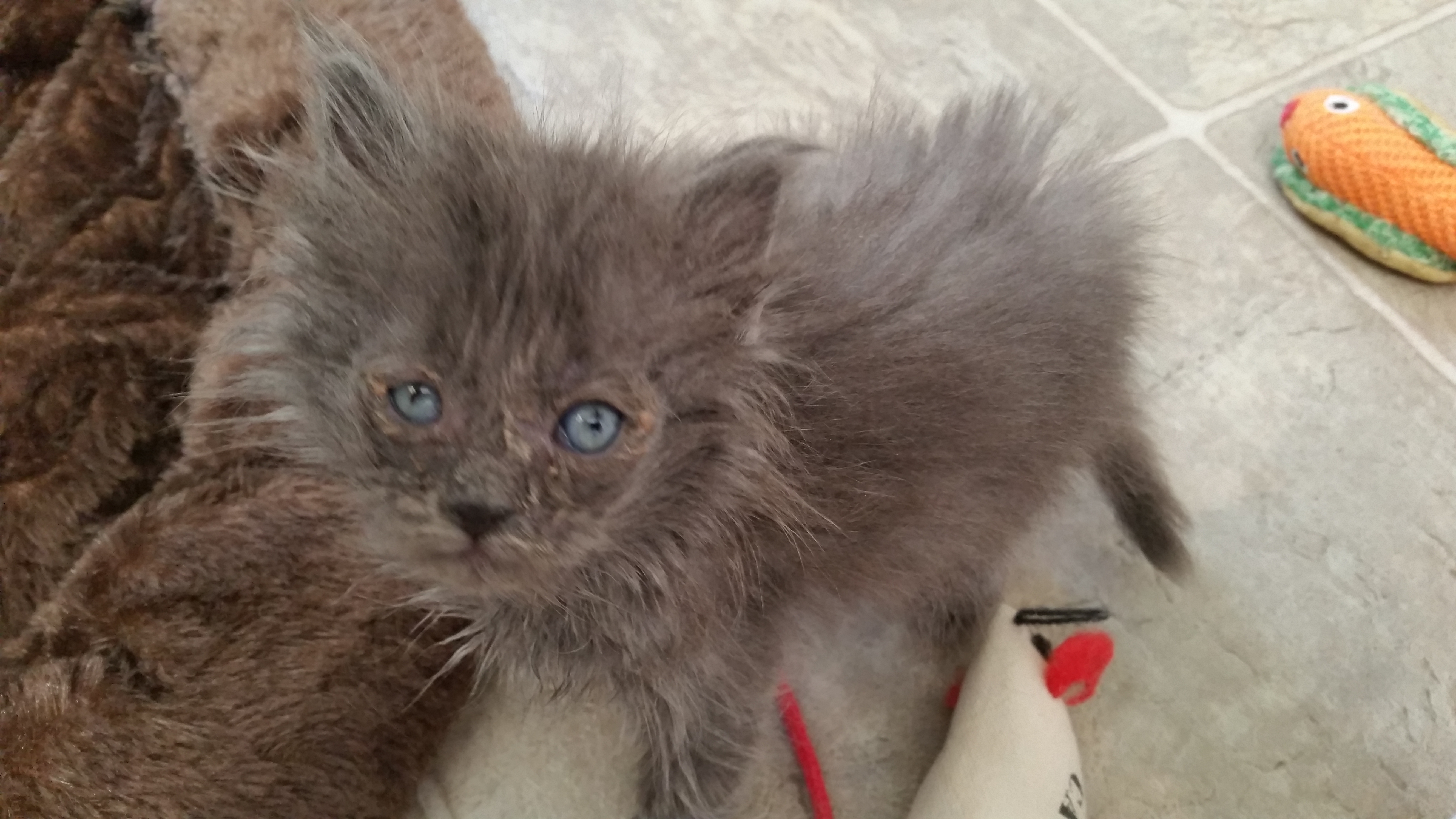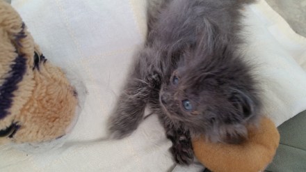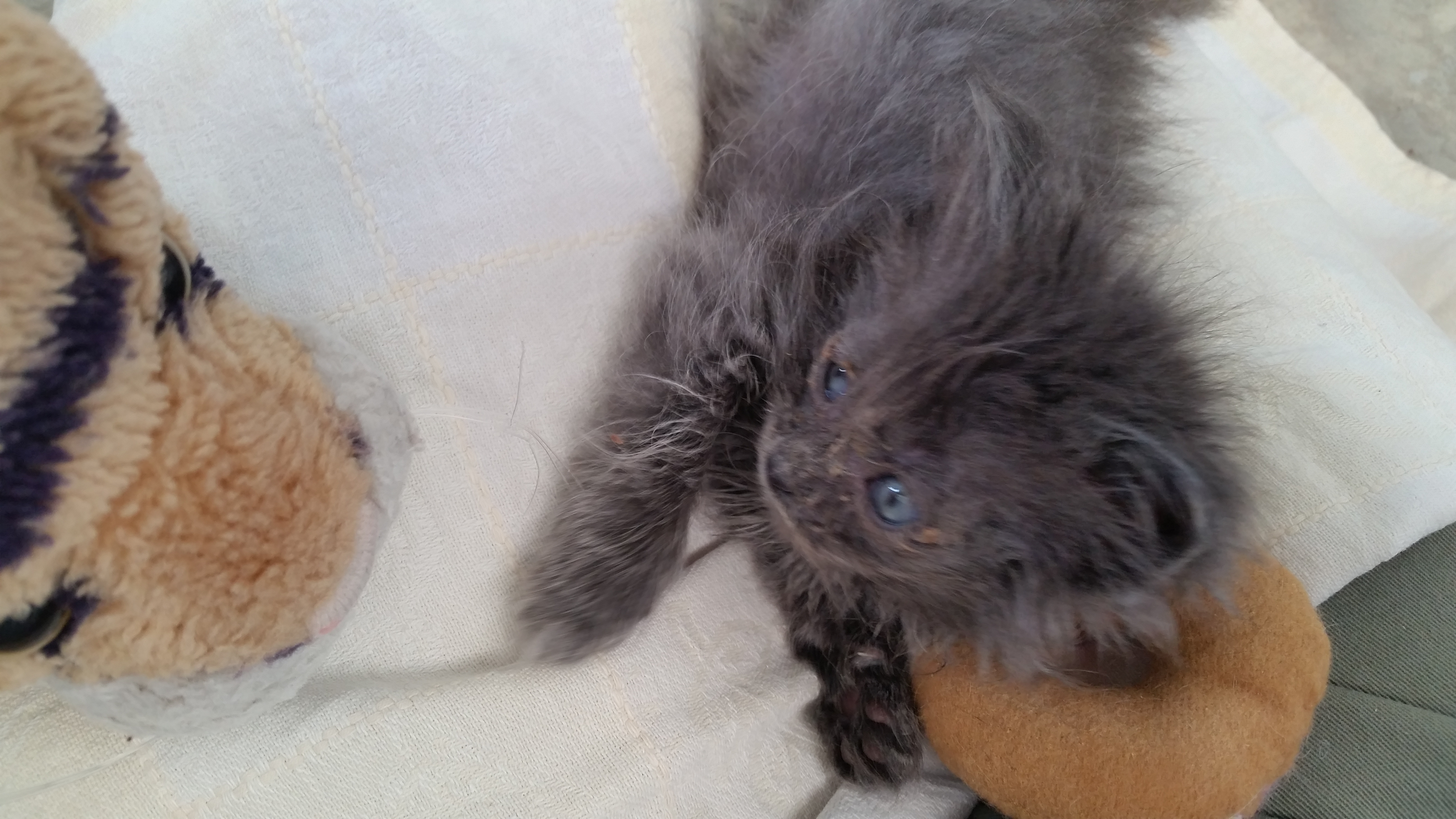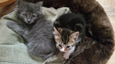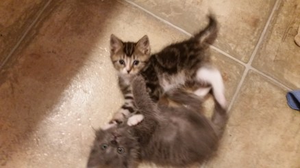 OMG we have another orphaned kitten!! Now they can chase and play with each other, learn social skills, and keep one another company! It took a few days to slowly introduce them but now they are best buddies and are together 24/7. The new kitten is smaller she is probably about a week younger. She is very sweet and a little shy.