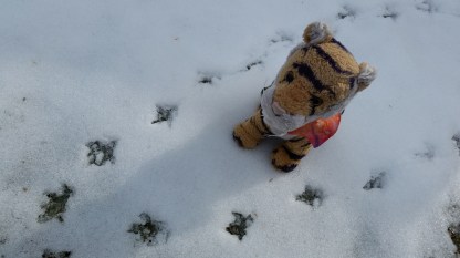 With all the snow it is easy to see animal tracks! Here is a picture from the backyard with animal tracks in the snow I think they are TIGER tracks!