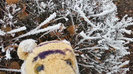 It has been very cold and very foggy in the mornings. There is so much fog that the moisture freezes on all the plants and makes interesting designs like this shrub.