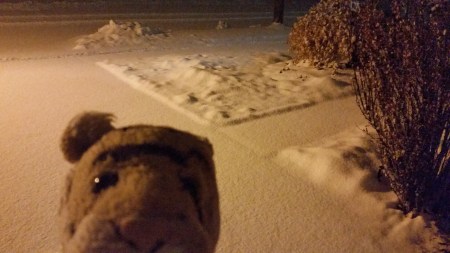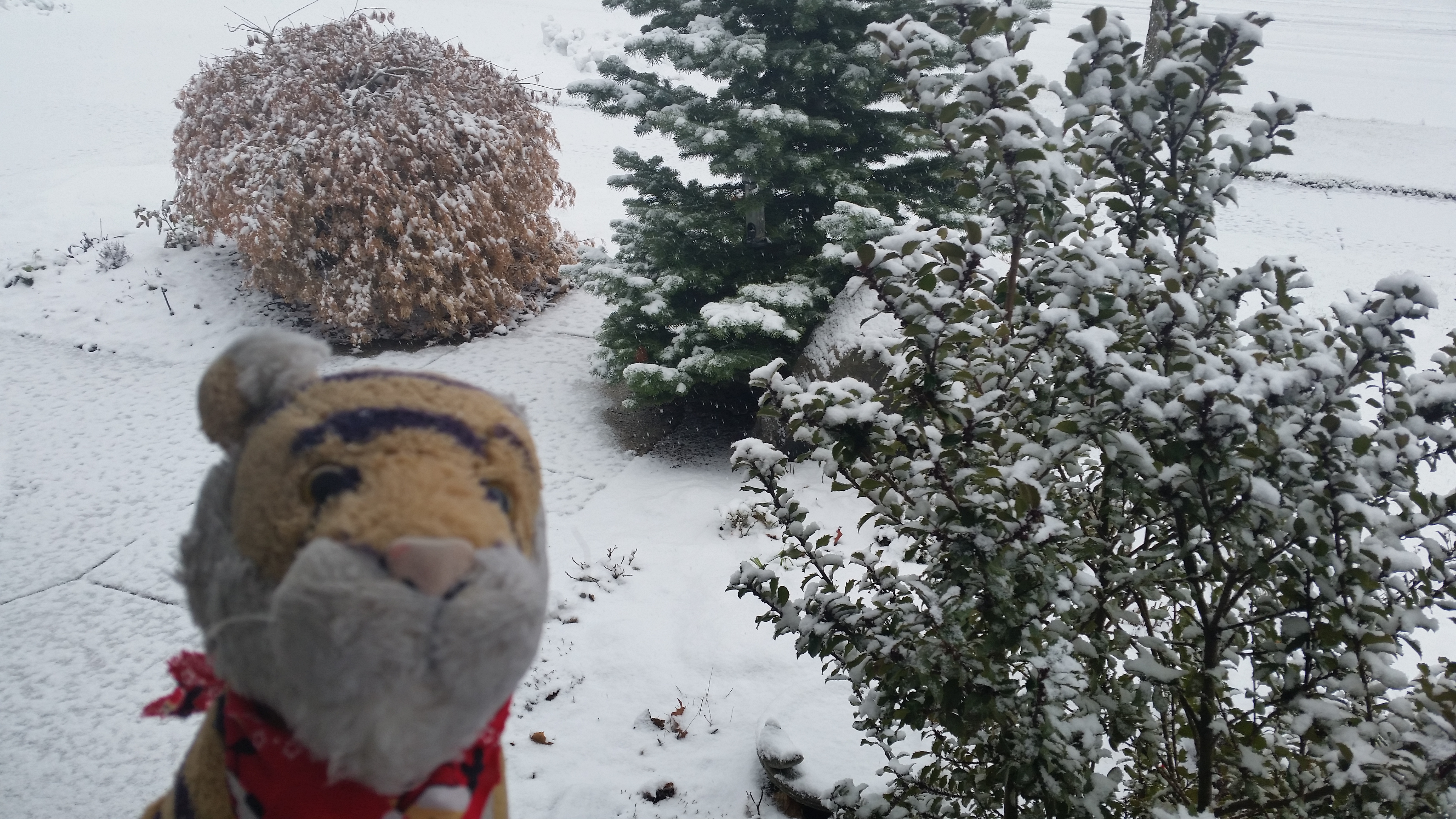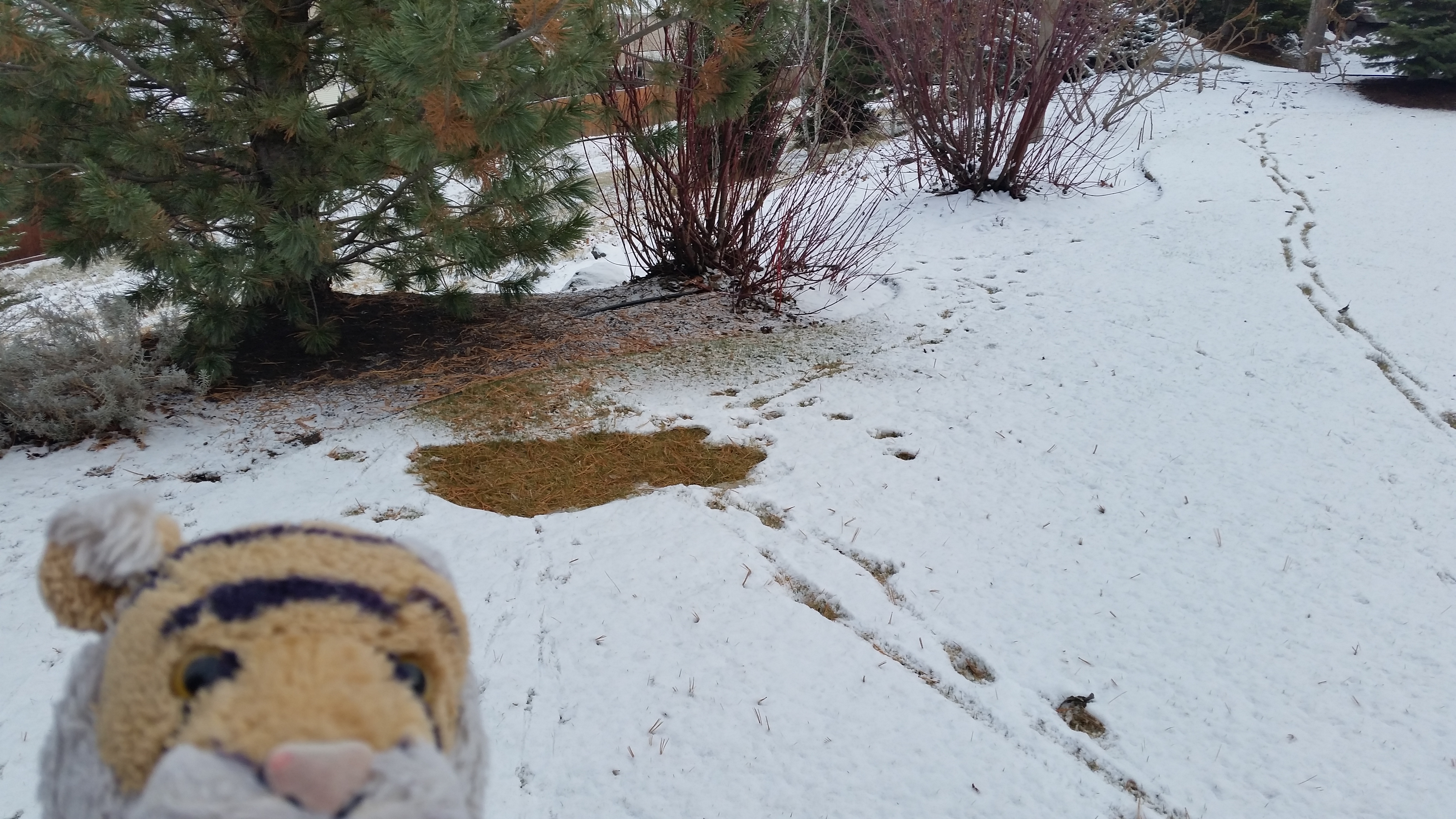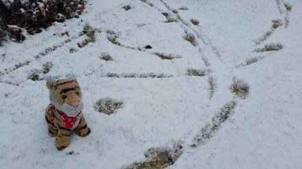 Then it snowed and a large animal has left tracks in our yard!
