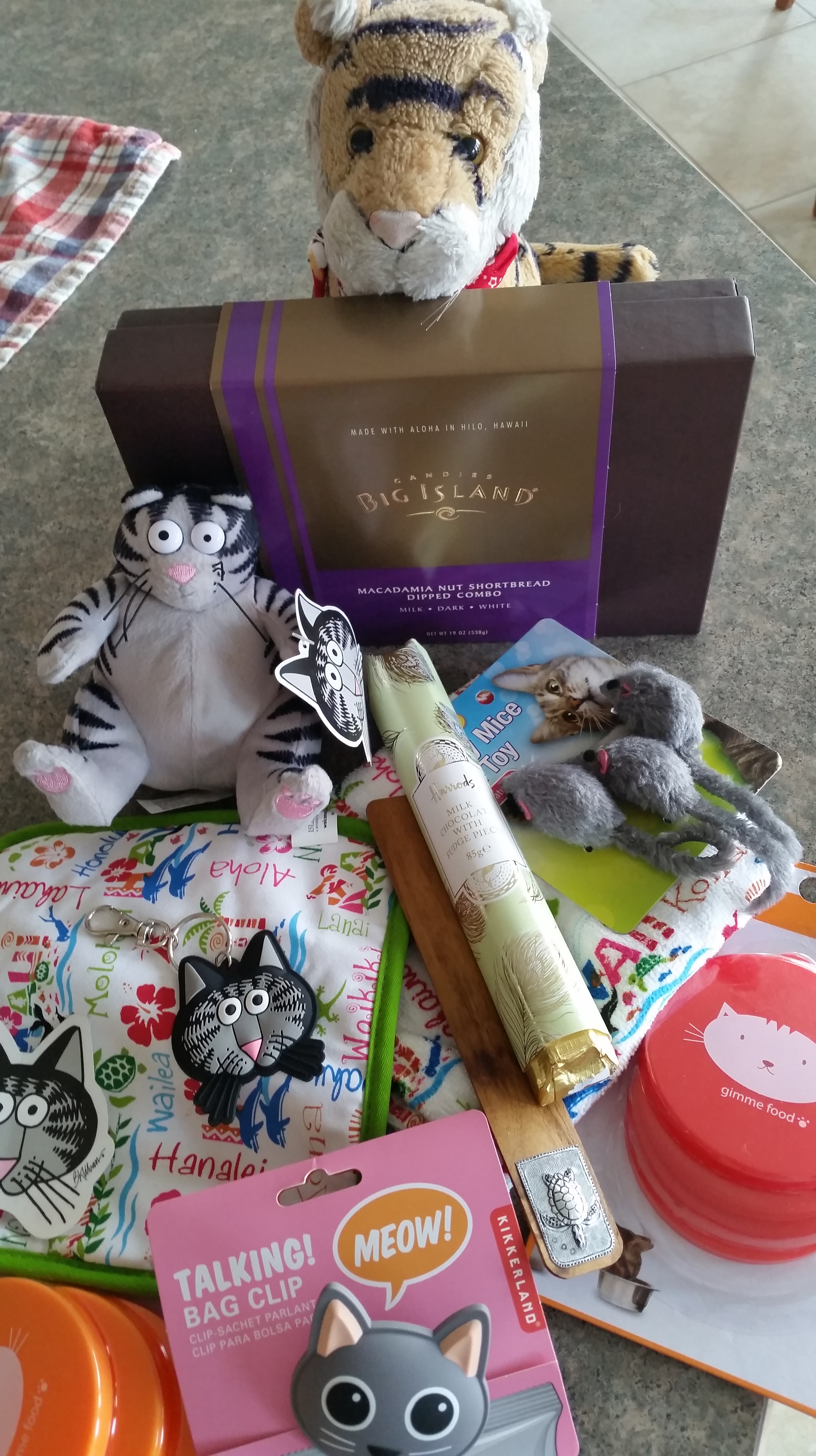 It was Christmas last week too and Auntie Darcy sent us a big box fill of awesome goodies including macadamia nut cookies from Hawaii and Nicolyn sent a chocolate bar from the famous Harrod’s store in Europe which she visited recently. Plus lots of other good stuff like a cat bag clip that meows. Thanks you guys! Merry Christmas!