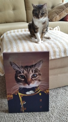 Mom ordered a special portrait of our cat Kosha. You send in a photo and pick out the design you want and Crown & Paw sends back an awesome portrait that looks like a painting! Here is a picture of Kosha with his portrait! I told mom we should get one for all the cats and she said that would cost a lot and I said well what about just for me?