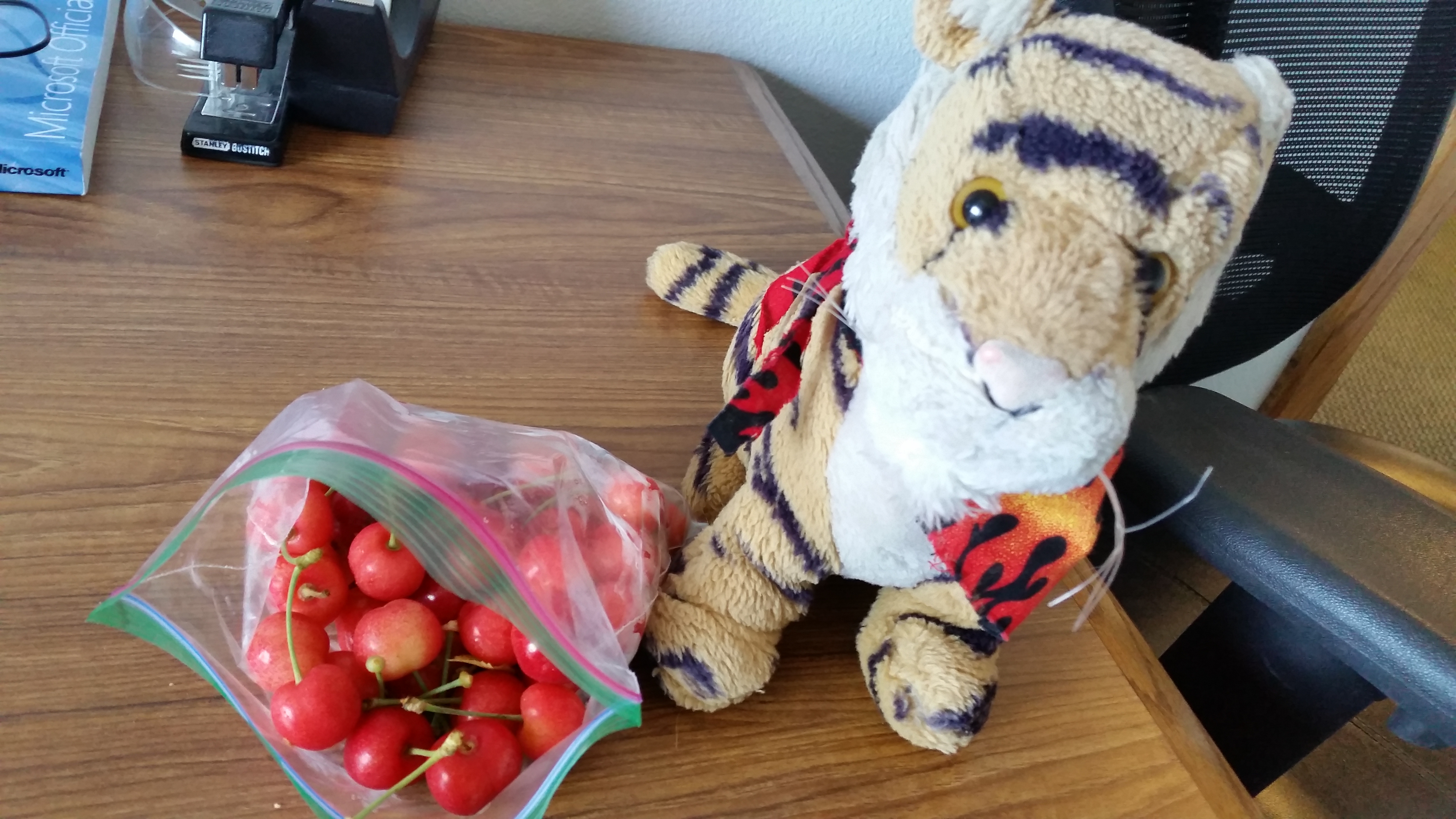 At work David brought fresh cherries from trees in his yard Tigers LOVE cherries!
