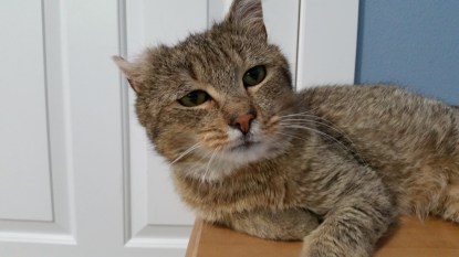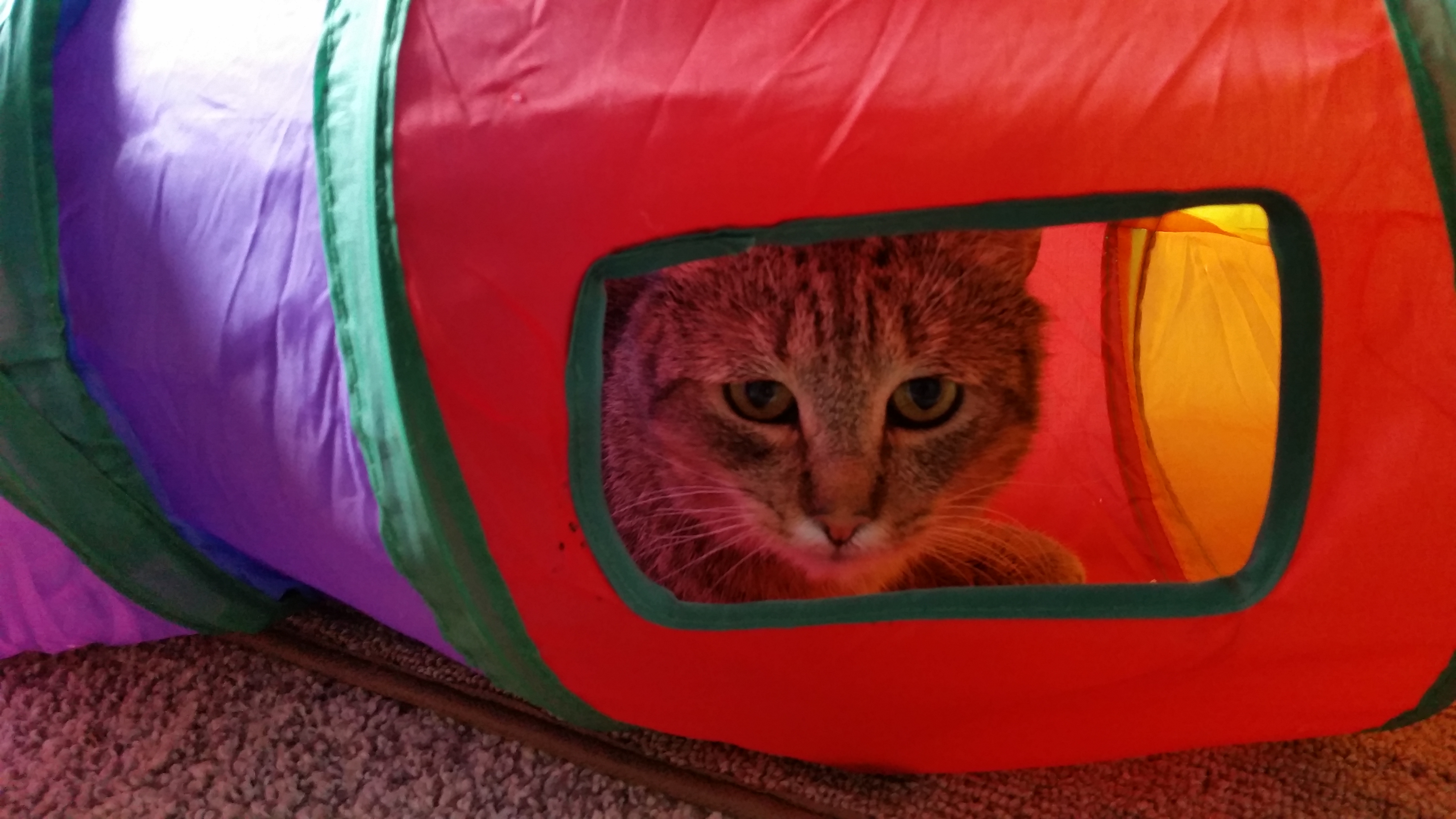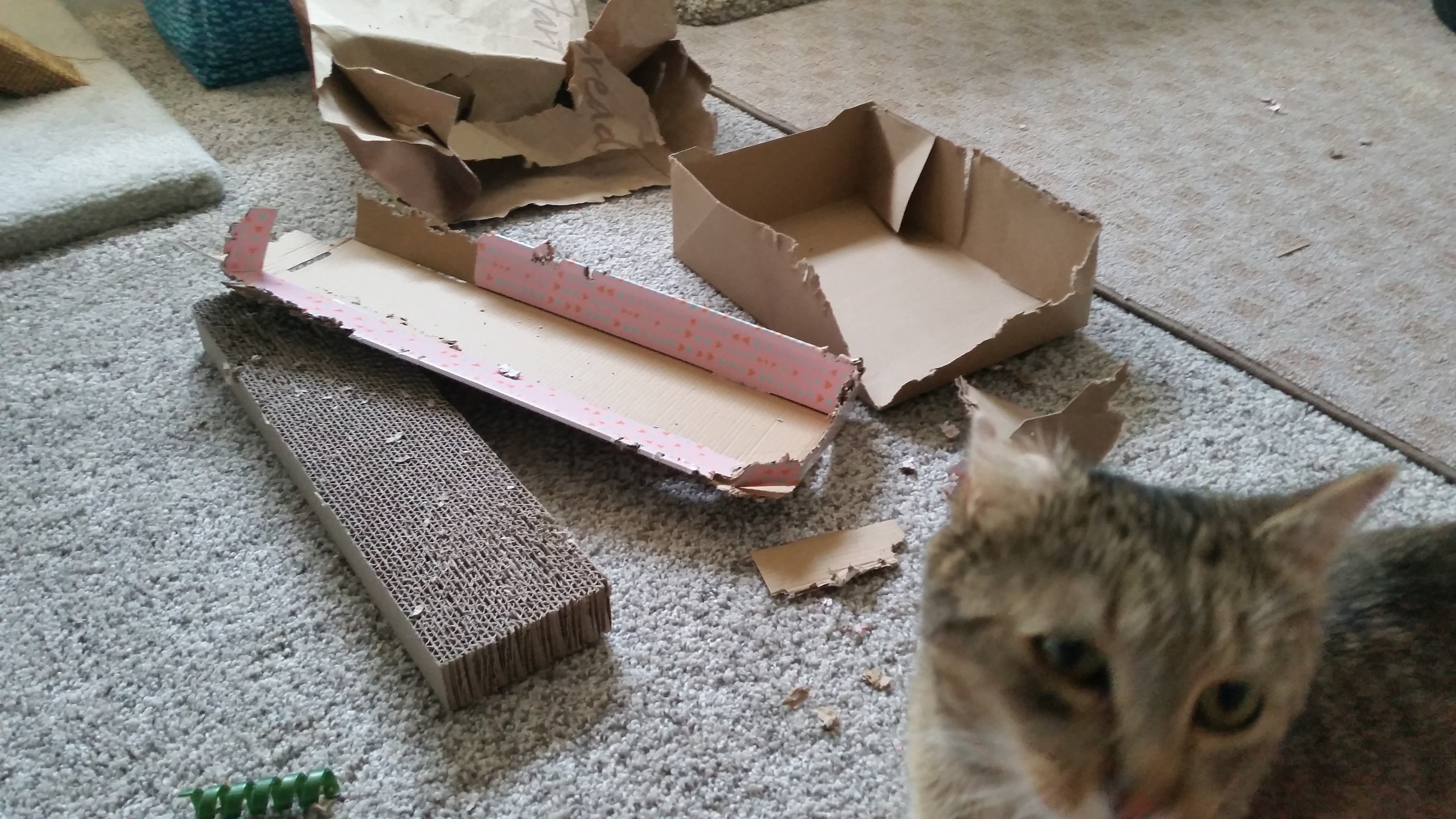 It is sad news today. Our beloved foster cat Dexter crossed the Rainbow Bridge. Here is a picture of him with his favorite chewed up box and cardboard scratcher.