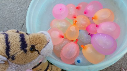Friday night was a birthday party for Korben and we had a neighborhood water balloon battle! It was great! We came prepared; here I am with our bucket of water balloons.