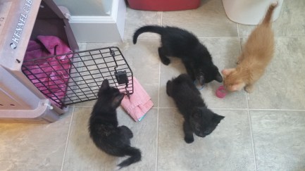 OMG the best thing ever happened! We picked up some foster kittens! We were waiting for another hospice kitty but the shelter has so many kittens that need foster we decided to take some. It is a momma cat who is very shy and her 4 kittens. They are about 5 weeks old and are doing great! They had been at the shelter for about 3 weeks so this was their Best Day Ever being able to run around and play in their own room!