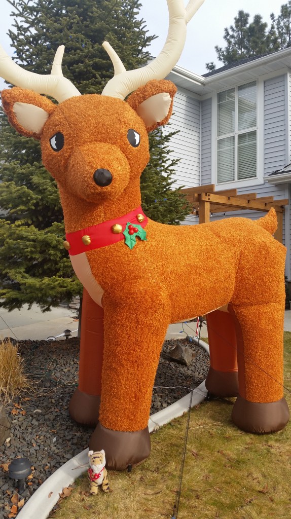 We took a walk through the neighborhood and saw this super amazing deer! It is ENORMOUS! You can barely see me by his front paw. I mean hoof.