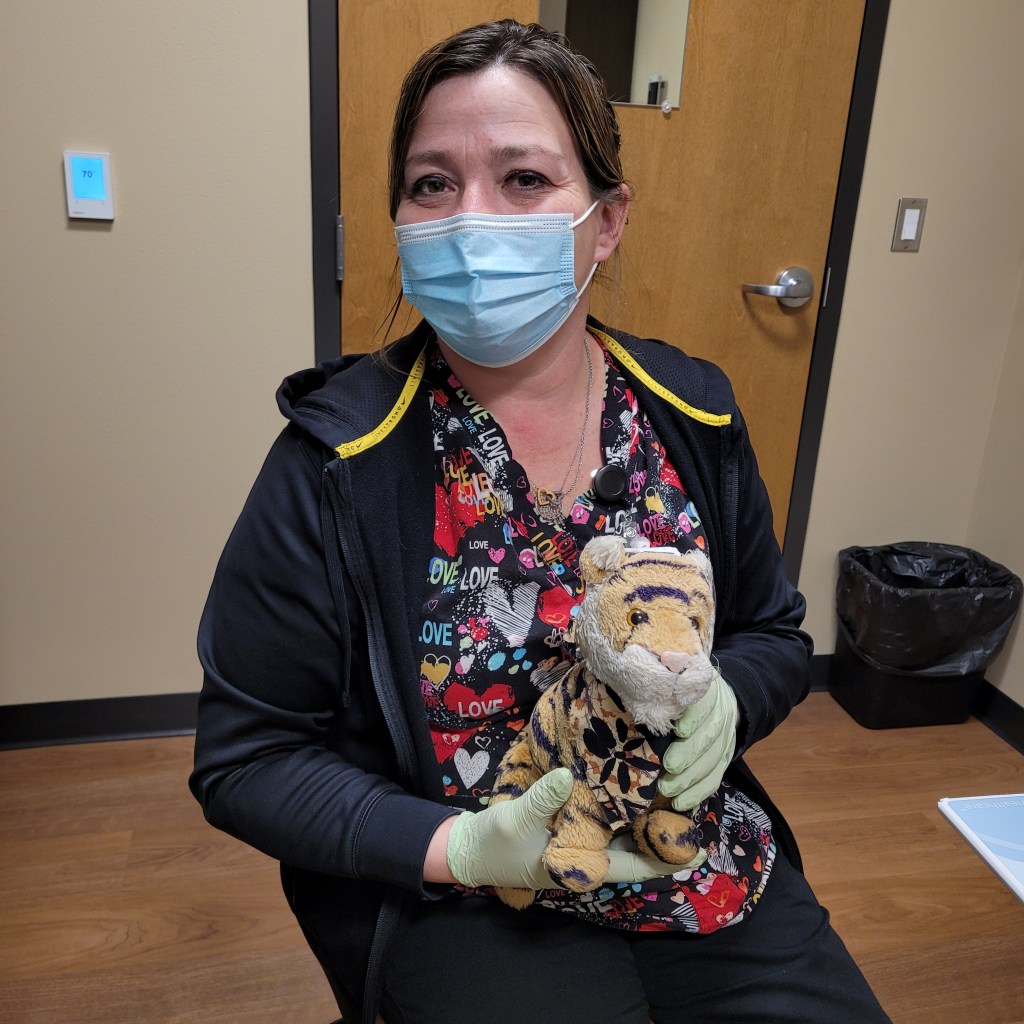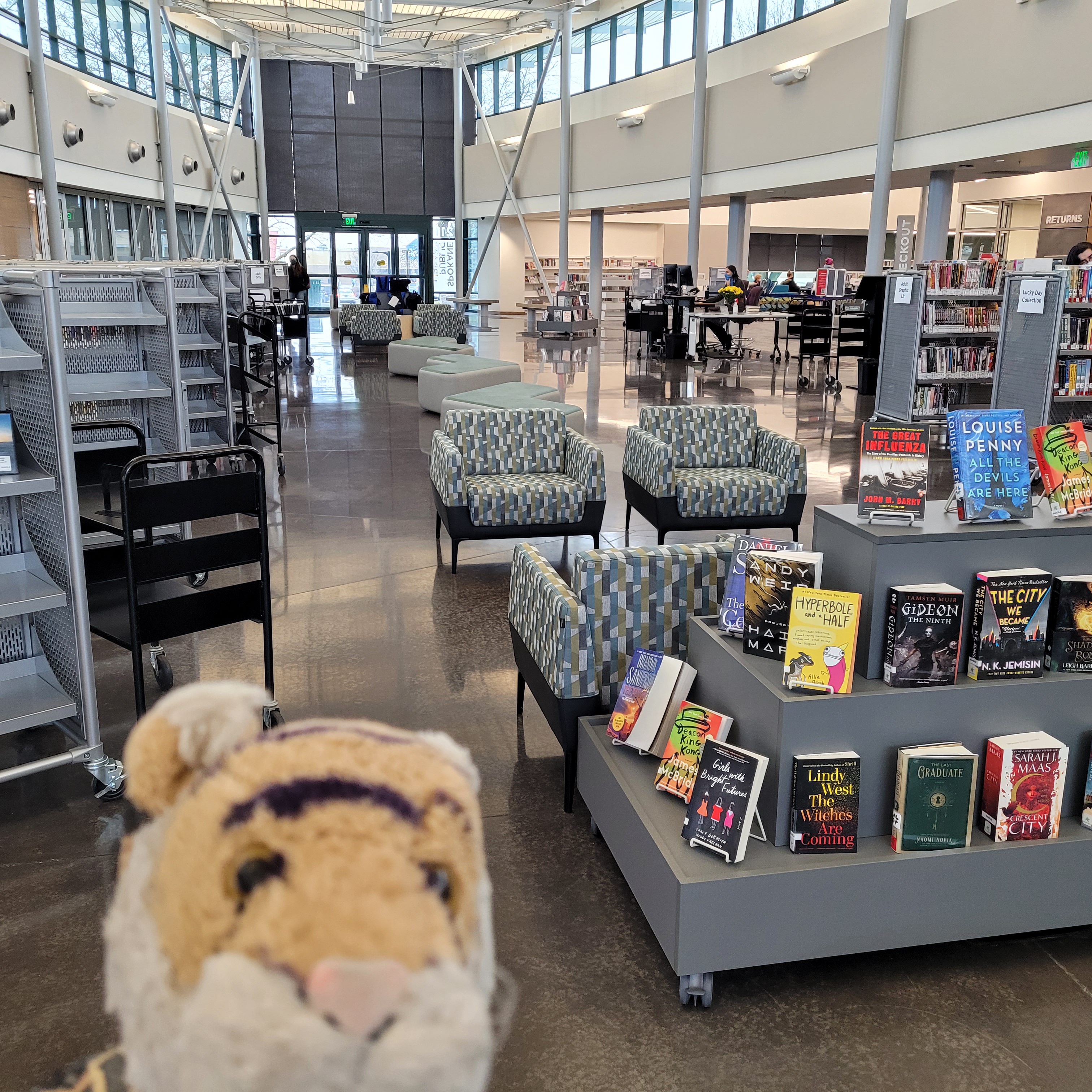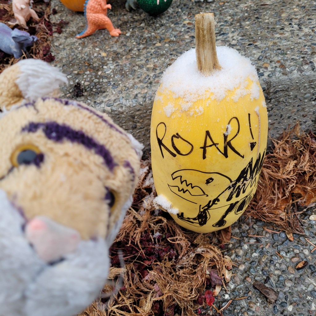 It snowed !!!! Yayyyy! But then it turned to rain mixed with snow and then it all melted. Here is a little snow on top of a spaghetti squash that we are using to decorate out front. At work our friend Kristi brought in home grown squashes and we brought this one home to cook but then we got busy and mom FORGOT about it. So then I suggested we draw a dinosaur on it.Here I am with John who came to do a checkup on our furnace and fireplace. He was super nice and handsome! He is measuring me with his multimeter ha ha ha! This is me with Lea one of the awesome nurses at the doctors office. She is so beauuuutiful !!! mom had to get a flu shot so her arm was a little sore the next day.Our favorite library is closed for renovation so we went to a different library that was recently remodeled. It is very bland and cold looking, except for a play area in the kids section. I guess it is supposed to be modern looking. it is okay; we are always thrilled to have public libraries where we can borrow books for free!