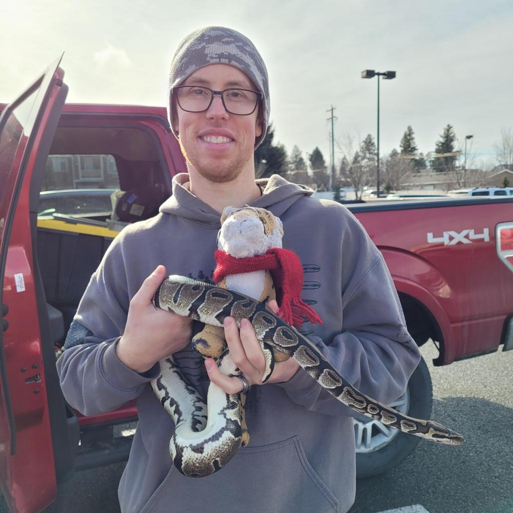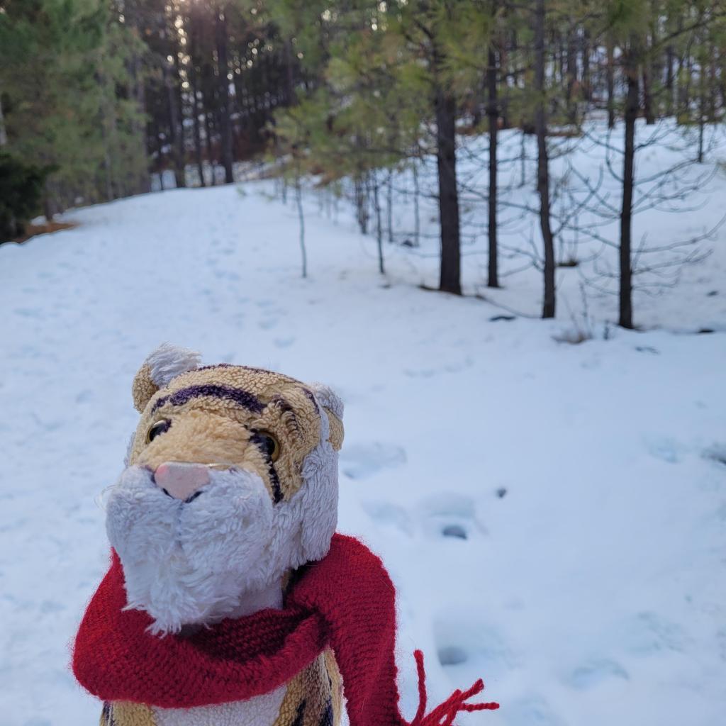 OMG the most amazing thing happened!!!! We were doing shopping errands and were parked next to a family who had SNAKES with them and they were handling them! OMG! We chatted with them and they are amazing! They have a business educating people about snakes and this is me with Cody and a BALL PYTHON!!! They are native to Africa and are called ball pythons because when they are scared they tend to roll up into a ball. Mom says she likes that kind better than the kind that jump at you and bite you. I am a Tiger I was not scared. Wow we should totally get one of these but Mom said NO.It was sunny and above freezing this weekend so we went for a walk. A lot of snow has melted but the trails through the woods still have snow.We saw some animal tracks! These may be Tiger tracks! We did not see any snake tracks, it is too cold for snakes to be moving around outside, they must be hibernating. Mom says that’s good.