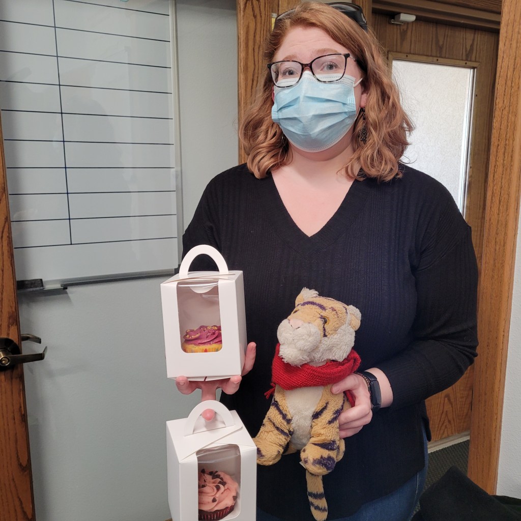 For Valentine’s Day at work Kristi made cookies! But mom FORGOT me at home that day!!! So I am not in the picture. Mom says I do not have to be in every photo and that is true.Rowan also brought in some amazing home baked goodies for Valentine’s Day. Of all the days to leave me at home! Mom should remember to take me to work on all major holidays.Mom donated blood this weekend and here is Jessica who works at the donation center. Jessica is super beautiful and nice and she was also hilarious and kept mom laughing the whole time.The moose were in the greenbelt behind our house this morning and then later our neighbor Mitch knocked on the door to tell us the moose were across the street! They were practically ringing the doorbell at Jonathan’s house! Later they climbed up the hill and spent the day hanging out there.