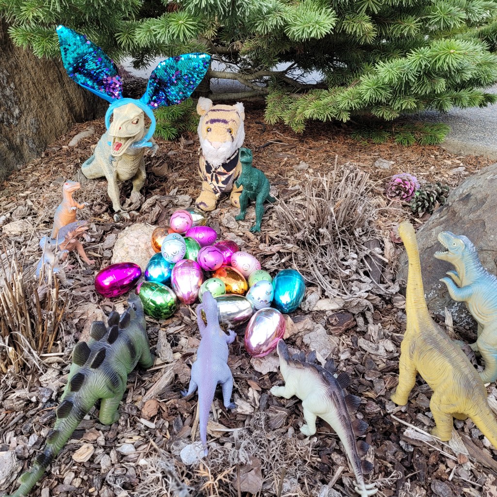 The dinosaurs are all ready for Easter. We were doing yardwork today and lots of people out walking stopped by to say how much they enjoy the dinos.