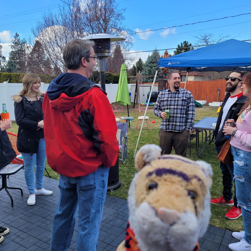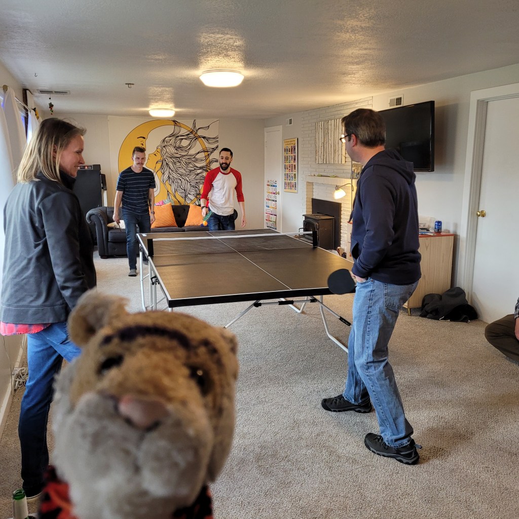 Lacey organized a surprise birthday party for David but after a while it was not a surprise so David was able to invite even more people to his surprise party. It was a windy chilly day so some people gathered around a heater outside to drink their cold beverages! Here we are in the basement playing ping pong! This game it was Emily and Warren on one team and David and Jeffrey on the other. Everyone had such a good time! It is nice to be able to get together again.David is an Engineer and is so good at designing and building things! Here is a slide he made for the kids inside the house! But adults and Tigers can use it too!OMG! The most amazing thing happened! Our friend Thuan at work GAVE us this robot! You mount it on a ping pong table and it shoots out balls at you so you can practice! It has settings for backspin and frontspin and everything! Now we have to get a ping pong table!!!