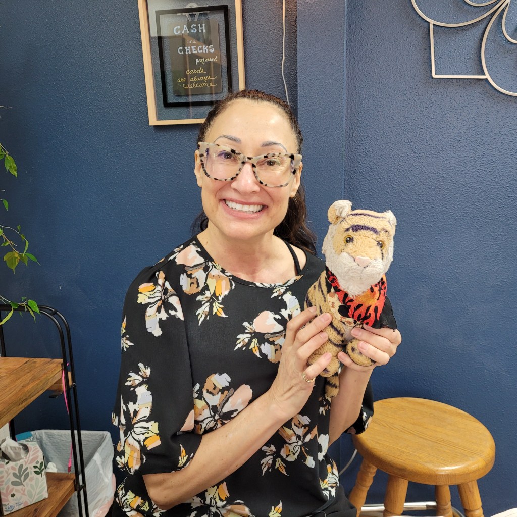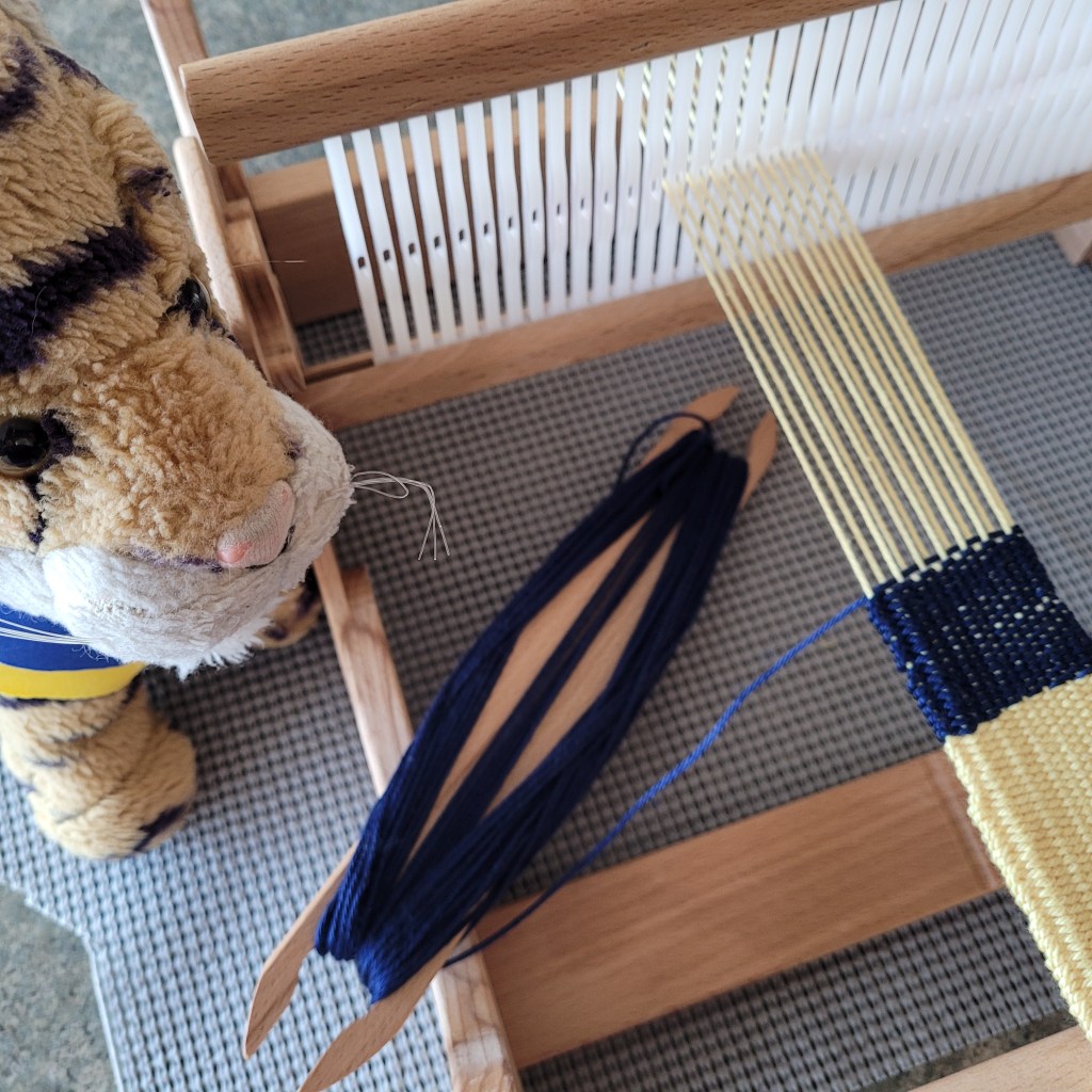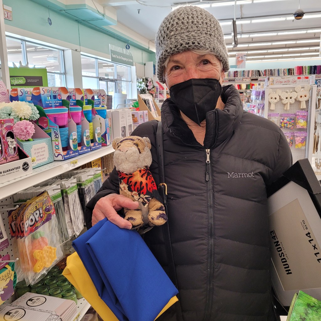 It has been hard to read the news about Ukraine. Mom says even if it is sad it is important to know what is going on in the world and bear witness. I wanted to do something to show my support for the people (and Tigers) in Ukraine so mom made me a new bandana in the colors of the Ukraine flag.When we were at the store picking out fabric for the bandana we met Kay!! She was also carrying bolts of fabric in blue and yellow and she and mom starting talking and comparing fabric colors. We all agreed that the yellow color Kay had was the best and mom’s blue was the best so we ended up in line together and bought the same fabric! Kay is going to make some flags to hang where she lives. That is an awesome idea! Kay was super nice and super beautiful.Mom tried to figure out how to make a bandana for herself but decided instead to use the loom to make a sort of necktie. We happened to have yellow and blue yarn and the colors aren’t quite right but we are going to see how it turns out.Mom needed a haircut really badly and here I am with Paula at the Blue Harmony Salon! Paula was so nice and knowledgeable and totally gorgeous and the salon is really nice. Mom’s hair looks much better now!!