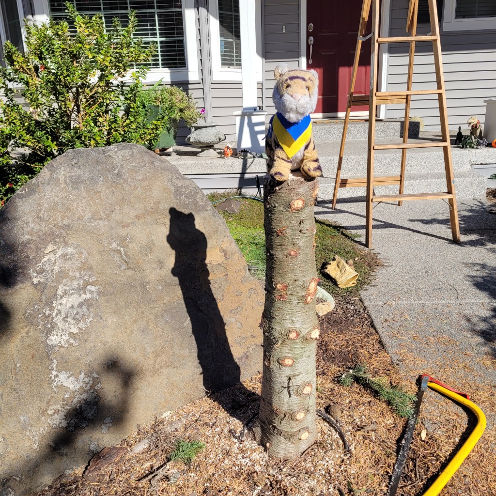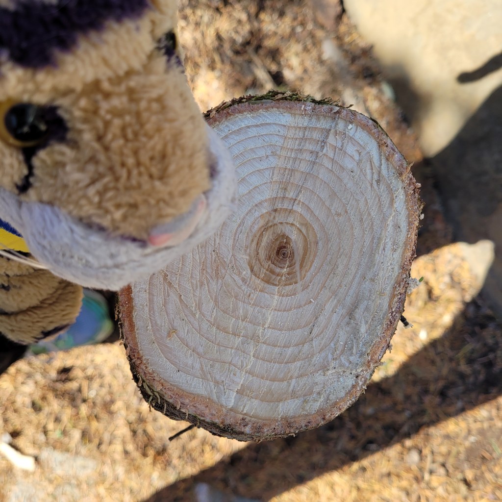 We were very busy yesterday! First we cut down this spruce tree. It was SAD! I know! It is a beautiful tree! But it was going to get 2 or 3 times as large and it is not in a good place next to the sidewalk.We left part of the trunk and mom spent a lot of time making it level. We’ve been working on setting up a Little Free Library and we mounted a platform on the tree trunk and then secured the LFL to it. This is where the careful leveling paid off! Our awesome neighbor Margo came over to help and she also brought some children’s books for the library! Then today her husband Steve came over with his power tools and strong hands and put in longer screws and also countersunk them so it looks nicer and is super sturdy. We have the best neighbors!!!If it is true that every tree ring equals a year then this tree was about 13 years old. We will miss the tree but we are honoring its memory by using it for the Library.
